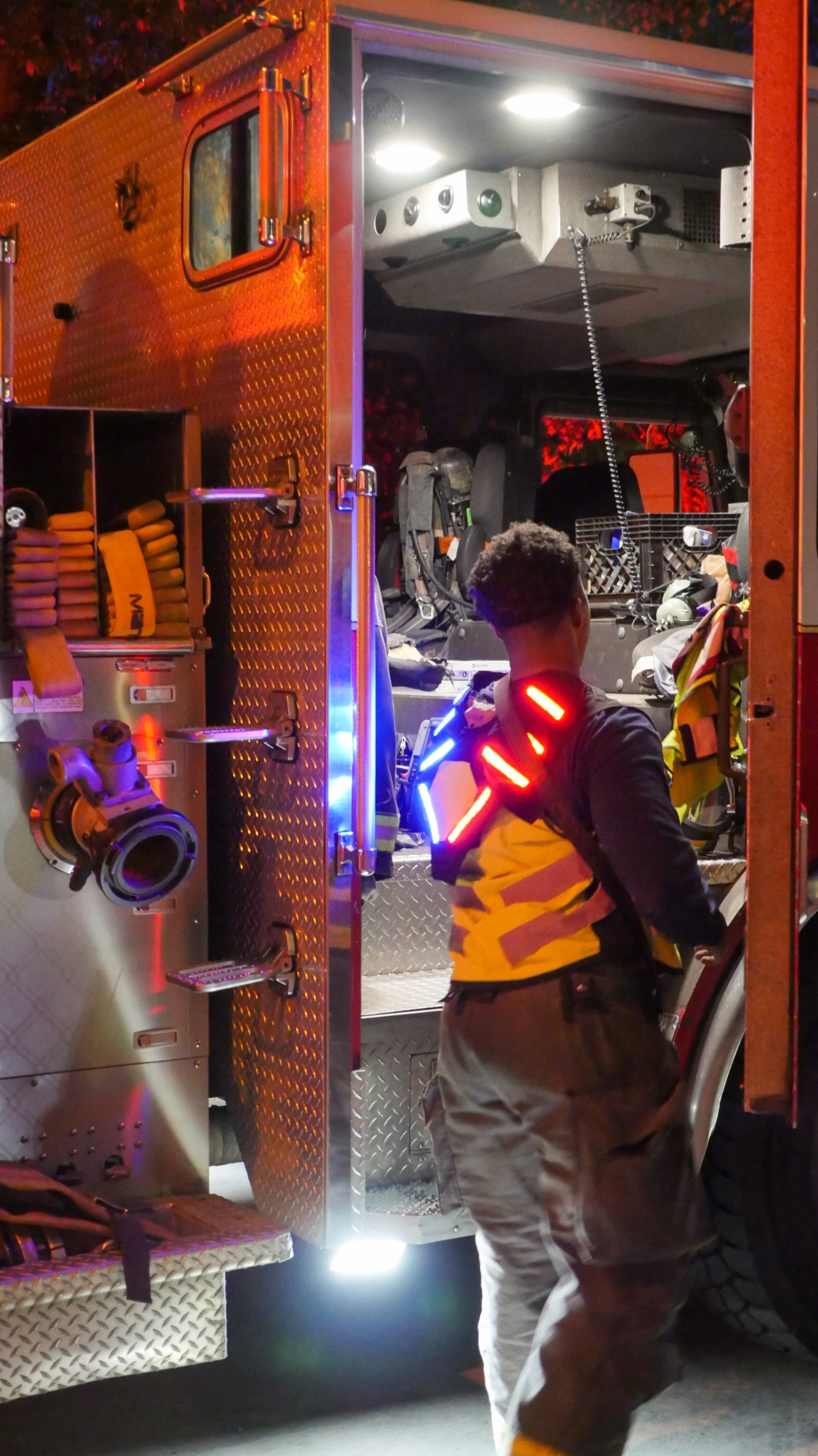 Nightflare's design is adaptable to various emergency situations and agencies. Its versatility means that agencies can invest in a single, high-quality safety vest that meets a range of needs, reducing the need for multiple specialized products. The LED unit within Nightflare is designed to be modular, allowing for potential future upgrades or replacements without the need to replace the entire vest. This feature extends the vest's useful life and reduces waste. Nightflare integrates energy-efficient LED technology that consumes significantly less power than traditional lighting sources. This not only prolongs the battery life of the vest but also reduces the overall energy consumption required for its operation. The vest features a rechargeable battery that can be charged using standard charging methods leading to the elimination of disposable batteries.