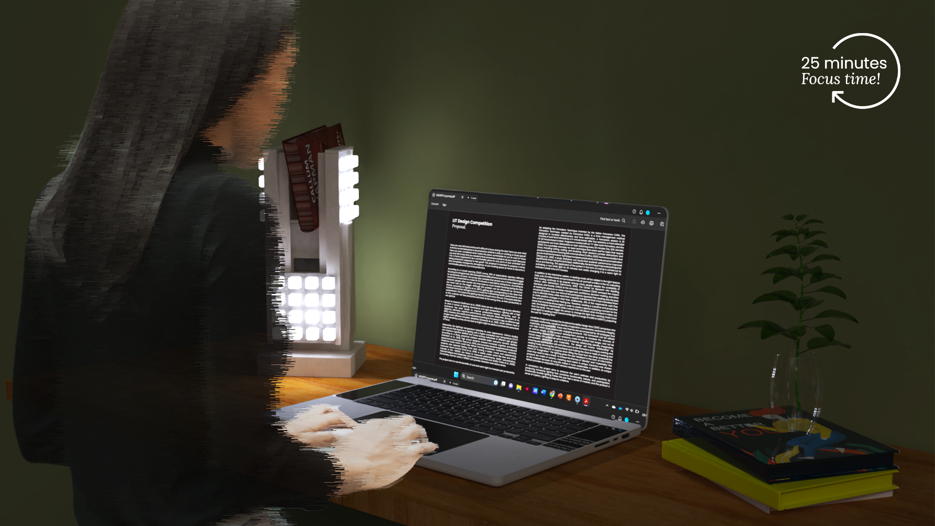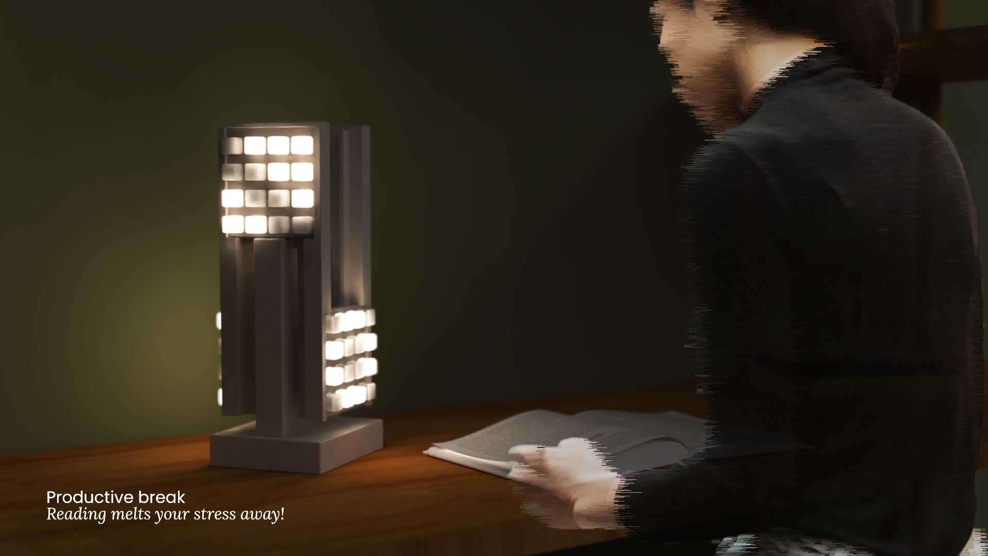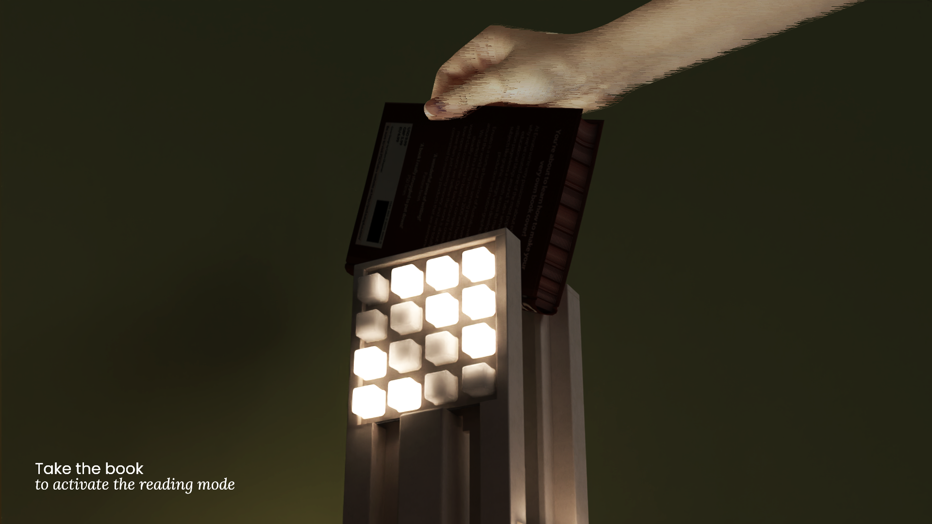 Hearth continues to interact with users personally and involve them in productive activities by utilizing two impactful components in lighting, namely illuminance and light temperature. The system incorporates the "Pomodoro Technique" by using cool white light for 25 minutes and switching to warm light for a 5-minute break. The lamp also promotes reading as a beneficial break activity in a fun and magical way. The sensor detects when a book is removed, triggering a switch to neutral white light for optimal reading conditions.