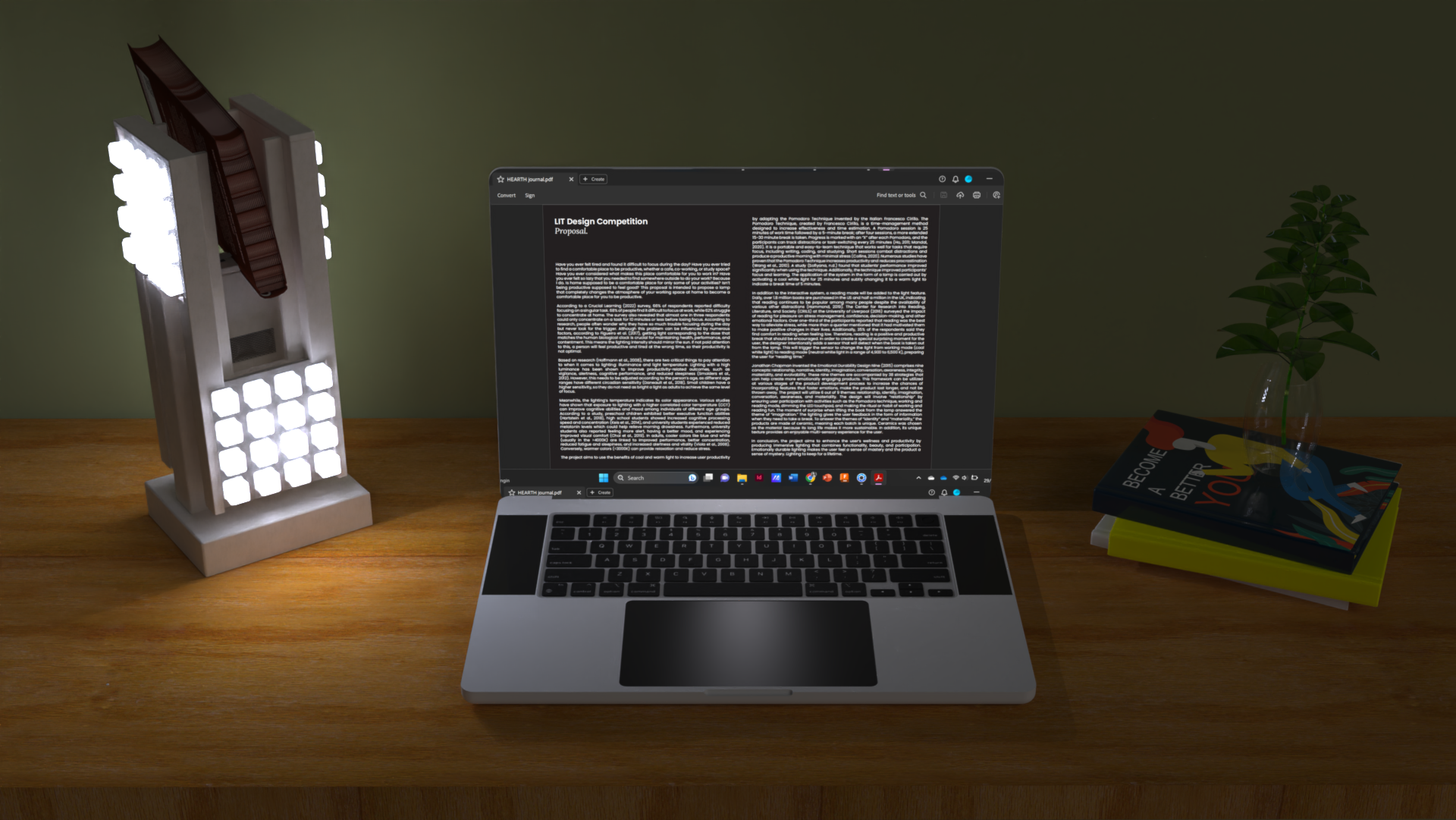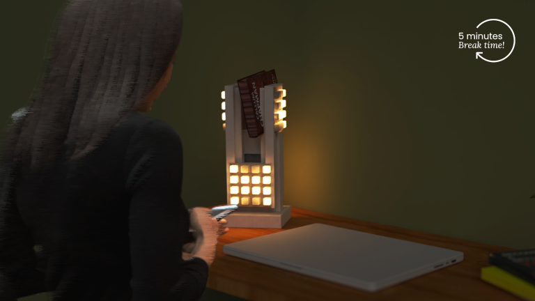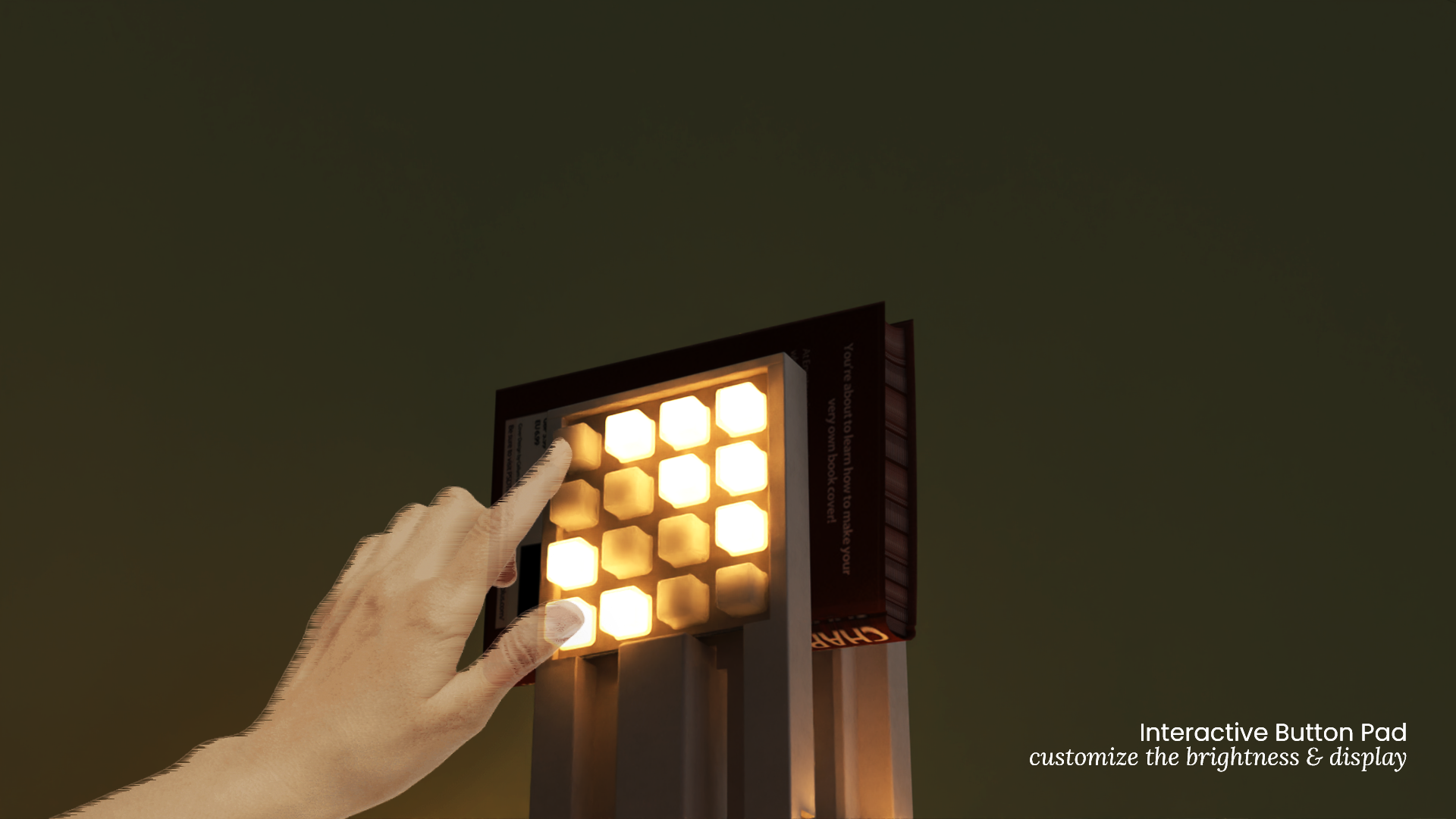 Hearth continues to interact with users personally and involve them in productive activities by utilizing two impactful components in lighting, namely illuminance and light temperature. The system incorporates the "Pomodoro Technique" by using cool white light for 25 minutes and switching to warm light for a 5-minute break. The lamp also promotes reading as a beneficial break activity in a fun and magical way. The sensor detects when a book is removed, triggering a switch to neutral white light for optimal reading conditions.