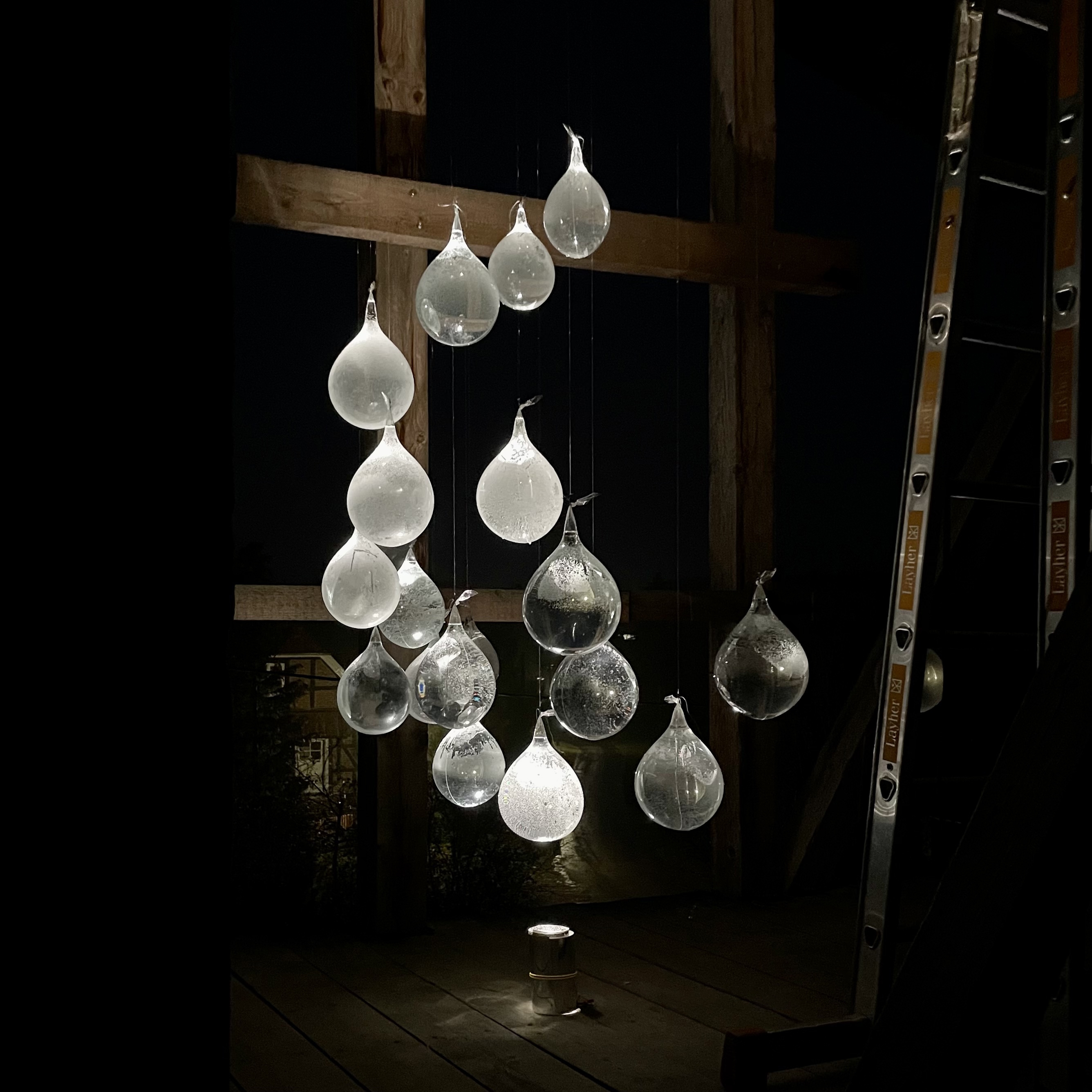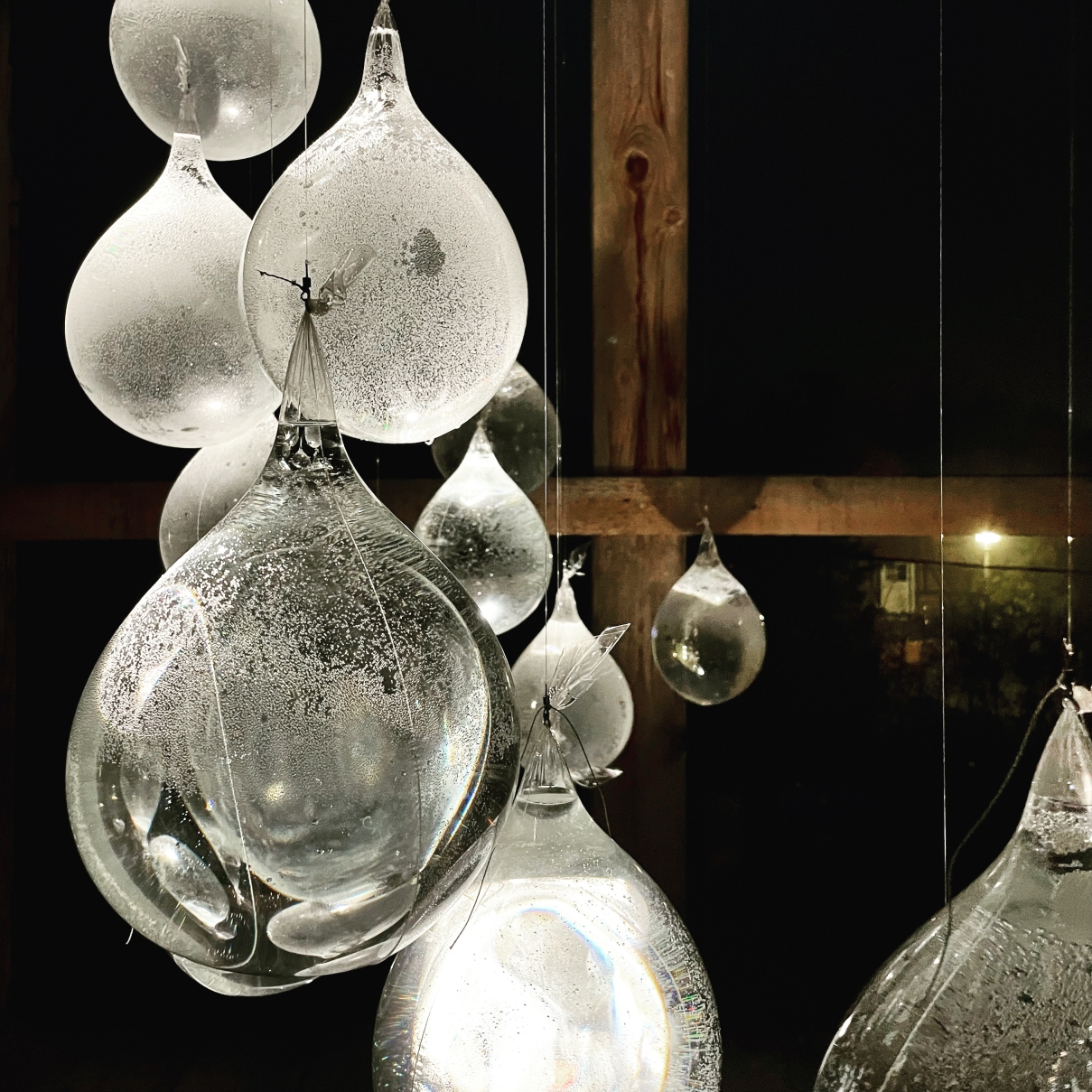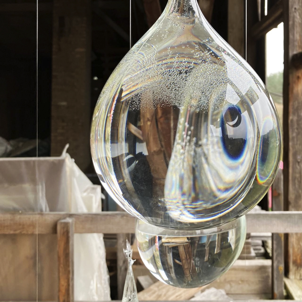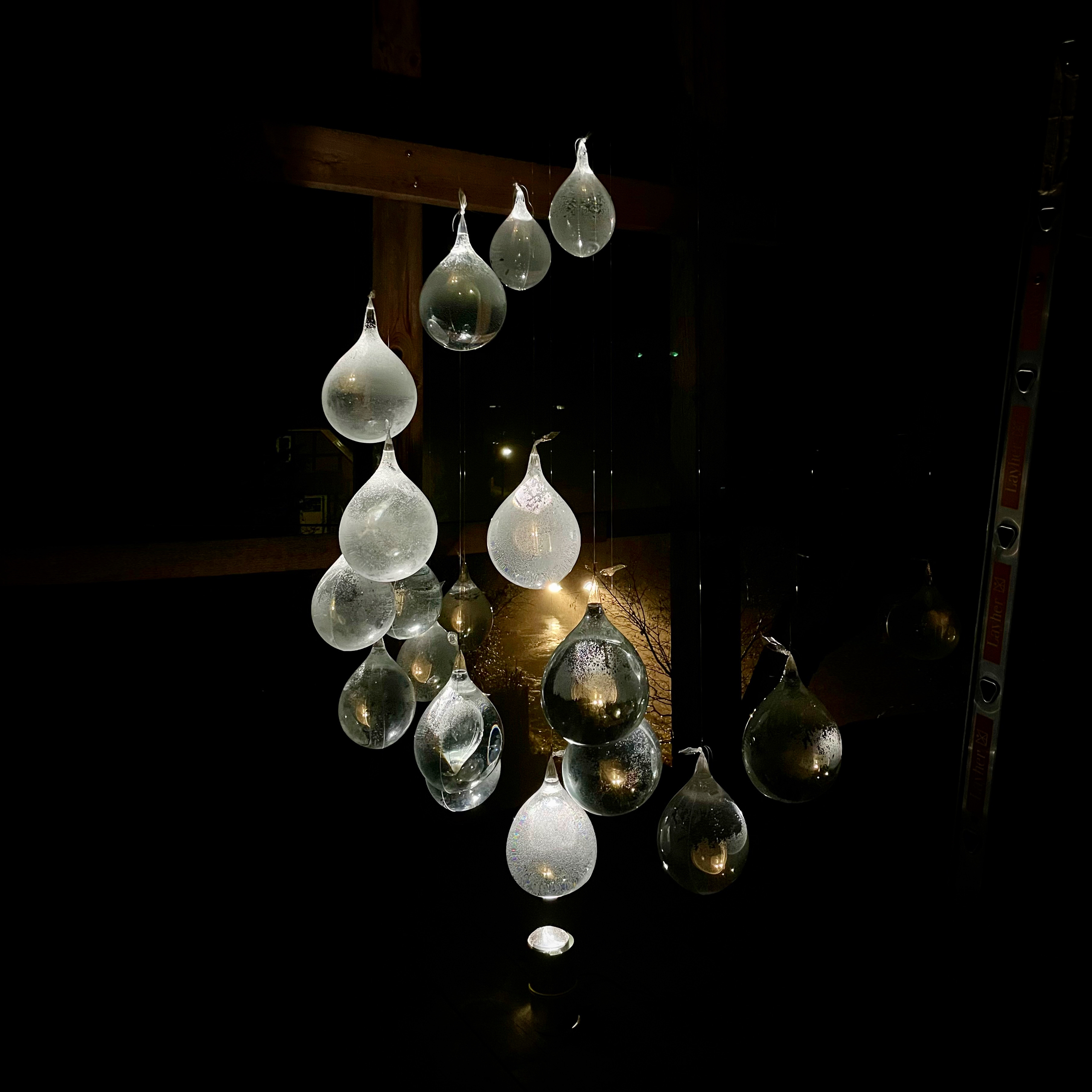Through this simple technique and utilizing one narrow beam up-lighting, the project attempted to graze and vivid the minuscule bubbles within the drops that appeared with the outer layer dew. Consequently, the artisan glass-blown lighting art installation yielded two markedly distinct experiences, viewable from both micro and macro perspectives.