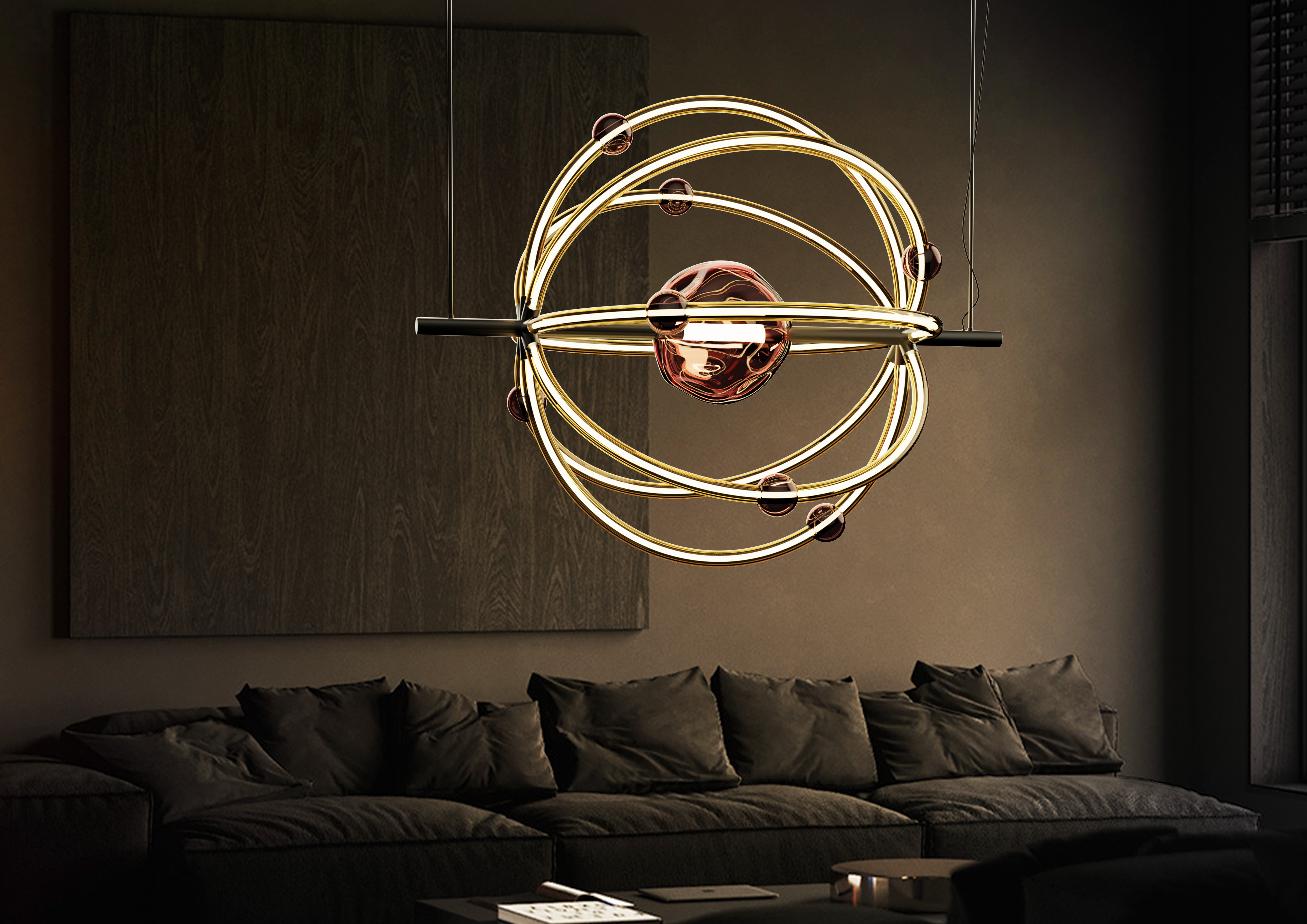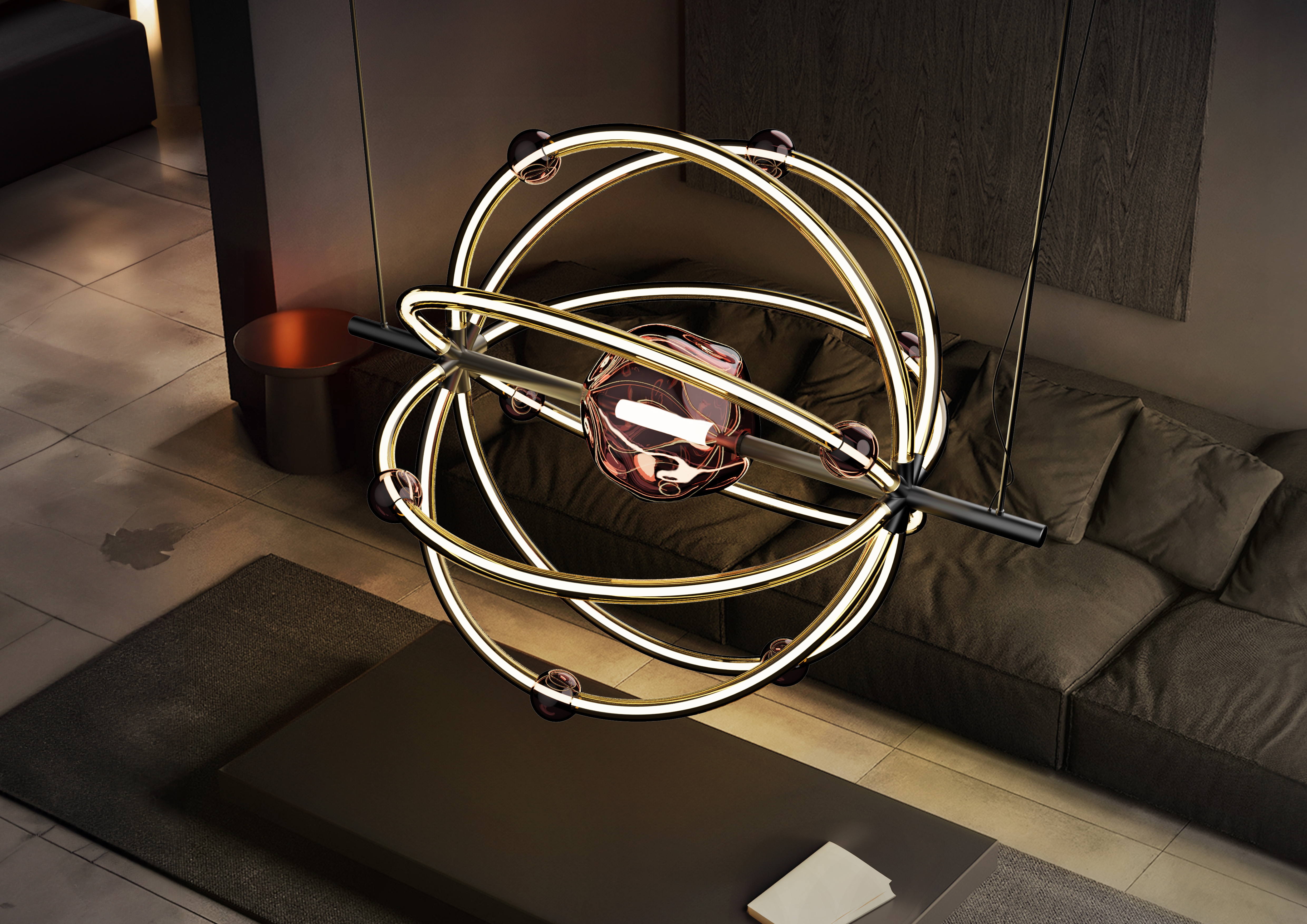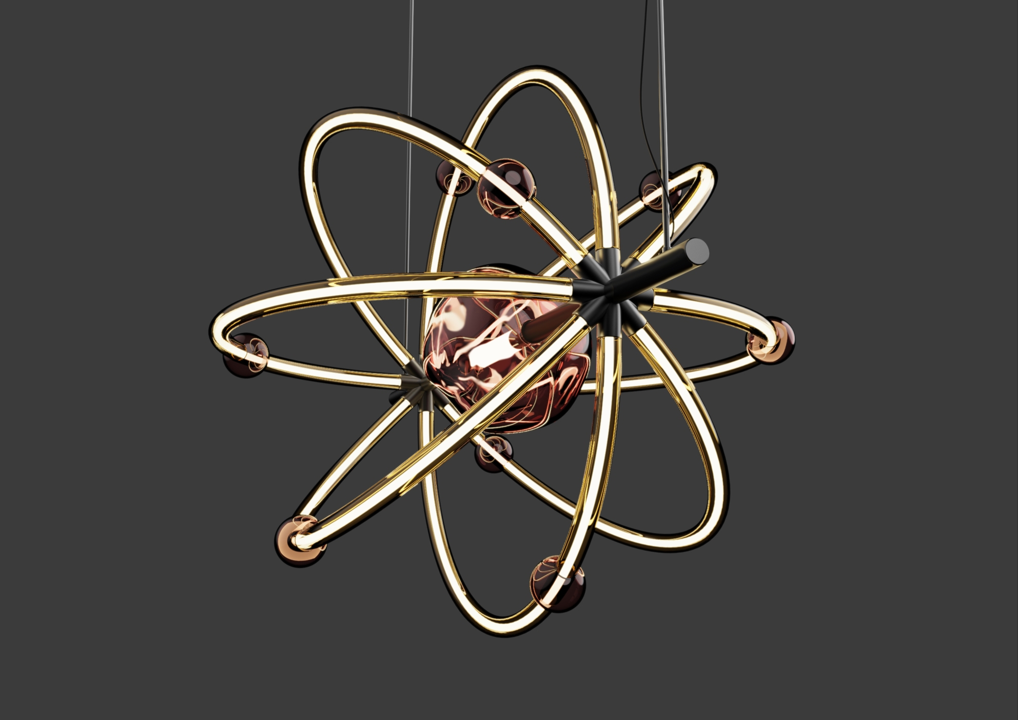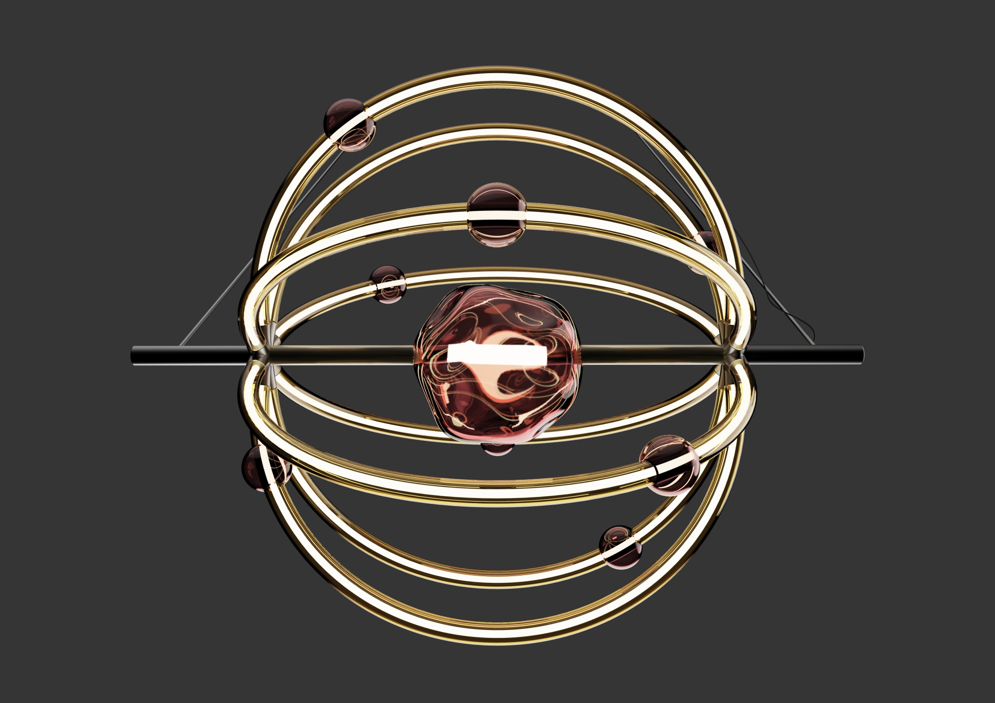 Entry DescriptionThis chandelier, inspired by the atom, seamlessly blends science and art. The central glass element serves as a symbolic representation of the atomic nucleus, emitting a soft and subdued glow. To establish an effective connection between the atom's behavior and the chandelier's design, the decision was made to represent the electron's motion within a specific orbit in a tangible way. This was achieved through the use of light enclosed within delicate glass tubes, effectively displaying the electron pathways within the chandelier's structure.