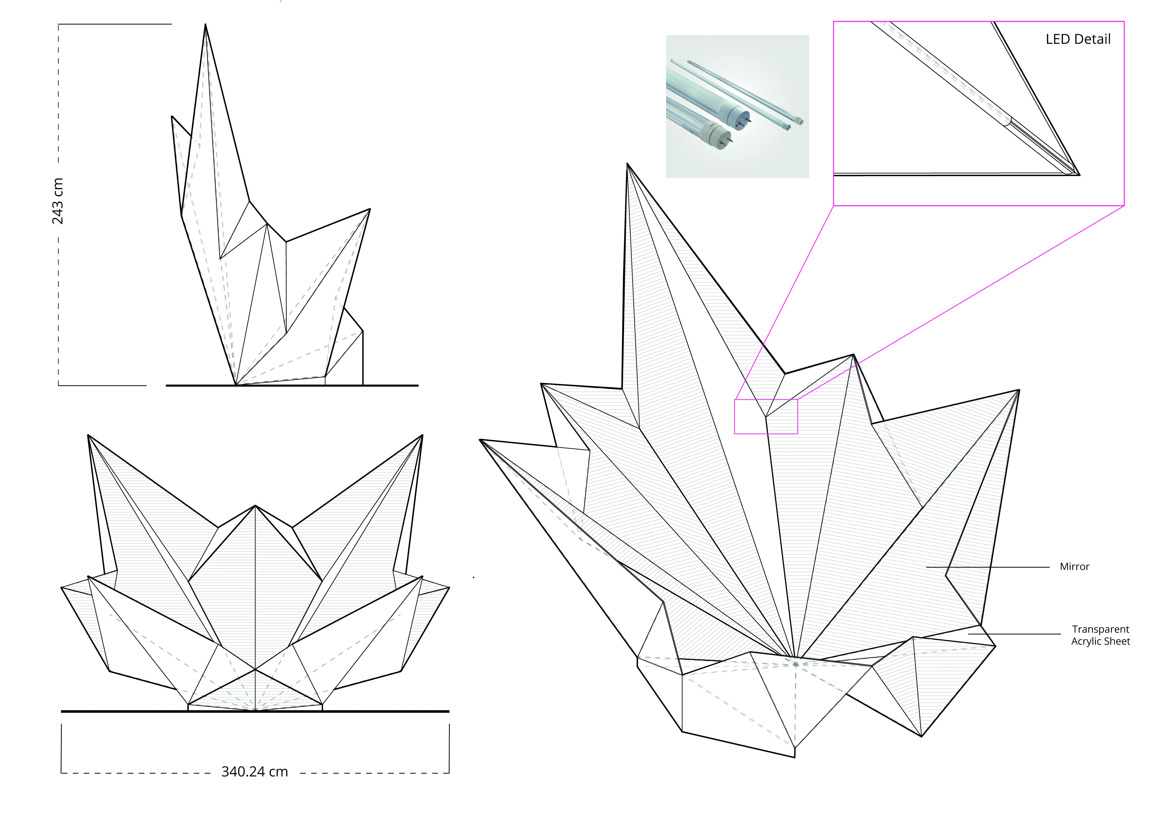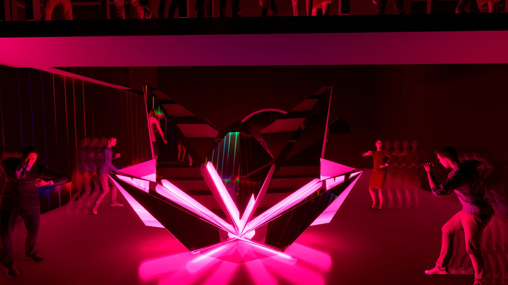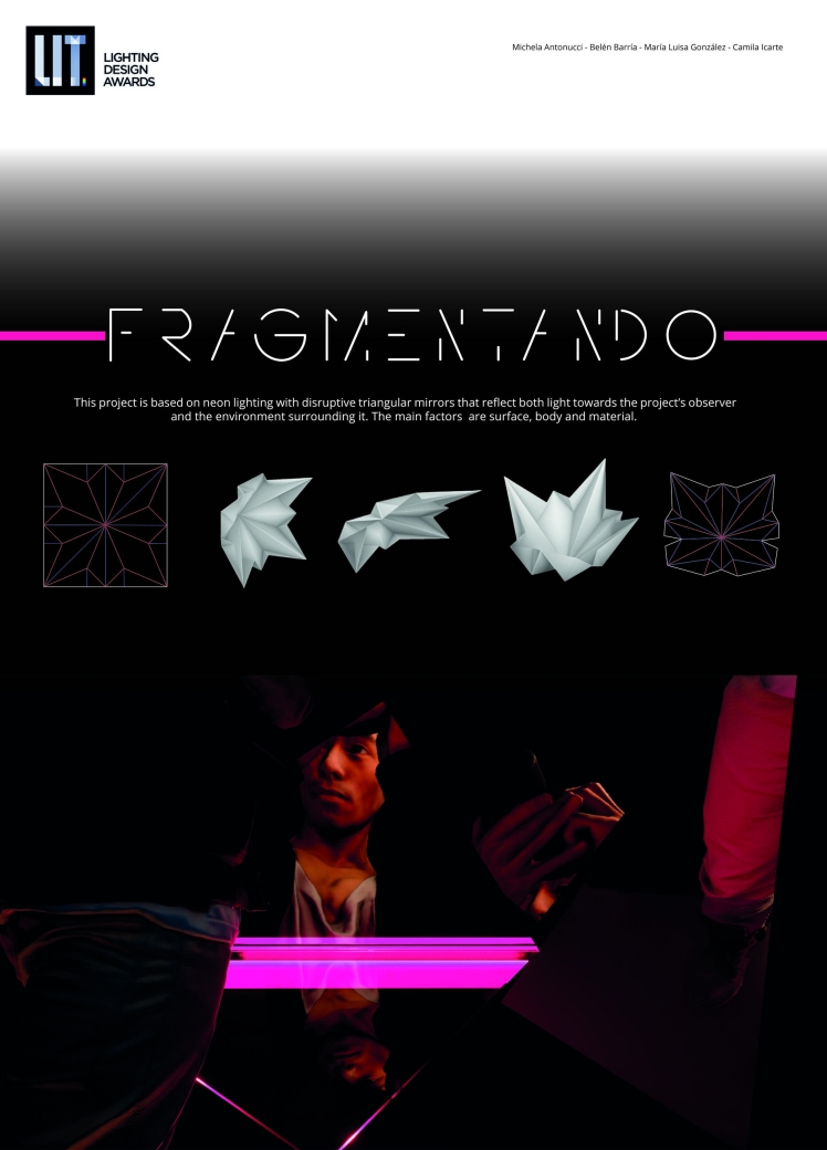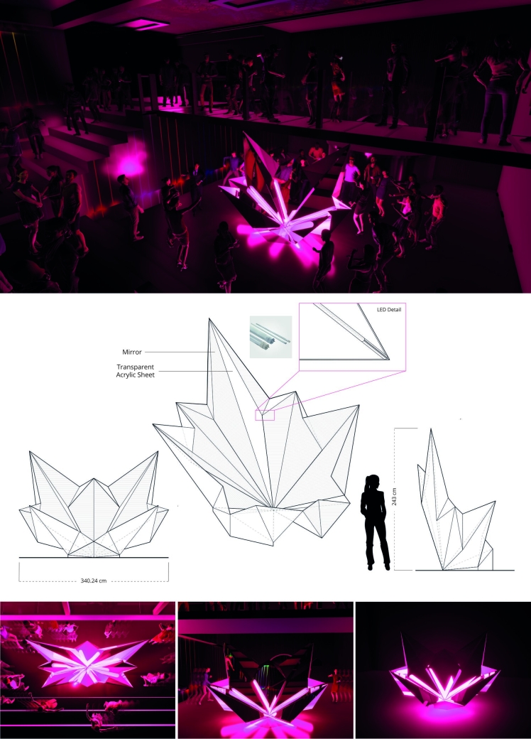 “Fragmentando” is an artistic light intervention designed for nightclubs. This object is designed to constantly change shapes and colors. It takes as its starting point the shapes and reflections created by shattered mirrors. From this basis, it seeks a way to fit the broken pieces together, which is how it arrives at the “frog base” origami, modified to adapt to the environment and the gaze of the observers. Made primarily of mirrors and transparent acrylics, it lacks its own color as its objective is to reflect and adapt to the tones of its surrounding environment. Its lights are formed by neon tubes whose color can be controlled.