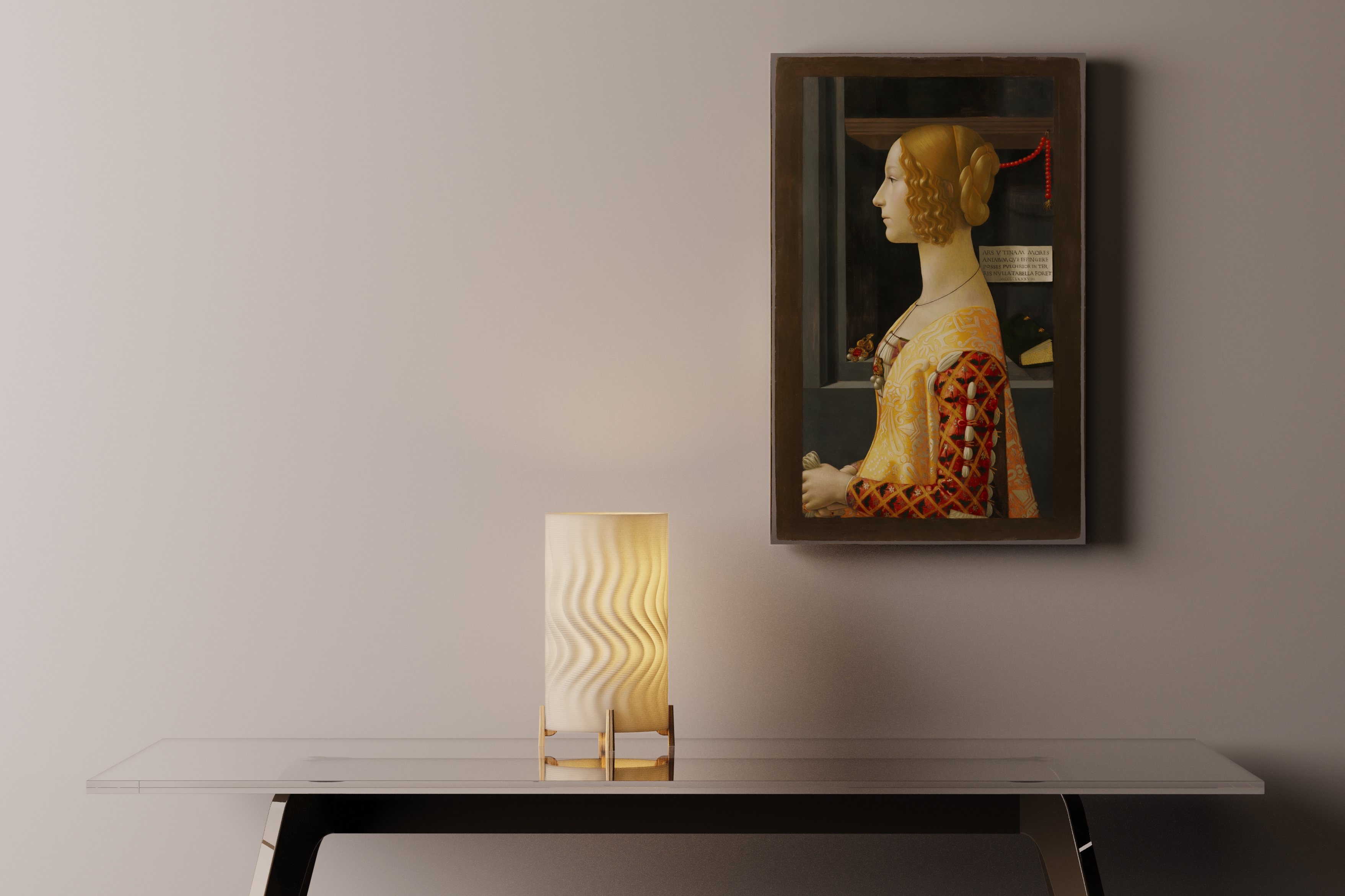 The surface of the piece, crafted by extruding hard-paste porcelain layer by layer through a fine nozzle, is reminiscent of the 'tratteggio' Italian painting technique, consisting of the superimposition of thin parallel strokes of pure colors to create texture and the illusion of light. The resulting wavy texture alludes to the golden curls of the woman portrayed in the painting. The piece is left uncoated to preserve the organic texture of the clay, its translucency, its capacity to absorb aromas, and its slightly ivory shades. The warm lighting colors emanating from the product draw inspiration from the color palette of the painting. All of these elements contribute to a sense of peace in the home.