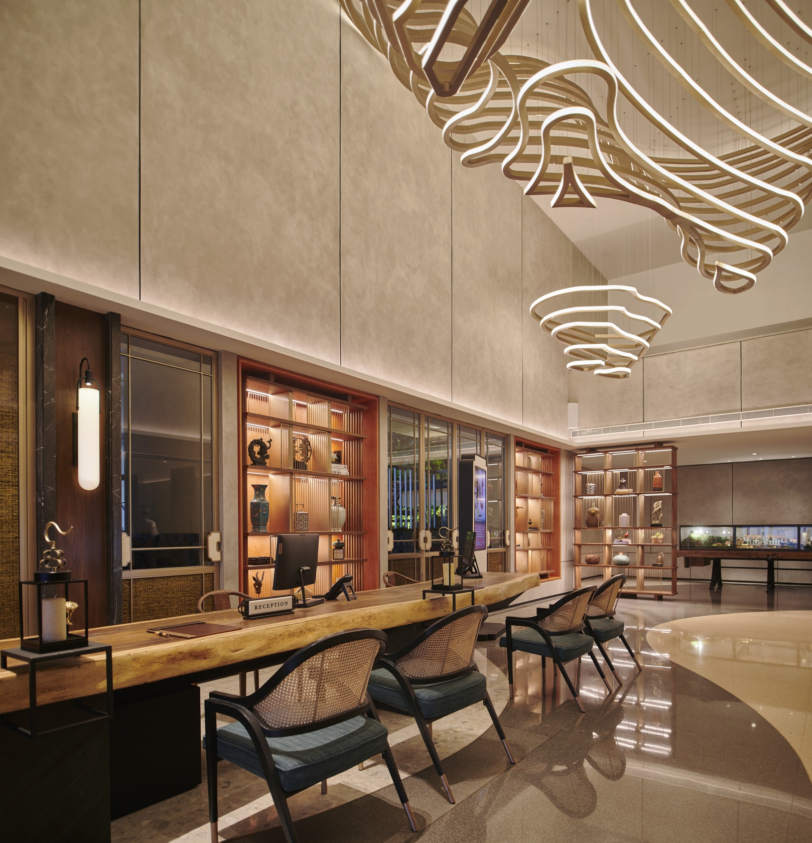 The lighting needed to respond to the interior design and enhance the focal points of interest, whilst being inviting and conveying a warm and welcoming ambience. By utilising ceiling coves, well integrated furniture oncealed lighting, we were able to add interest and focus to particular elements of the interior, with supplementary downlighting to highlight artwork, tables and points of interaction, such as the bar and check in desks.