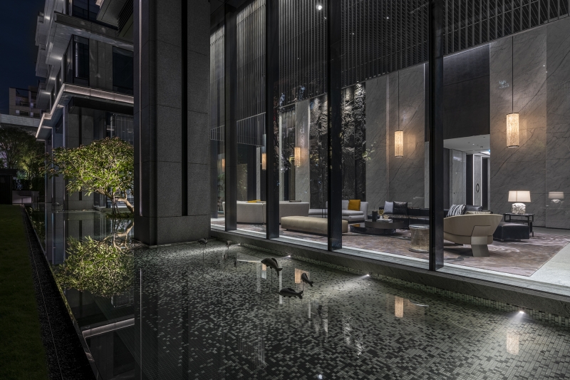 Lobby- in order to create a dry brush effect, we diliberately place the down lights close to the walls. With sharp shadows, the walls look like a Chinese ink painting.