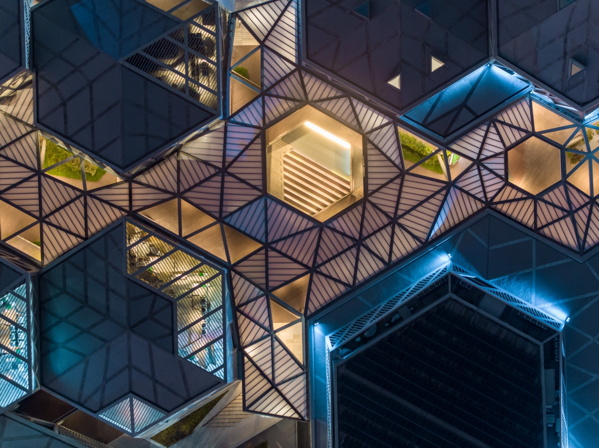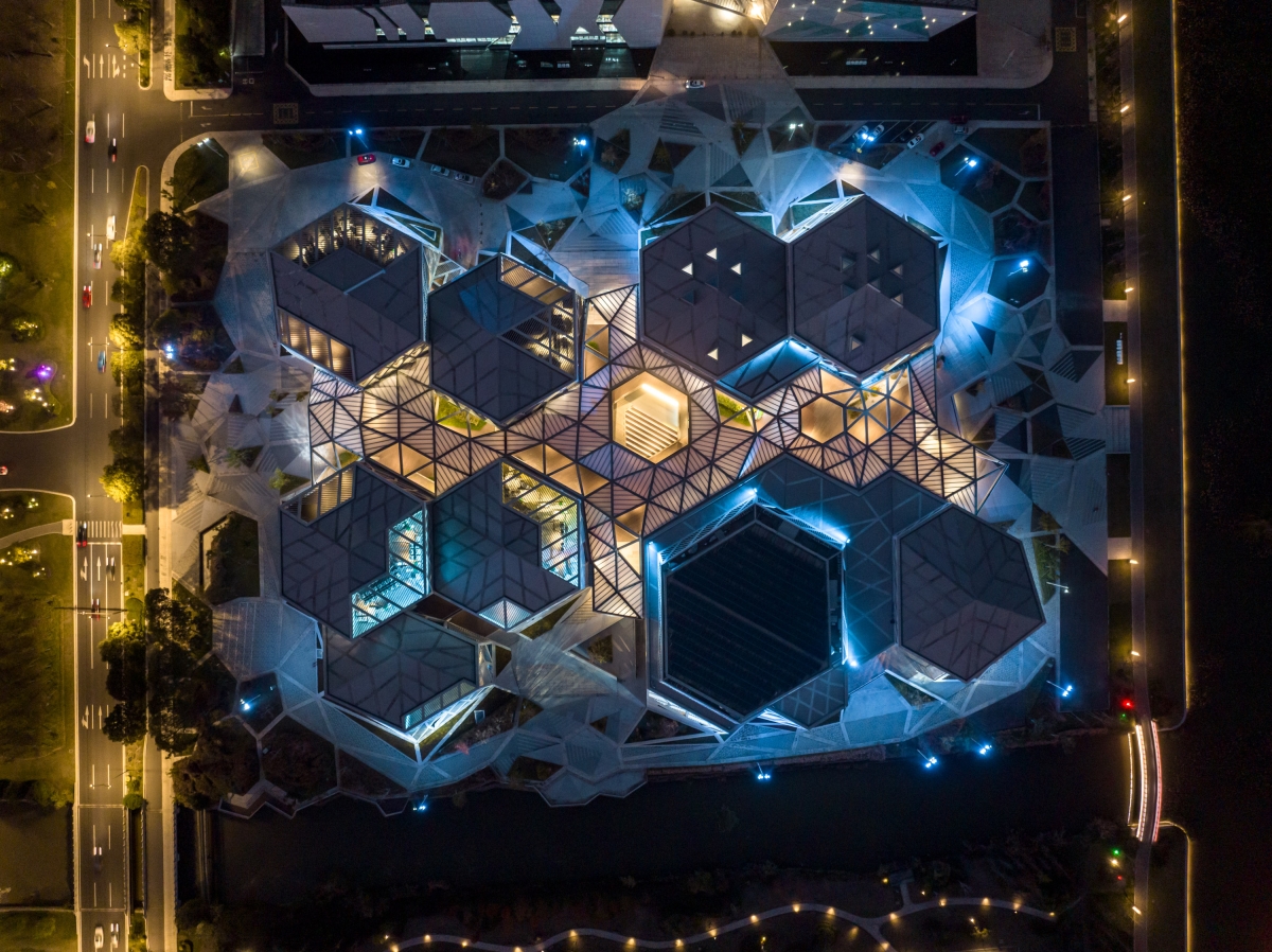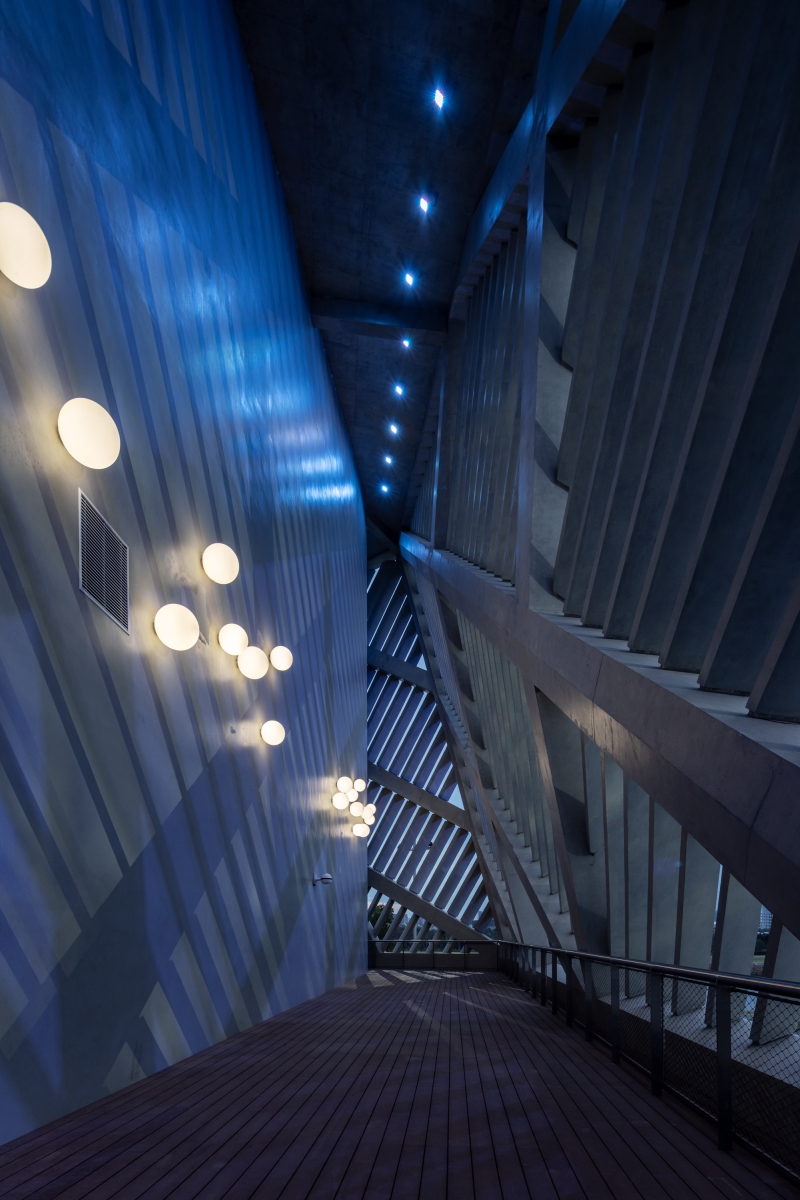The lighting design plays a pivotal role in bringing the center to life. A harmonious blend of exterior facade color-changeable flood lighting with projection lighting and lighting from within paints the building in a symphony of light and shadow. Echoing the ocean's rhythm, crystal-clear light balls and water-patterned projectors cast shimmering ripples across the facade, adding an air of whimsy and dynamism.