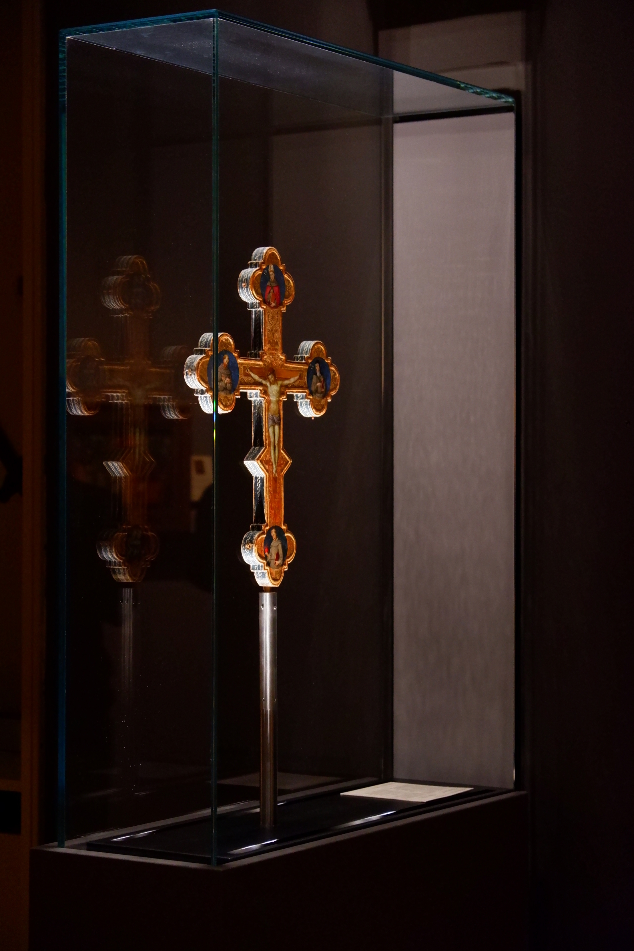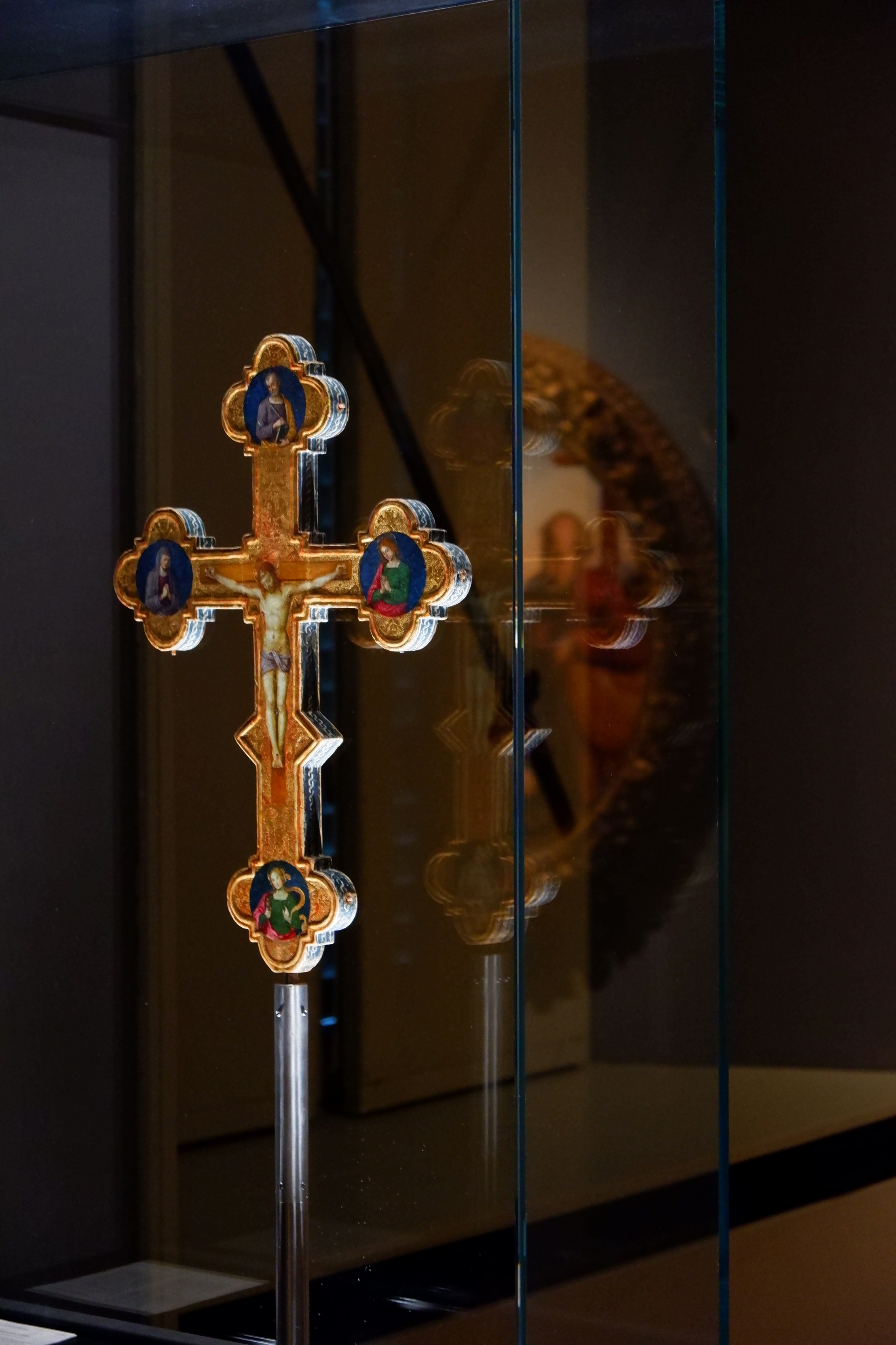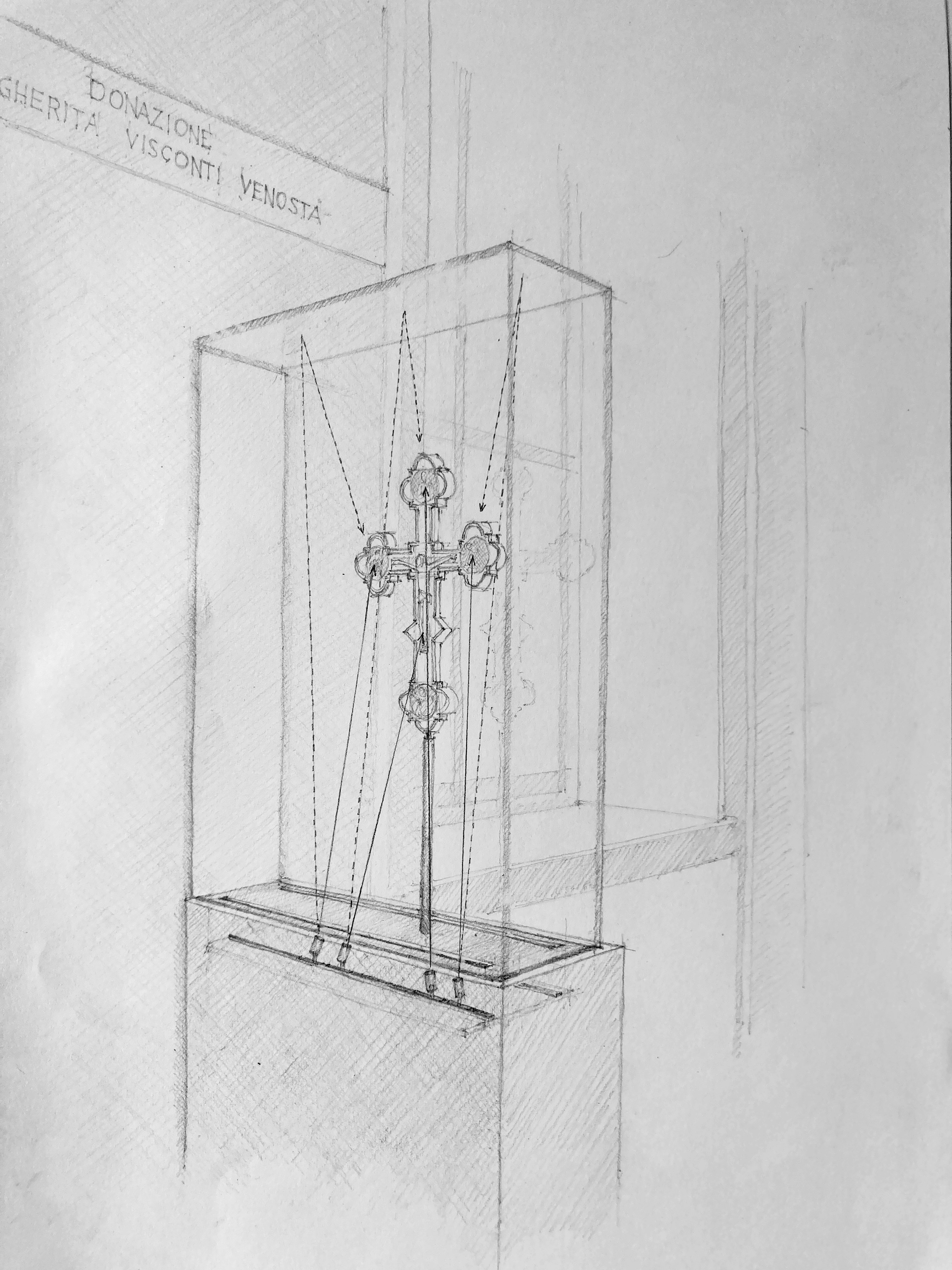 Entry DescriptionIn 2022 the "Processional Cross with Franciscan Saints" by Raffaello Sanzio was relocated inside a new display case in the rooms of the Poldi Pezzoli museum. The Cross was placed within an architecture which recalls the sequences of rooms in noble Renaissance palaces. To avoid shadows from the glass and glare, created by lights outside the case, the sources were hidden inside the case itself. This expedient also allowed the surfaces of the cross to be lit with a grazing light to bring out details and punchings. This new light made the work more brilliant and luminous as if it were an article of fine goldsmithery. However, the lights, close to the surfaces of the work, would have led to an imbalance in the distribution of light between the foot and the upper terminal of the Cross. To overcome this problem, a special film was glued on top of the surface of the case which, while maintaining transparency, reflects part of the light on the Cross, making the lighting homogeneous. Other films have been inserted inside the custom-made lighting fixtures which modify the beam, distributing the flow only along the two arms. Since the color rendering of the golden surface of the cross differed from that of the frames of the paintings displayed in the room, additional filters were used inside the projectors to modify the light spectrum and thus harmonize the warm tones of all the golds.