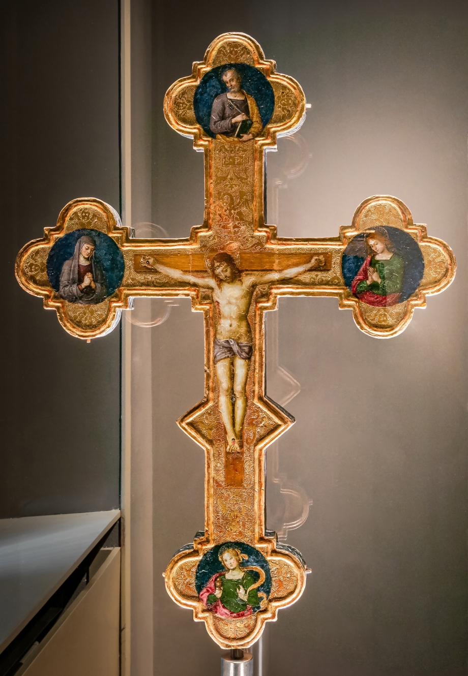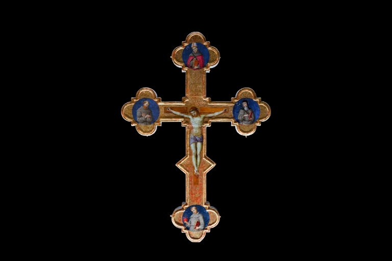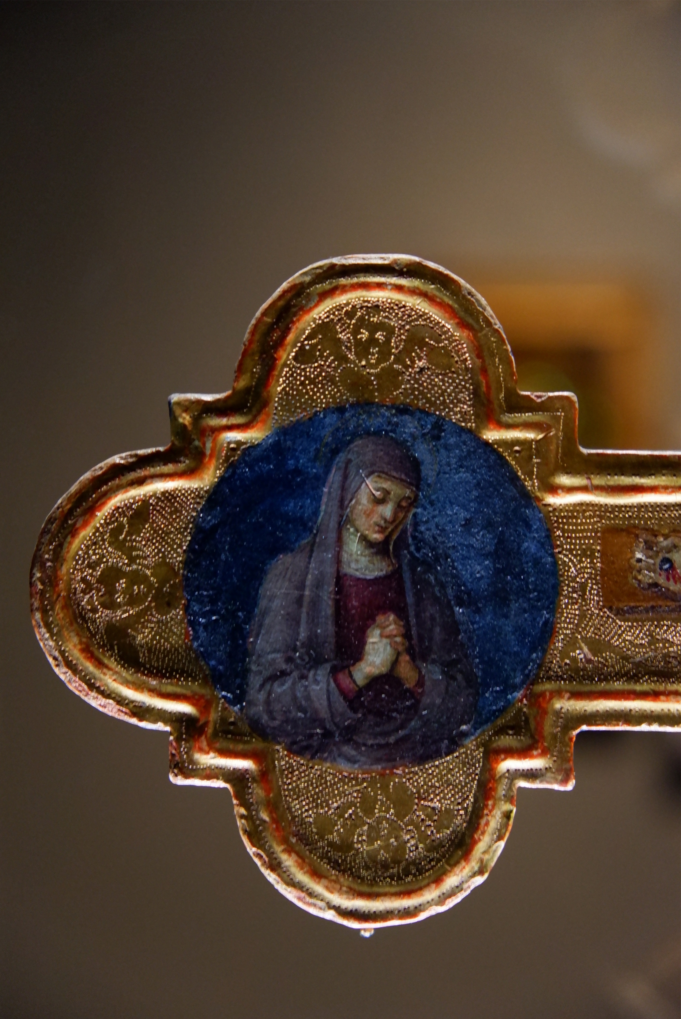 Entry DescriptionIn 2022 the "Processional Cross with Franciscan Saints" by Raffaello Sanzio was relocated inside a new display case in the rooms of the Poldi Pezzoli museum. The Cross was placed within an architecture which recalls the sequences of rooms in noble Renaissance palaces. To avoid shadows from the glass and glare, created by lights outside the case, the sources were hidden inside the case itself. This expedient also allowed the surfaces of the cross to be lit with a grazing light to bring out details and punchings. This new light made the work more brilliant and luminous as if it were an article of fine goldsmithery. However, the lights, close to the surfaces of the work, would have led to an imbalance in the distribution of light between the foot and the upper terminal of the Cross. To overcome this problem, a special film was glued on top of the surface of the case which, while maintaining transparency, reflects part of the light on the Cross, making the lighting homogeneous. Other films have been inserted inside the custom-made lighting fixtures which modify the beam, distributing the flow only along the two arms. Since the color rendering of the golden surface of the cross differed from that of the frames of the paintings displayed in the room, additional filters were used inside the projectors to modify the light spectrum and thus harmonize the warm tones of all the golds.