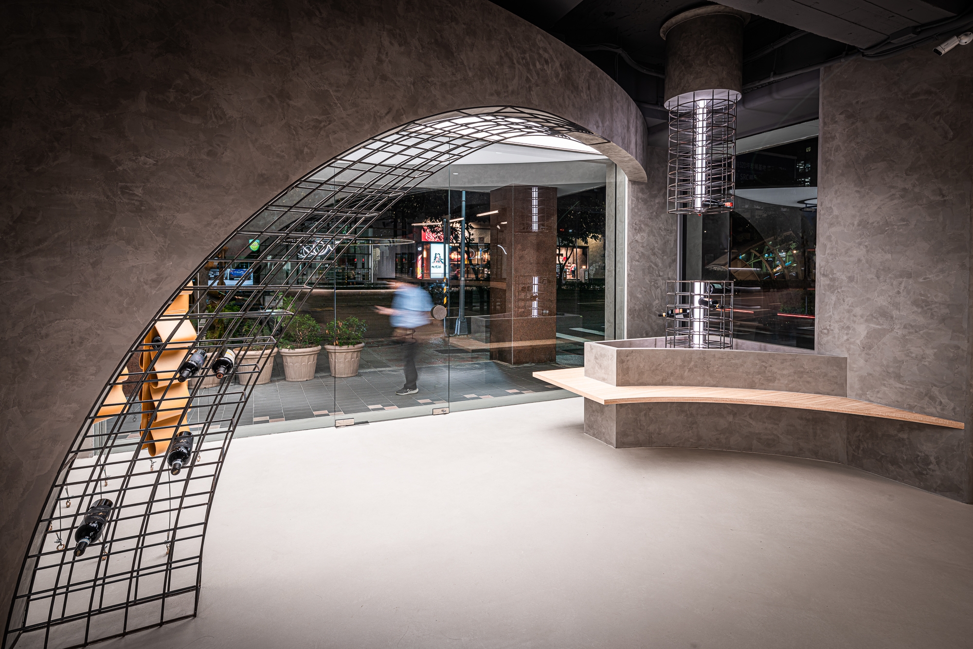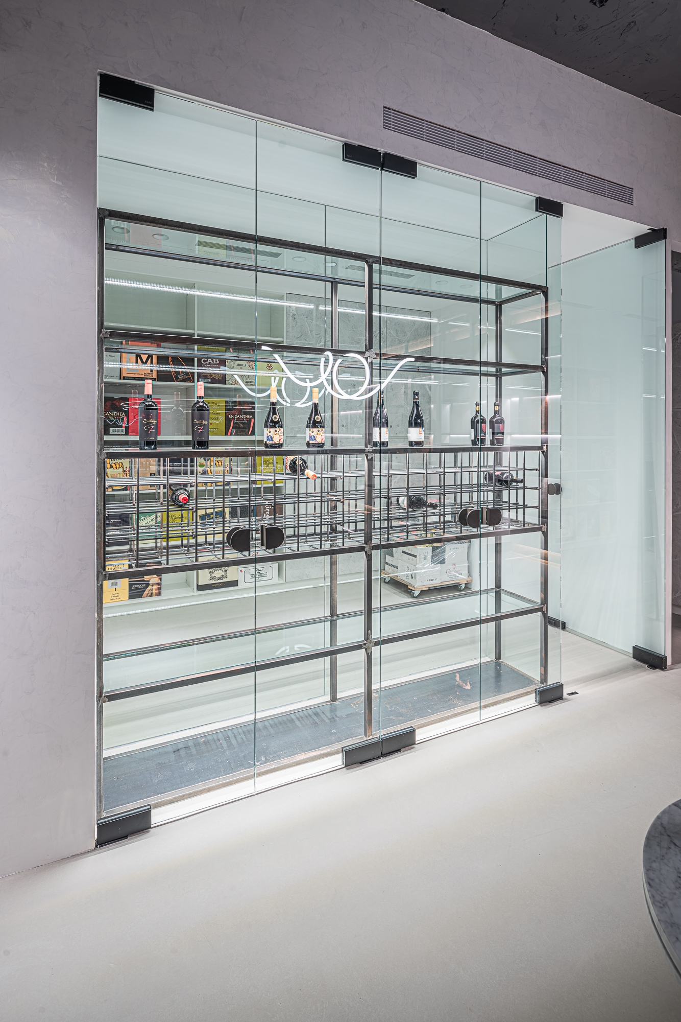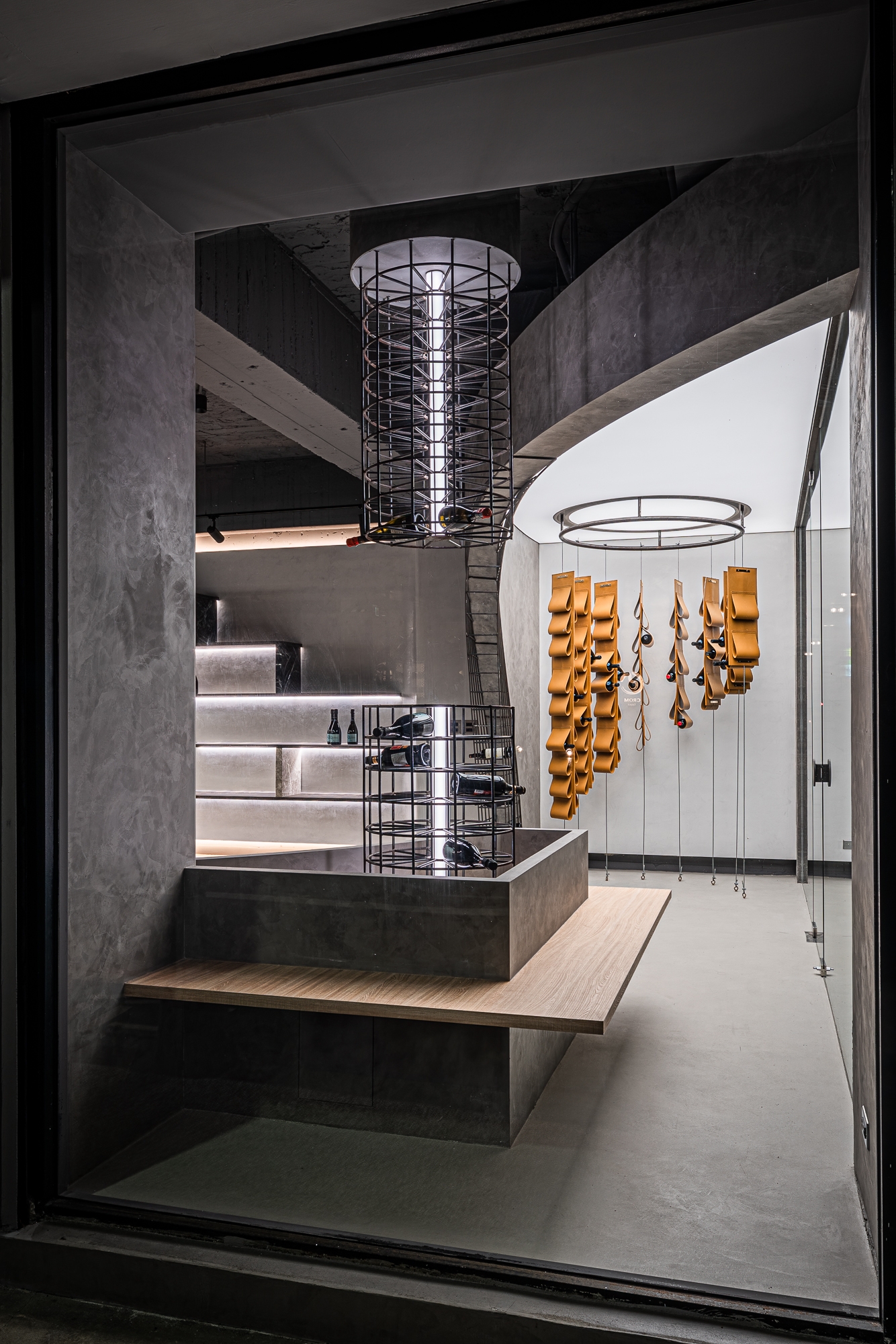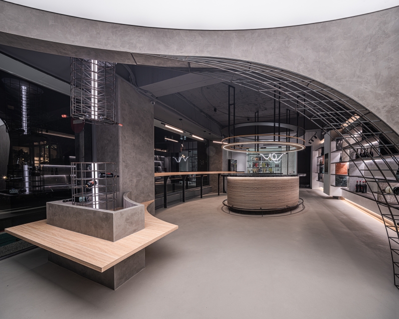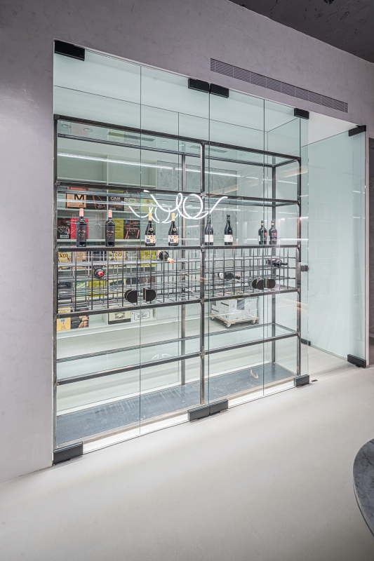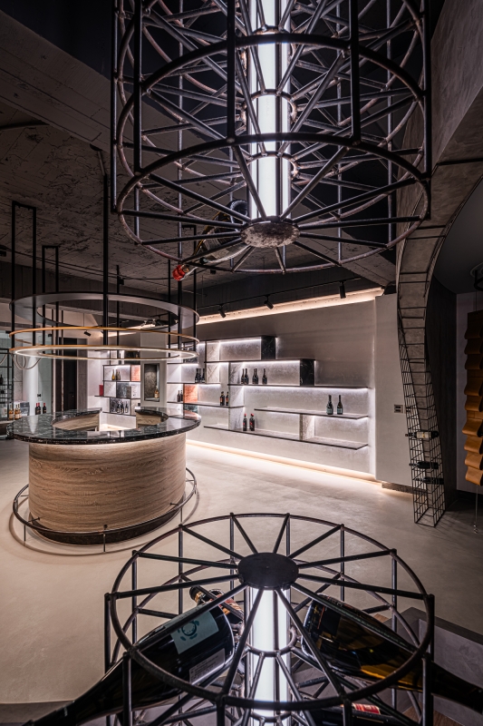 Eco-friendly faux finishing was applied on the ironware pieces. It has been chosen for both its humidity absorbing feature and aesthetics. Besides, this paint also allows the surfaces to age naturally, adding an organic feel to the space, thus creating a wine boutique that feels both ethereal and alive.
