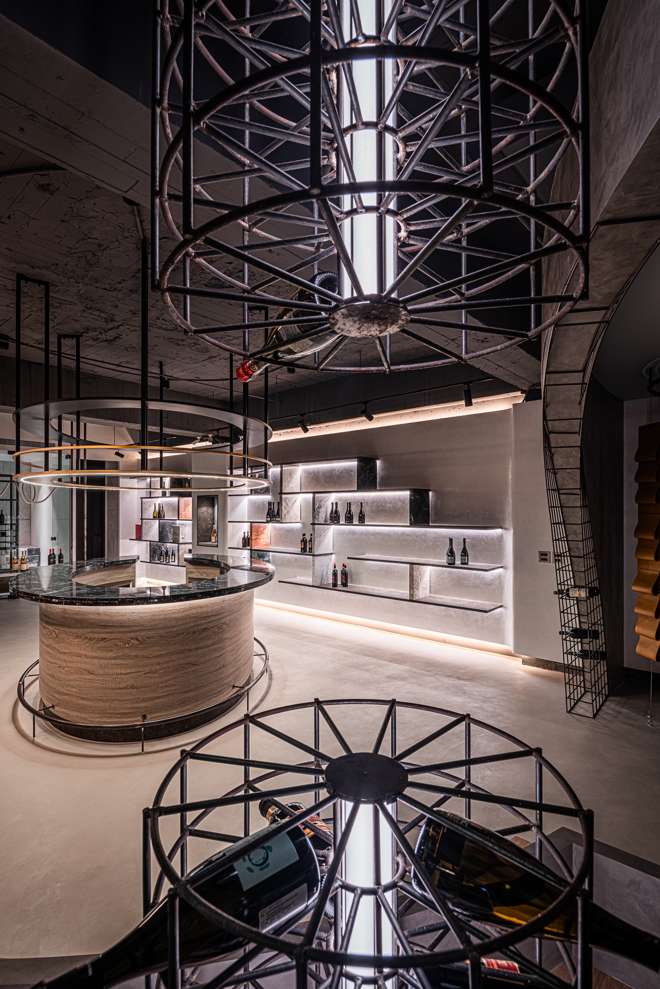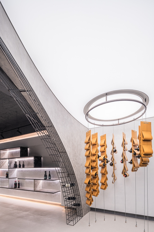 Structuring the space, light fixtures bring focus on the product and help clients understand the structure of the room easier: metal cages and grape-inspired leather pendants for product display, shelves for selection, counter for tasting.