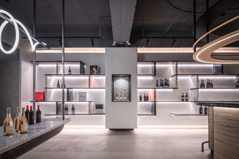 Smoothing lights create a relaxing atmosphere, favourable to wine tasting while allowing at the same time to appreciate its colour. Throughout the shop, the interplay of light accompanies the journey of the product, from its display on the shelves to customers' glasses, creating an immersive and memorable tasting experience.