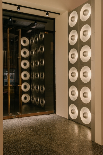A layer of dynamic lighting was added to emphasize the playful feel of the space. Behind the counter waves of light makes the reflective wall sparkle and cast reflections on to the industrial concrete surfaces.