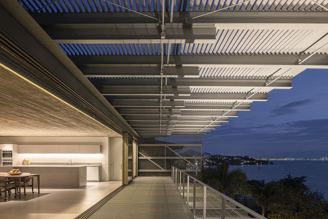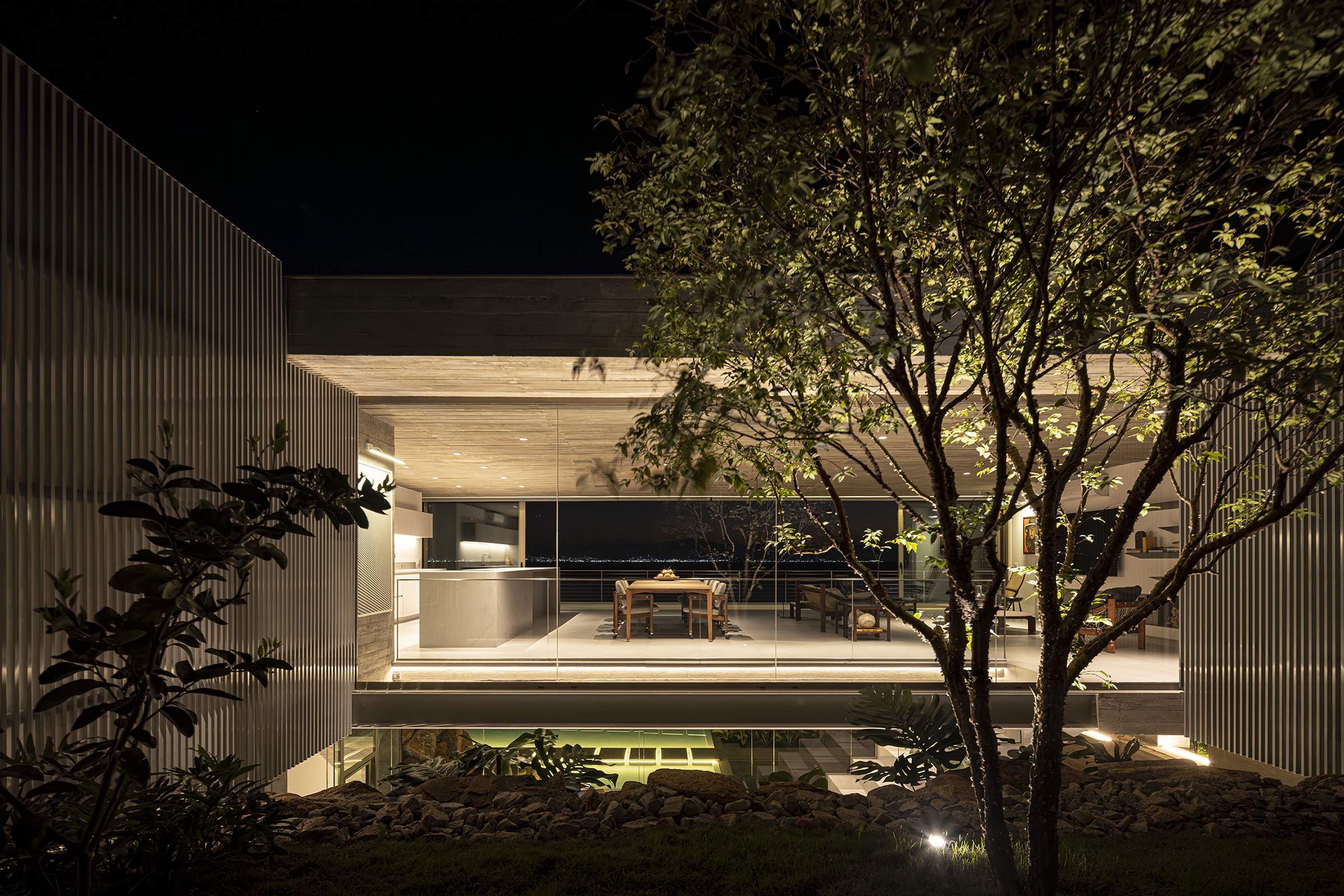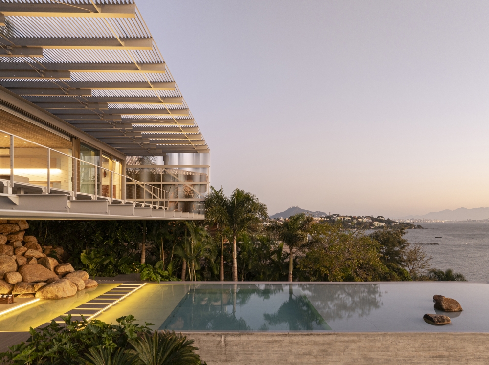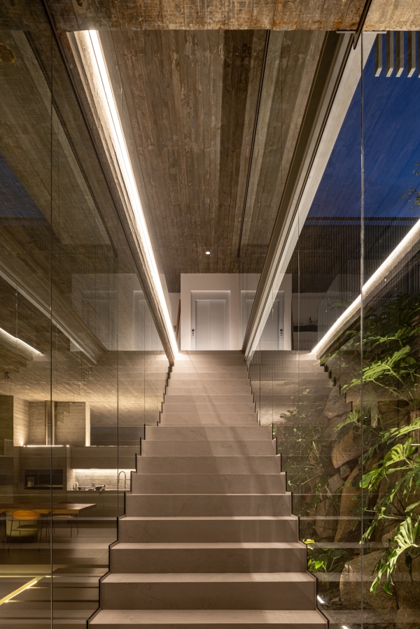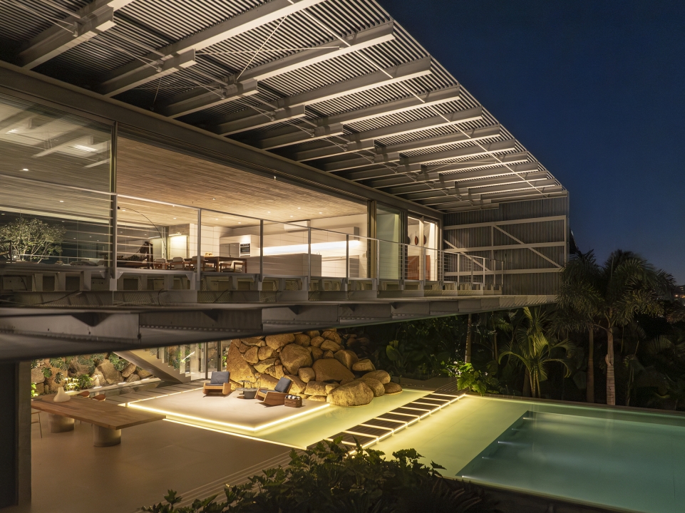 Entry DescriptionCasa Ponte (Bridge House) is situated on a hillside overlooking the Cacupé sea, blending seamlessly with its natural surroundings. Inspired by the local landscape, its metal structure echoes the iconic Florianópolis bridge, while stone walls reflect the nearby rocky sea. The lighting design for the Bridge House focused on enhancing the architectural design as originally conceived. The goal was to reveal its design during the night, with emphasis on the metal structure and stone walls to highlight the foundation and create the impression of the house floating above the ground. The design utilized indirect lighting throughout, with direct lighting fixtures added where necessary. To minimize physical interference with the architecture, lighting solutions were integrated into the design itself. The building’s materiality informed the selection of fixture finishes; for instance, recessed fixtures with concrete bodies were used in the exposed concrete slabs. In the circulation area connecting the suspended volume to the basement, a recessed plaster molding was proposed to create an inverted baseboard, where linear lighting was embedded to emphasize the staircase design. The pool design was highlighted with underwater linear lighting. A warm color temperature was selected to evoke a sense of comfort, refuge, and coziness.