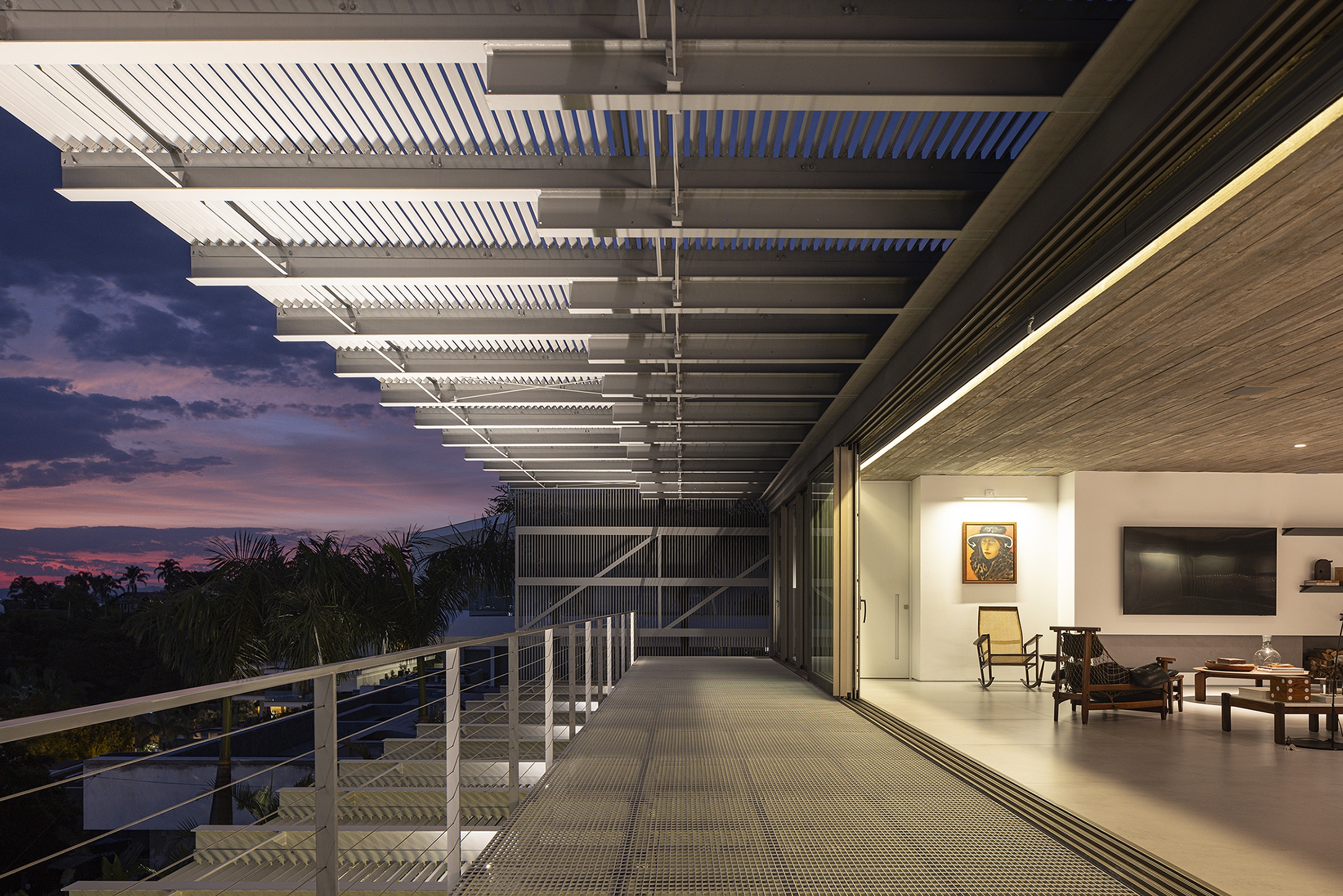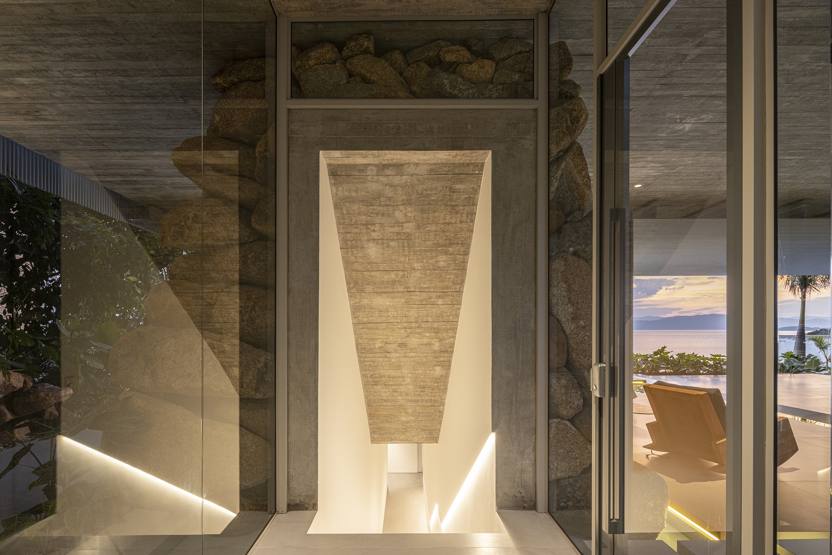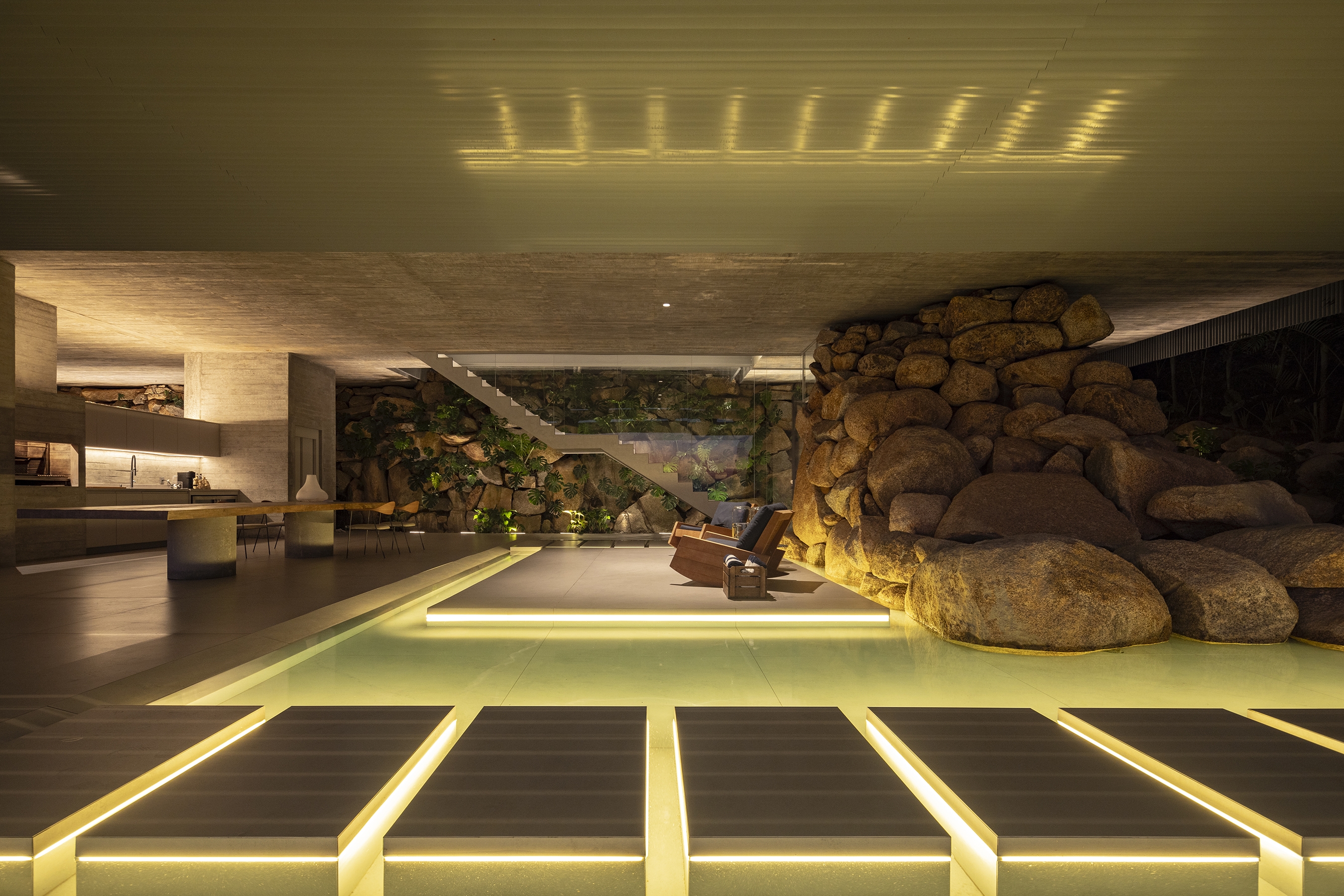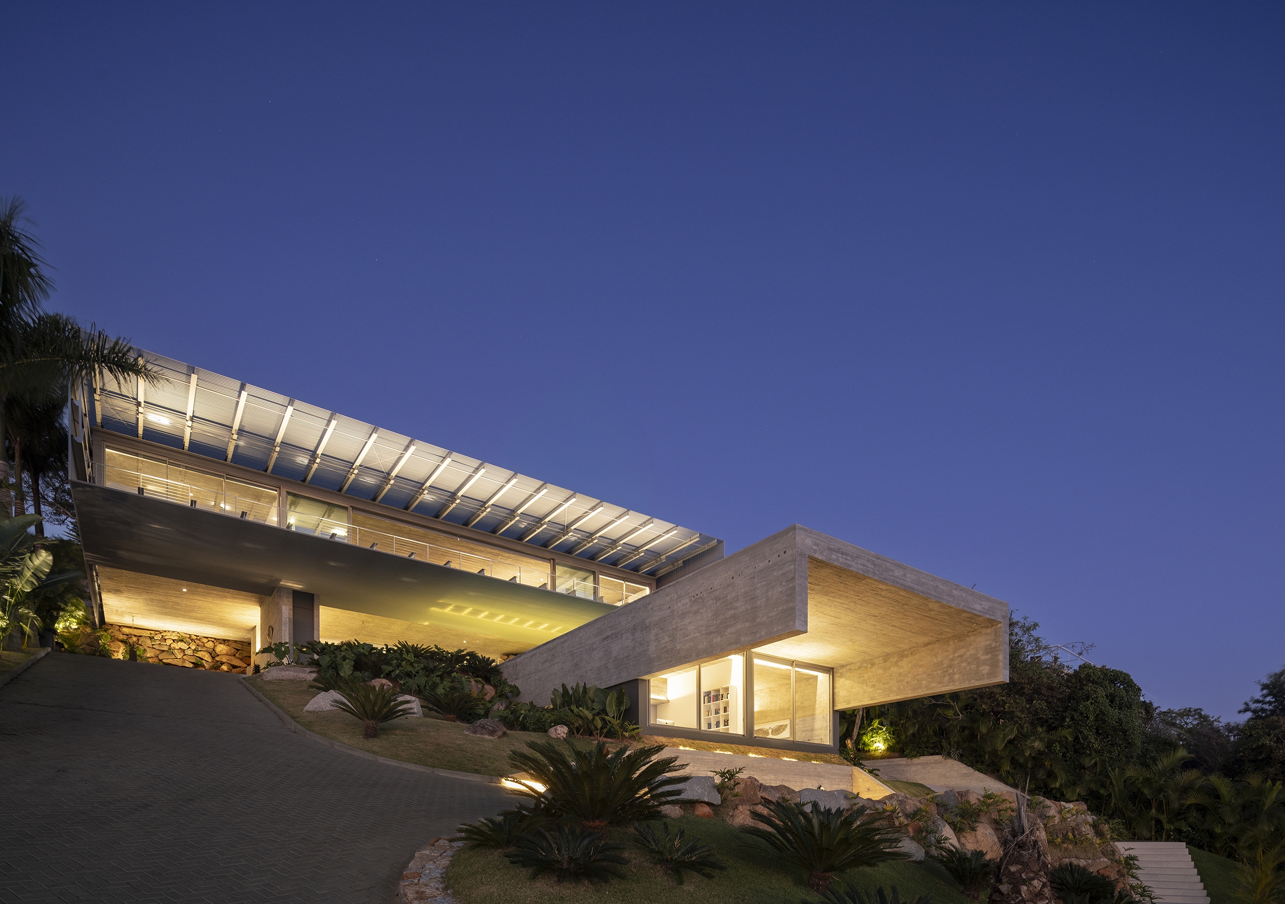 Entry DescriptionCasa Ponte (Bridge House) is situated on a hillside overlooking the Cacupé sea, blending seamlessly with its natural surroundings. Inspired by the local landscape, its metal structure echoes the iconic Florianópolis bridge, while stone walls reflect the nearby rocky sea. The lighting design for the Bridge House focused on enhancing the architectural design as originally conceived. The goal was to reveal its design during the night, with emphasis on the metal structure and stone walls to highlight the foundation and create the impression of the house floating above the ground. The design utilized indirect lighting throughout, with direct lighting fixtures added where necessary. To minimize physical interference with the architecture, lighting solutions were integrated into the design itself. The building’s materiality informed the selection of fixture finishes; for instance, recessed fixtures with concrete bodies were used in the exposed concrete slabs. In the circulation area connecting the suspended volume to the basement, a recessed plaster molding was proposed to create an inverted baseboard, where linear lighting was embedded to emphasize the staircase design. The pool design was highlighted with underwater linear lighting. A warm color temperature was selected to evoke a sense of comfort, refuge, and coziness.