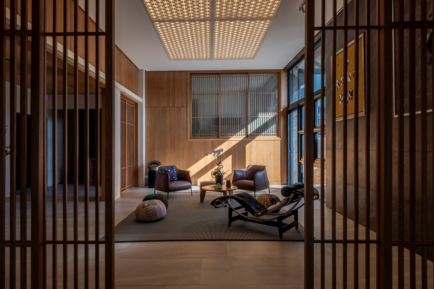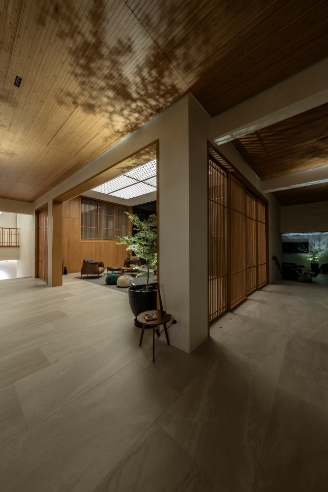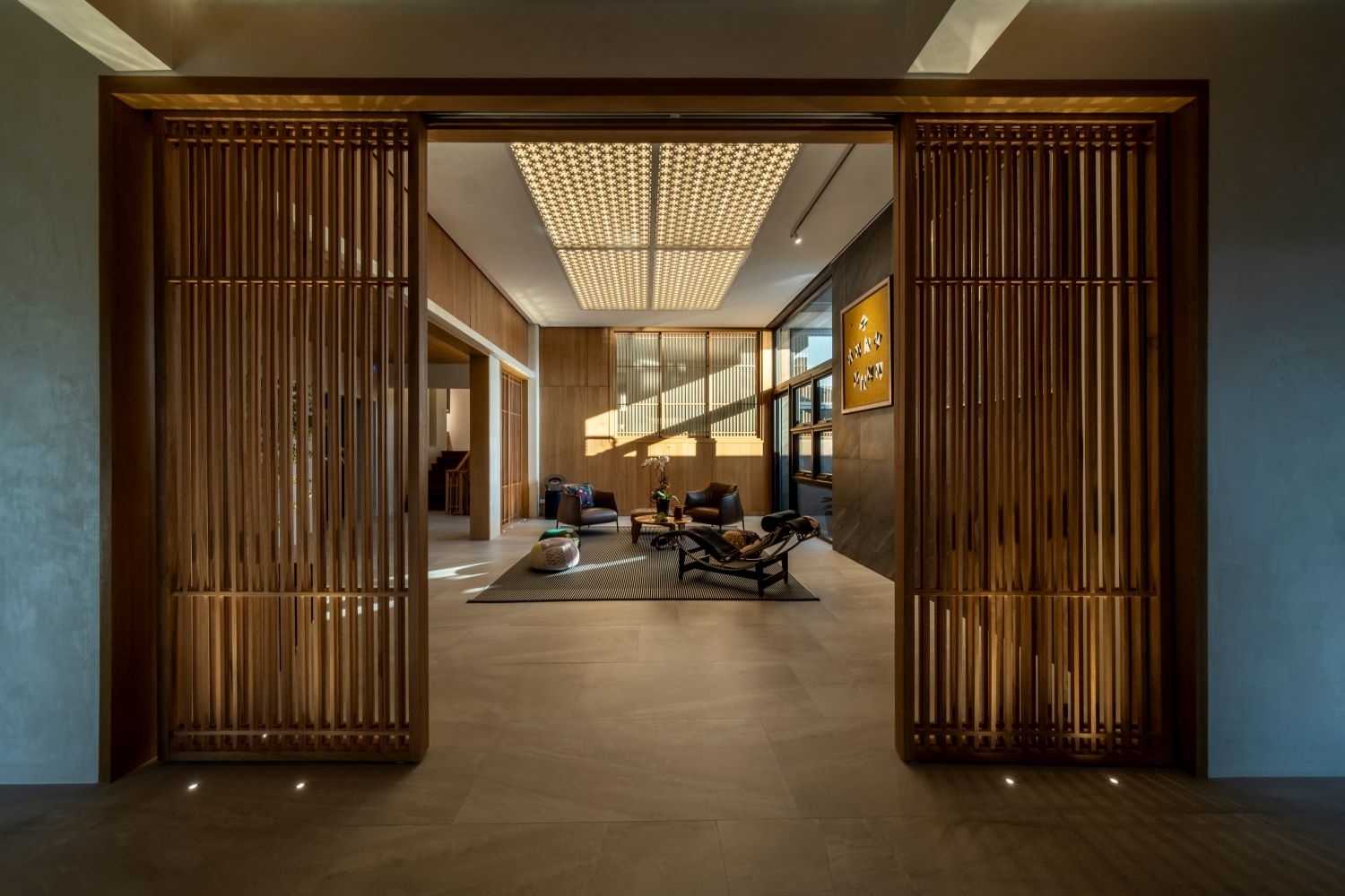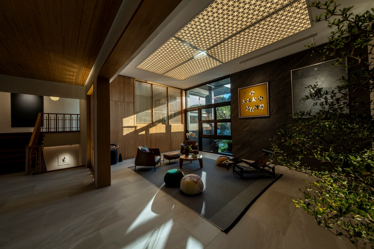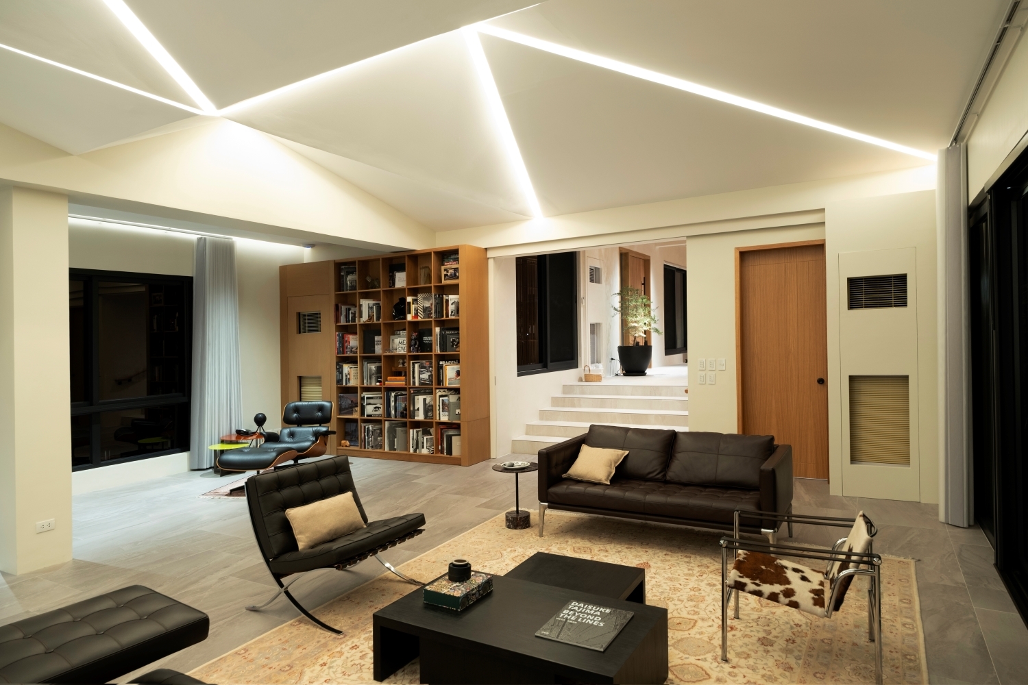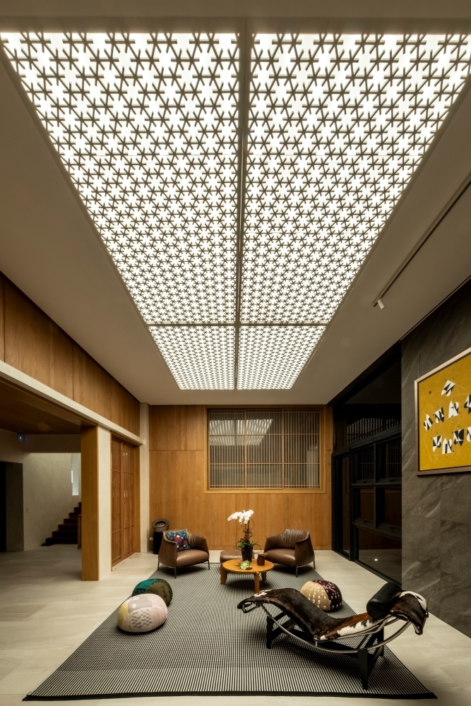 Entry DescriptionLocated in a modern home in the Philippines, this lighting project harmonizes architectural form with advanced lighting technology. The design emphasizes visual comfort and a smooth transition between day and night. Linear luminaires, discreetly integrated behind a geometric ceiling, provide soft light that enhances the room’s architecture without overpowering the space. Natural daylight highlights the rich wooden finishes, while concealed fixtures add subtle accents.