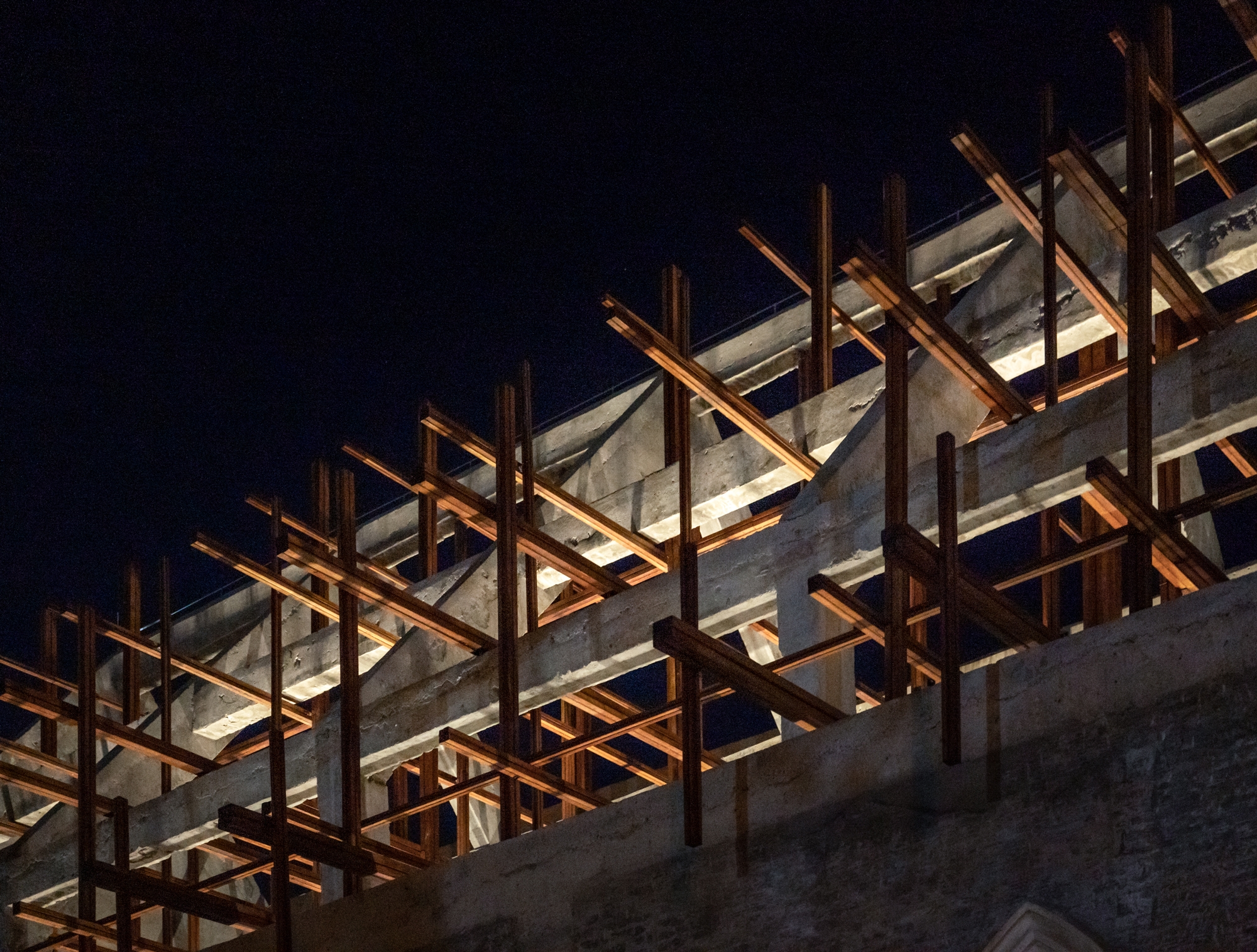 In order to achieve a rhythmic and appropriate contrast between light and shadow, the lighting system utilizes a color temperature of 3500K to neutralize the colors of the materials. This emphasizes the original ruined architectural look and brings out the inclusiveness of the architecture.
