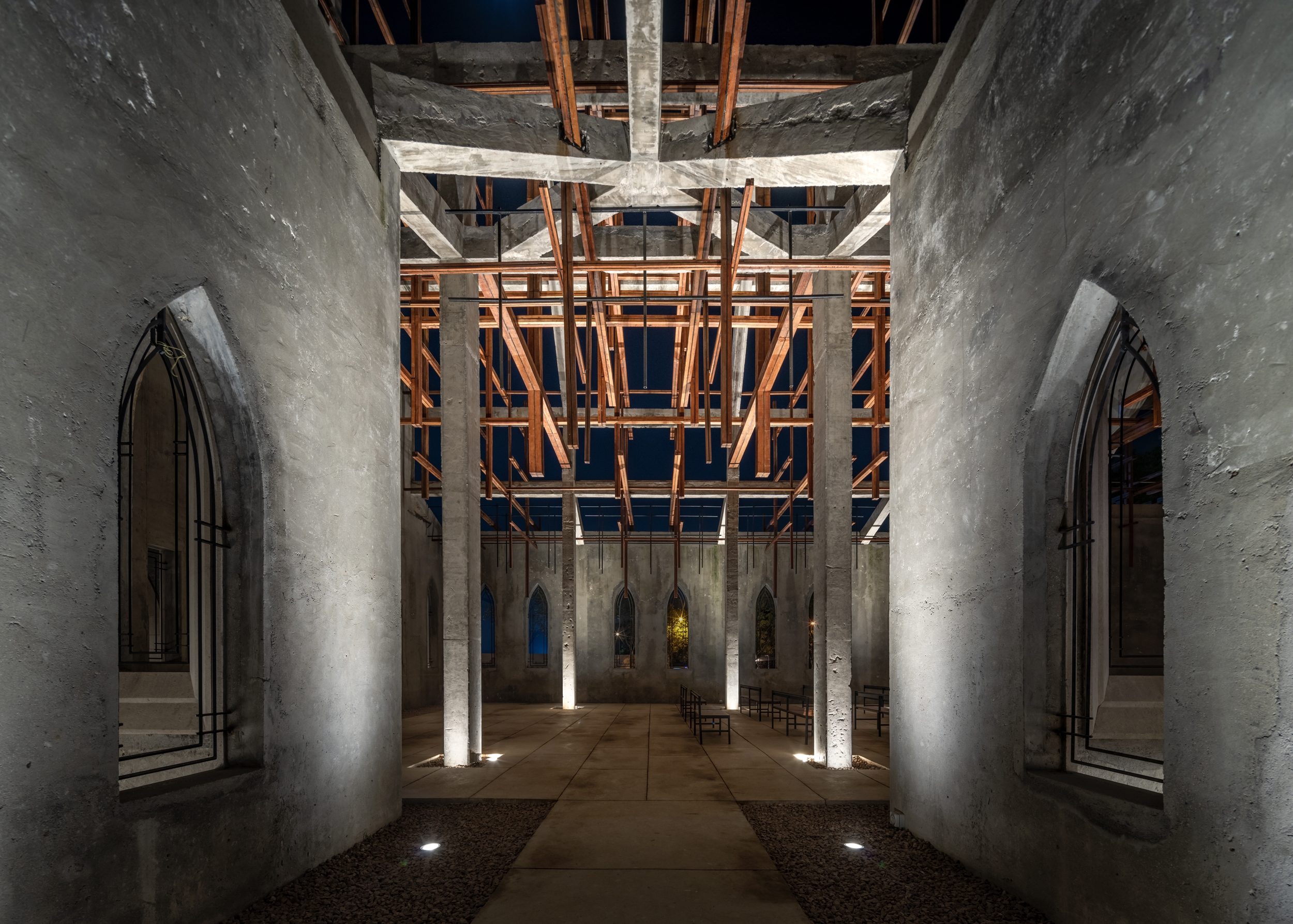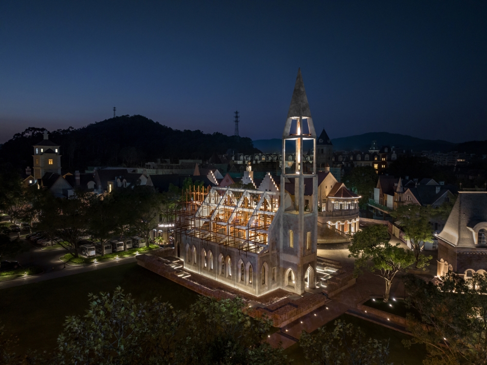 Flexible strip lights embedded in the outer contour of the church define its structural features and create a mysterious atmosphere. LED spotlights are used in the top uncovered steel-wood structure and walls of the church's main building, making the space brimmed with light and shadow silently, and creating a solemn historical feeling.