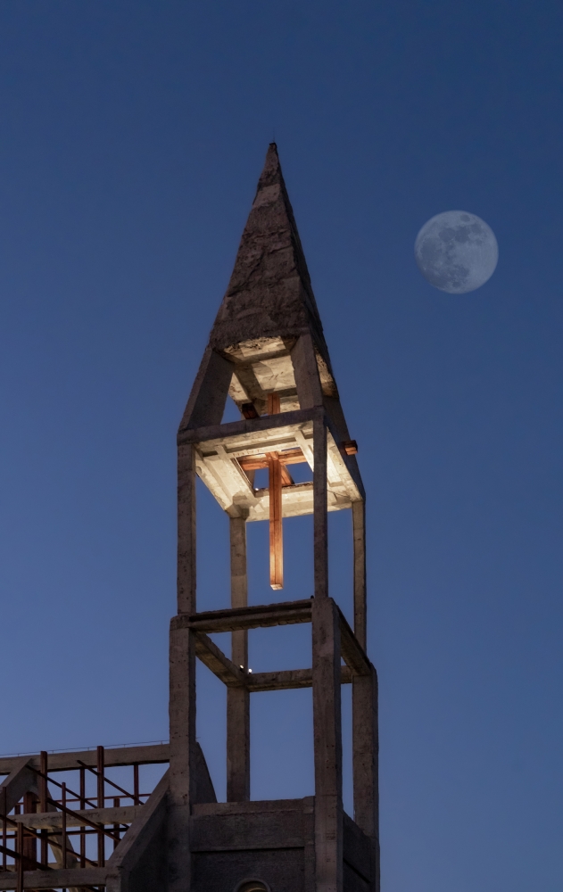 The church's illumination is set at three different levels. The cross at the top of the church tower is the brightest, serving as an impressive visual centerpiece. The main building is the second brightest, while the outer part of the church is the least illuminated. This creates a sense of depth and time as a whole.
