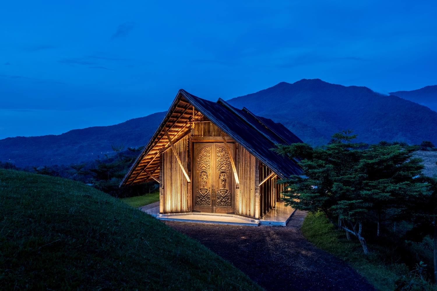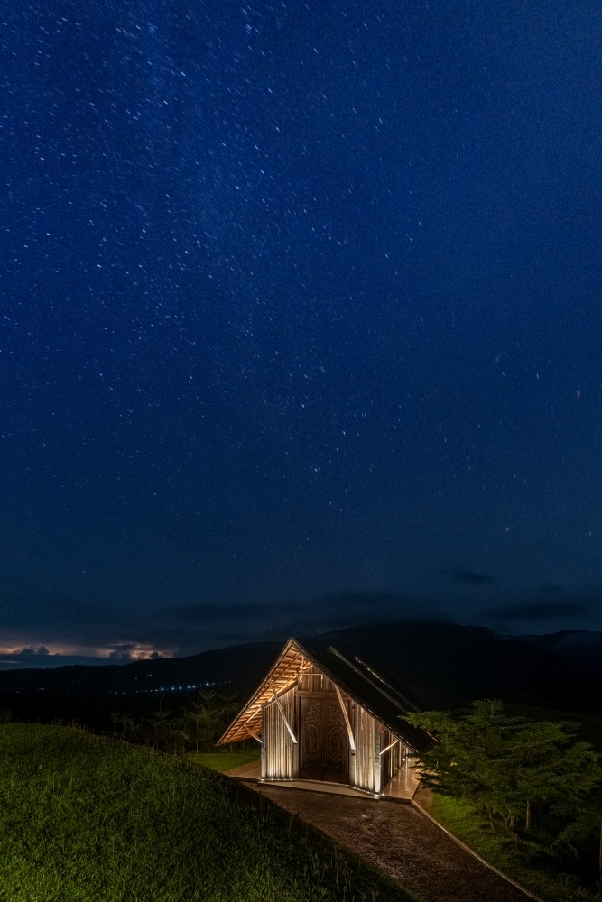 A key part of the project was to reduce light pollution and preserve the night sky. The lighting fixtures are carefully hidden from view, and highlights certain architectural features . This design preserves the natural beauty of the night sky while maintaining the chapel’s peaceful ambiance. Inside, warm-toned lighting highlights the bamboo ceiling, while chandeliers softly illuminate the space, creating a serene atmosphere for worship. Outside, uplights accentuate the chapel's wooden facade, enhancing its detailed craftsmanship without overpowering the natural environment.