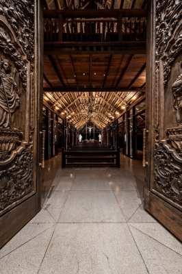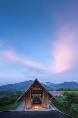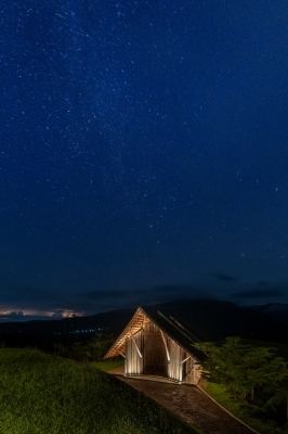 Ar. Tonyboy Legaspi embraced traditional materials and sustainable design. The chapel features bamboo, antique hardwood, and a roof crafted from cogon grass, blending seamlessly with the natural landscape. Set against a backdrop of mountains and hills, the structure feels both welcoming and serene. The steeply pitched roof and intricately carved wooden doors strike a balance between rustic charm and cultural refinement. Large open windows invite the surrounding views to become part of the interior experience.