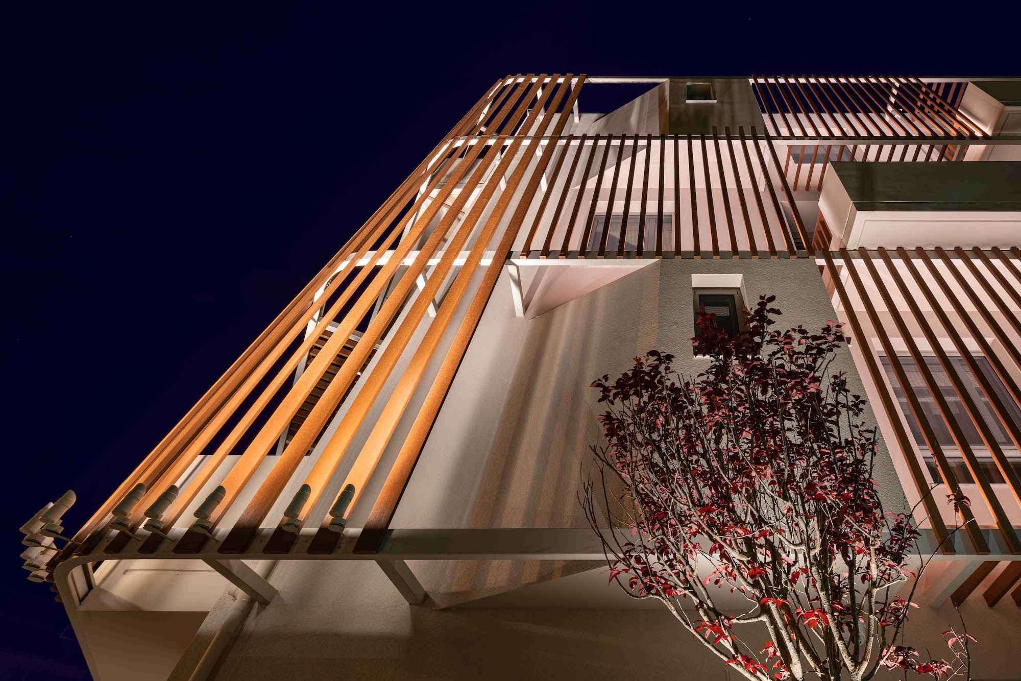 Honeycomb filters for the narrow beam spotlights (longer facade fins) and integrated vertical louvers for the linear uplights (shorter facade fins) contain and direct light where needed. Smart lighting controls allow for visual hierarchy and a dim down exterior lit effect for late night operation, as a result Townhouse Lefkada has a discreet and elegant nighttime presence.