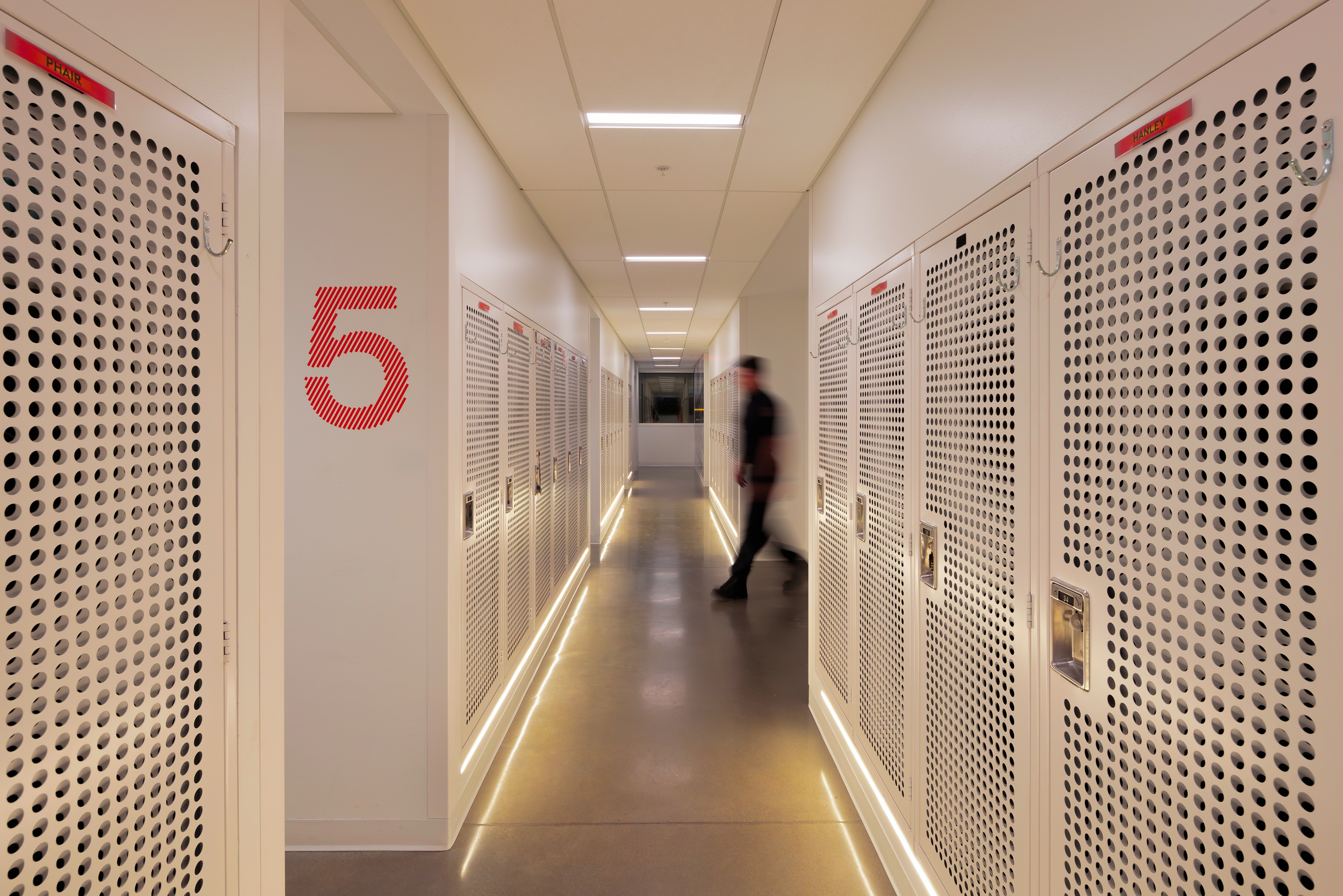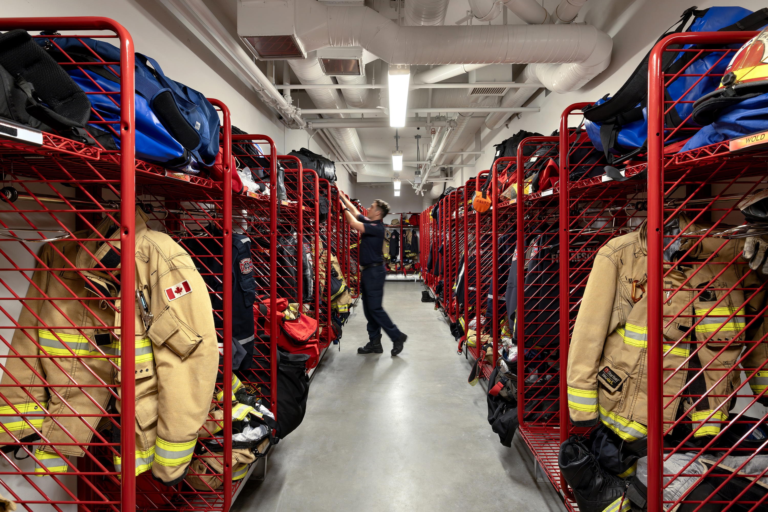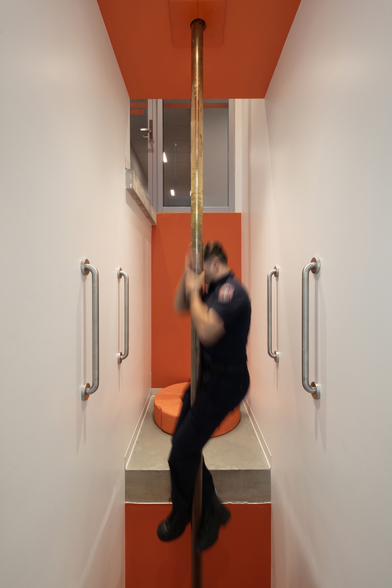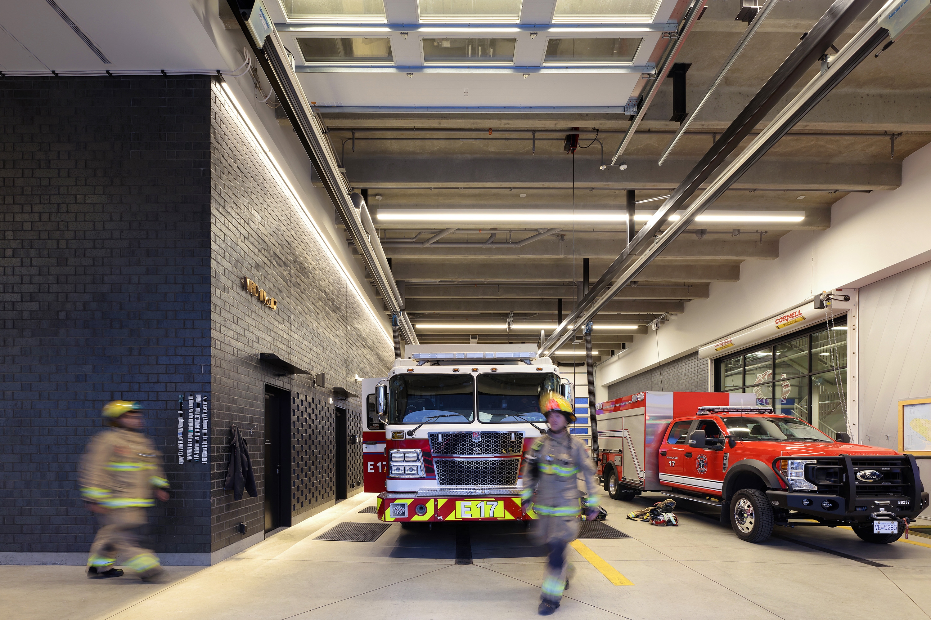 In the apparatus bays, uniform vertical illumination supports detailed vehicle maintenance. Wall grazers highlight core bricks, creating a relaxing environment when overhead lights are off. Workspaces like pole and gear rooms are lit uniquely to prevent any glare in fast-paced environments.