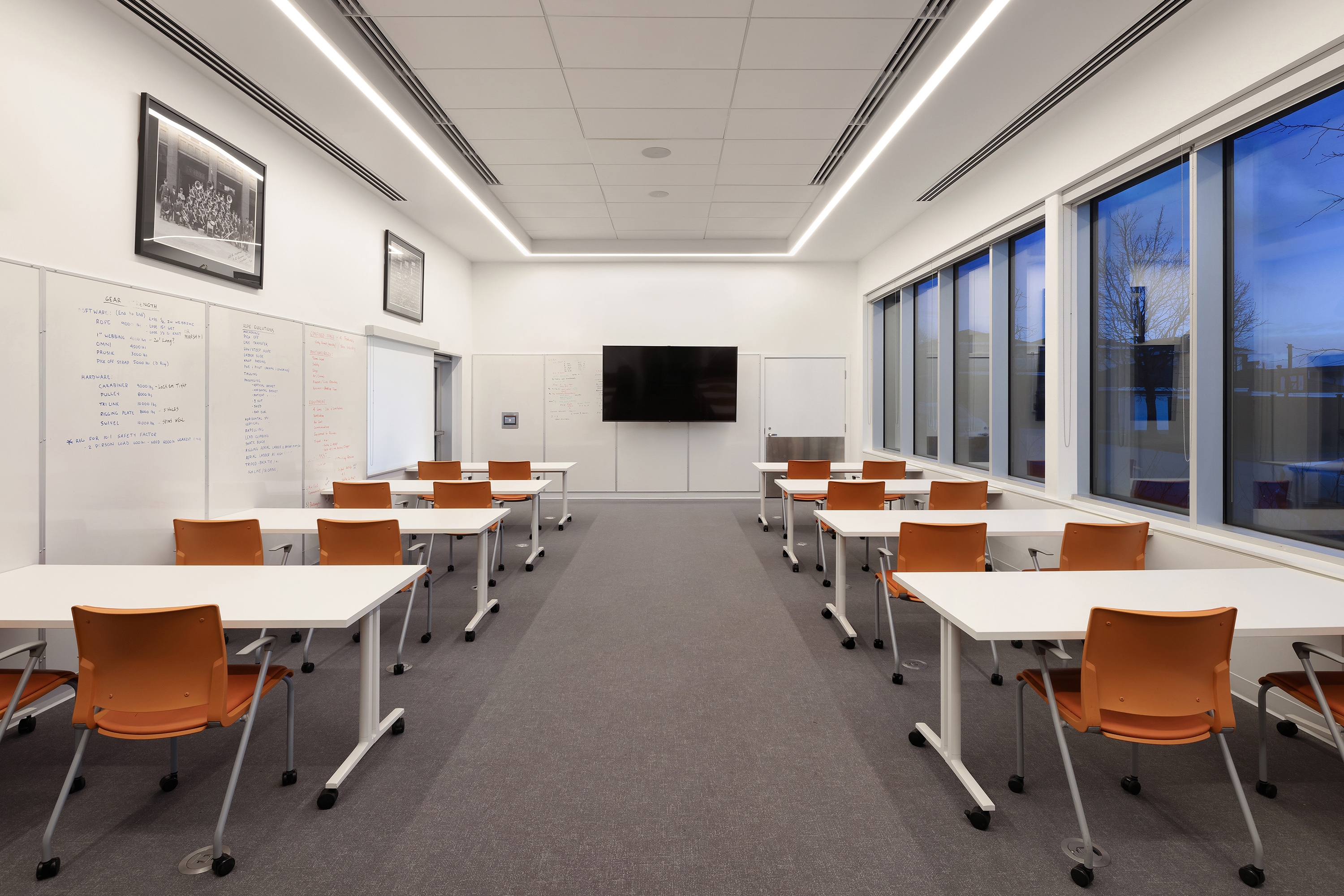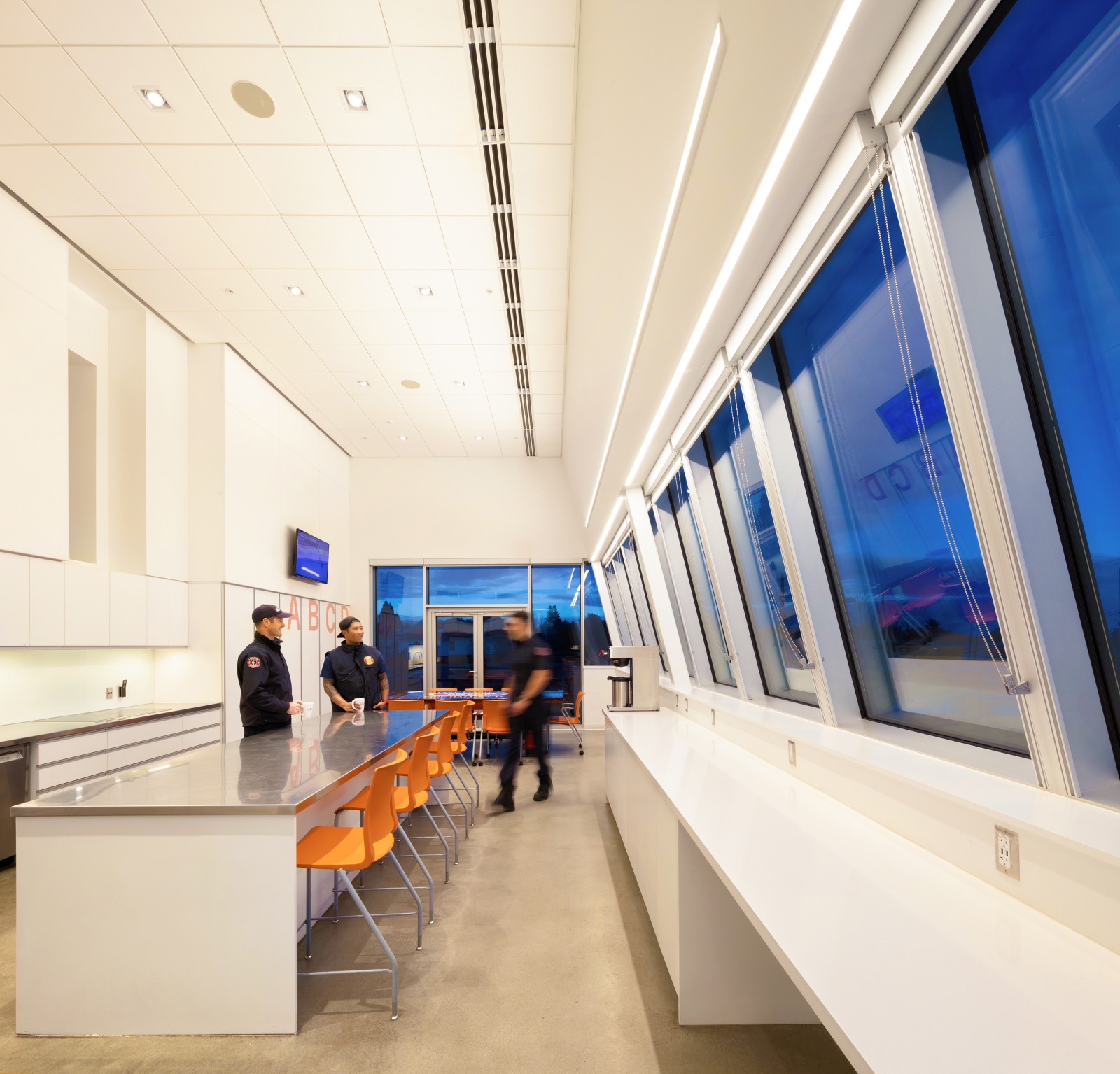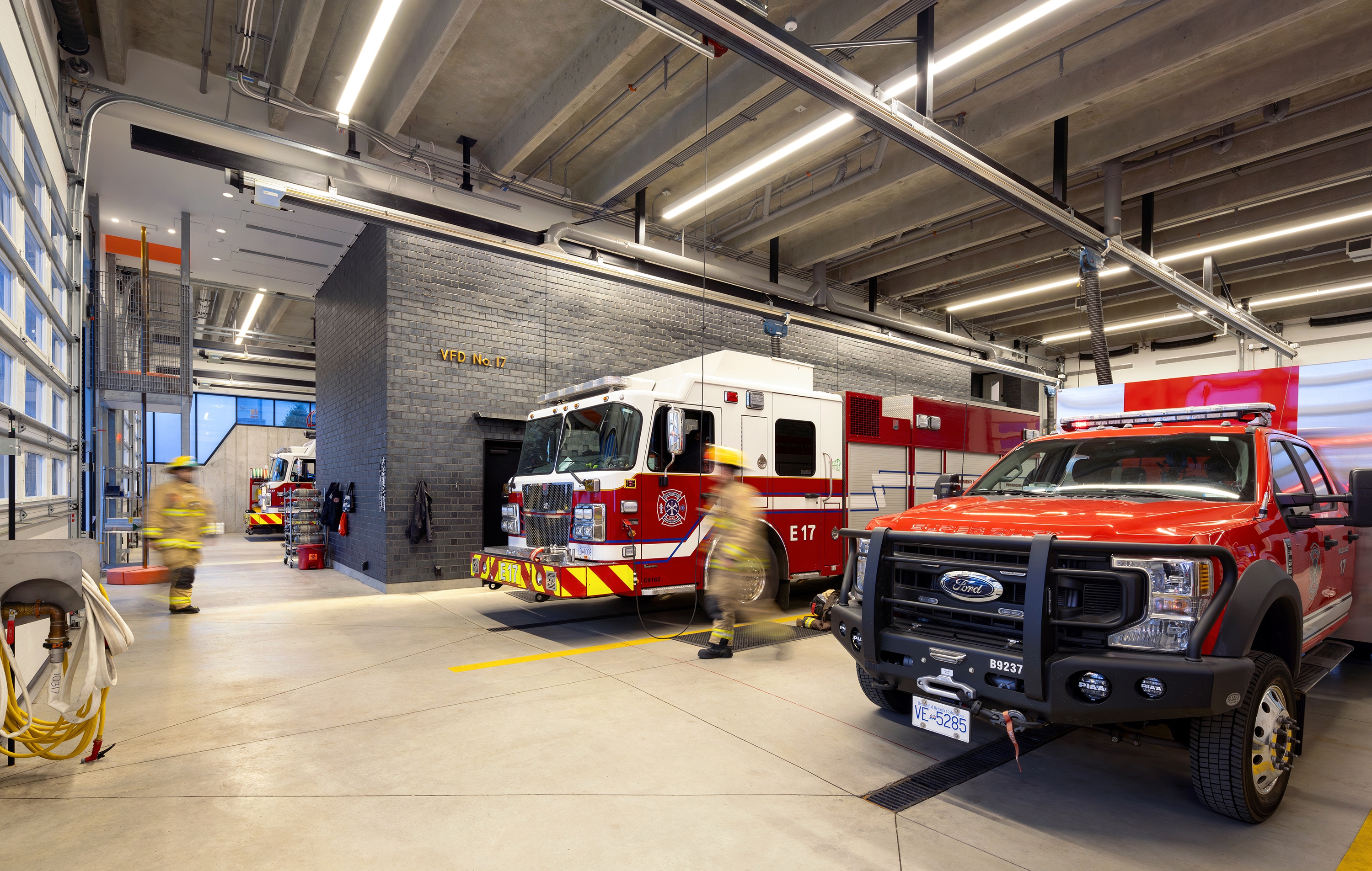 In the apparatus bays, uniform vertical illumination supports detailed vehicle maintenance. Wall grazers highlight core bricks, creating a relaxing environment when overhead lights are off. Workspaces like pole and gear rooms are lit uniquely to prevent any glare in fast-paced environments.