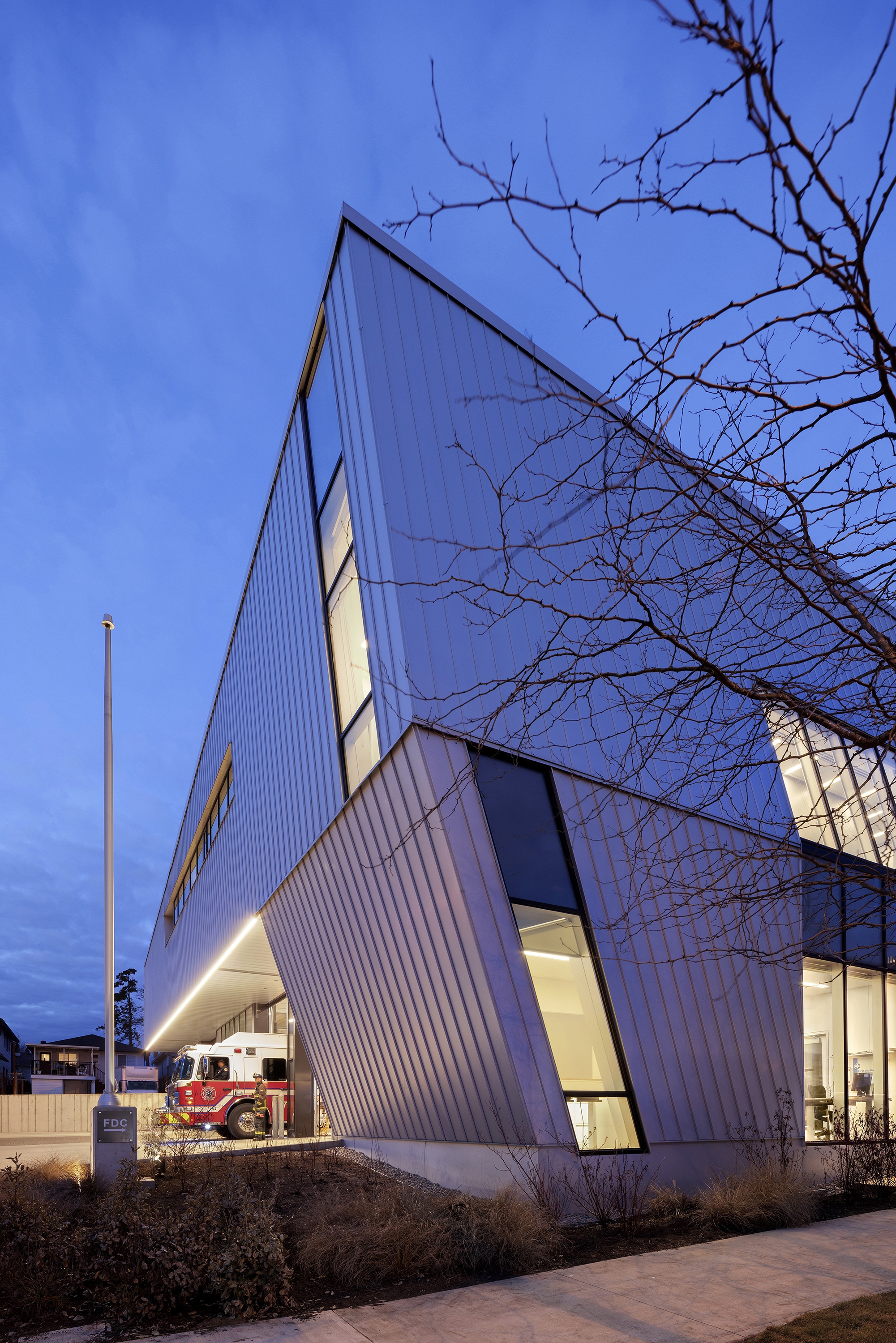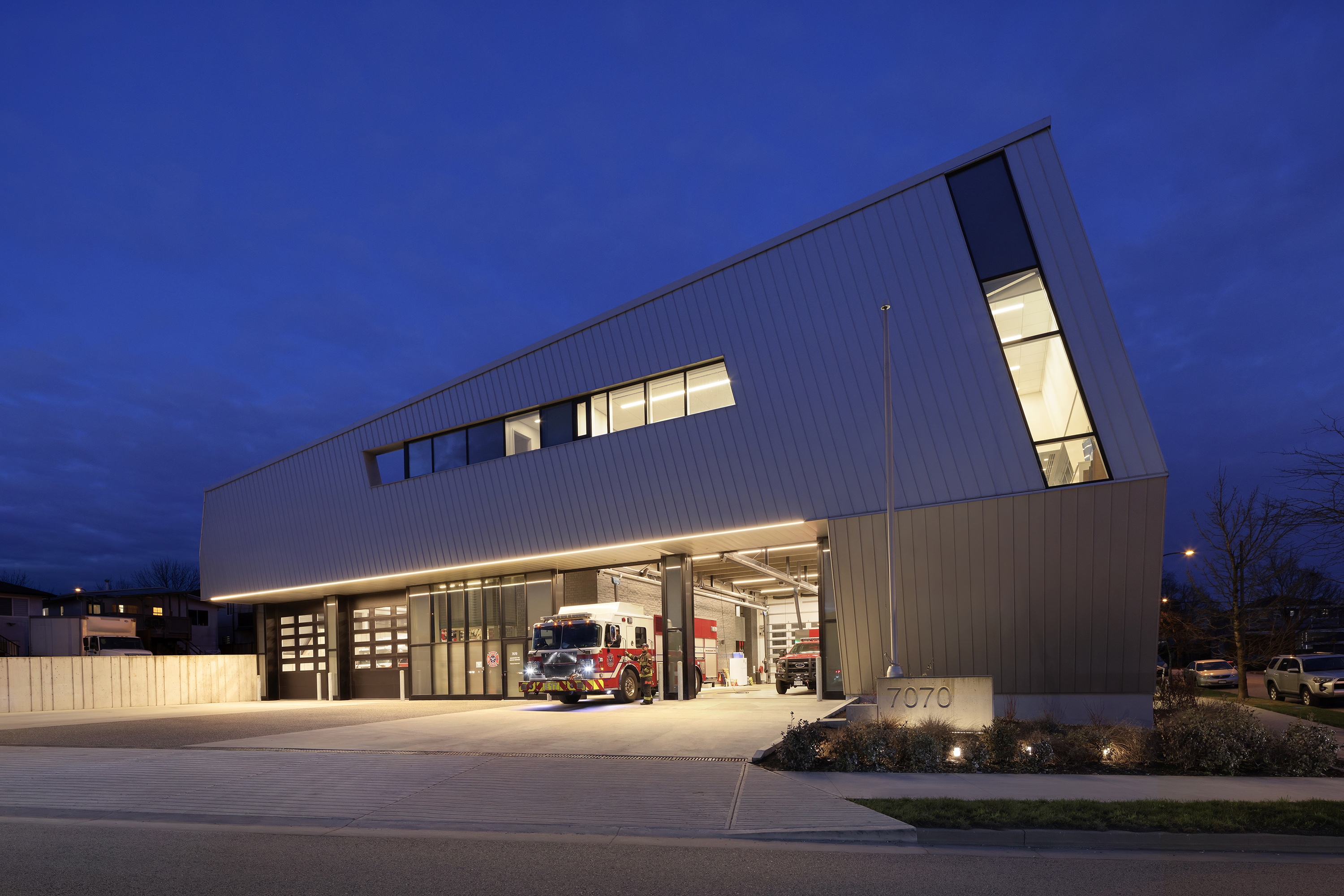 Sustainability ApproachThis facility is Canada's first Passive House and Zero Carbon Building fire hall, achieving LEED Gold and Net-Zero Energy design. The building optimizes natural light through orientation, while electrochromic glass in the iconic façade enhances firefighters' health by connecting them with the outdoors. This glass reduces solar gain, glare, and energy consumption. A 95KW rooftop solar array powers the lighting, achieving net-zero energy.