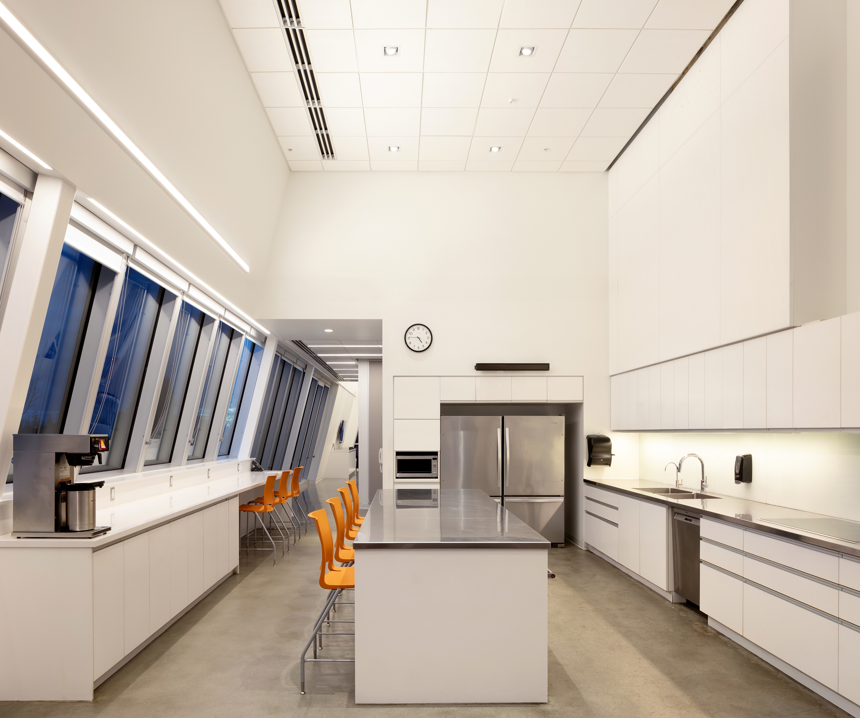 Sophisticated lighting control system along with vacancy and daylight sensors and time-schedule with local and emergency call override reduce the electricity consumption. Most luminaires are Canadian-made to lower CO2 emissions, and many LED-boards are replaceable to minimize waste.