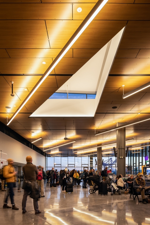 The lighting design elevates the architecture by seamlessly integrating illumination within the building's facades, accentuating their geometries and materials. Backlit yellow panels clearly define critical wayfinding points and intuitively guide passengers throughout the facility. Lighting integrated into handrails accentuates the sweeping curve of the plaza and provides walkway illumination without obstructing views. Throughout, the application of straightforward lighting tools, carefully integrated with architecture, ensures that every journey through the terminal is an intuitive and visually coherent experience.