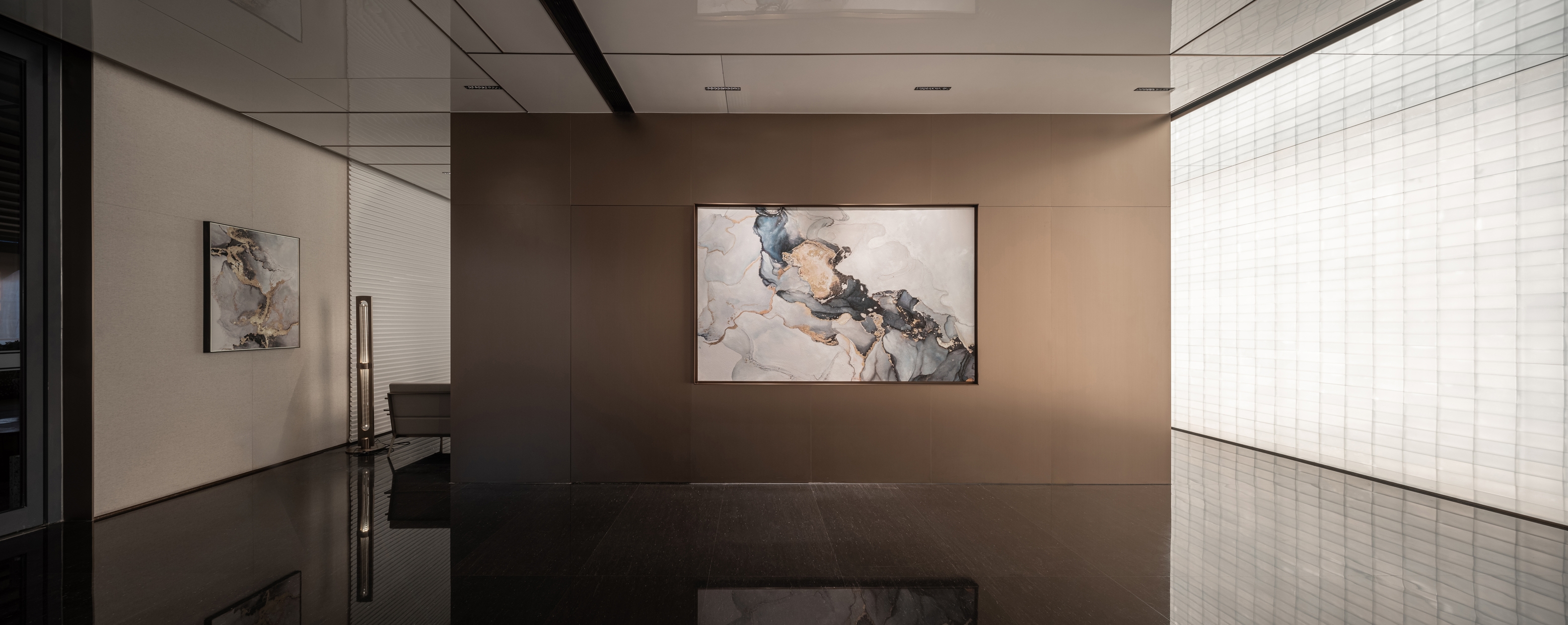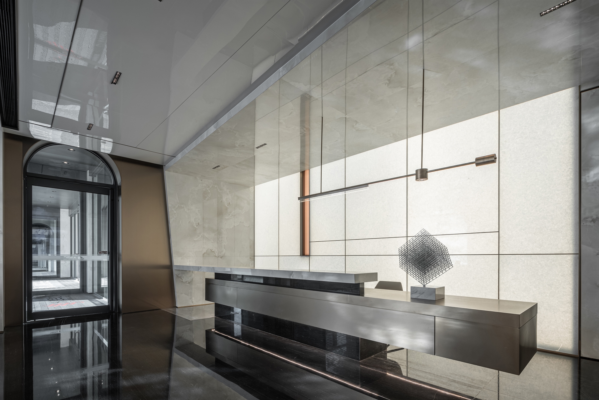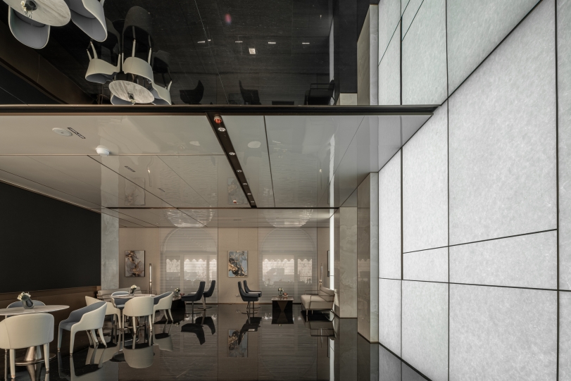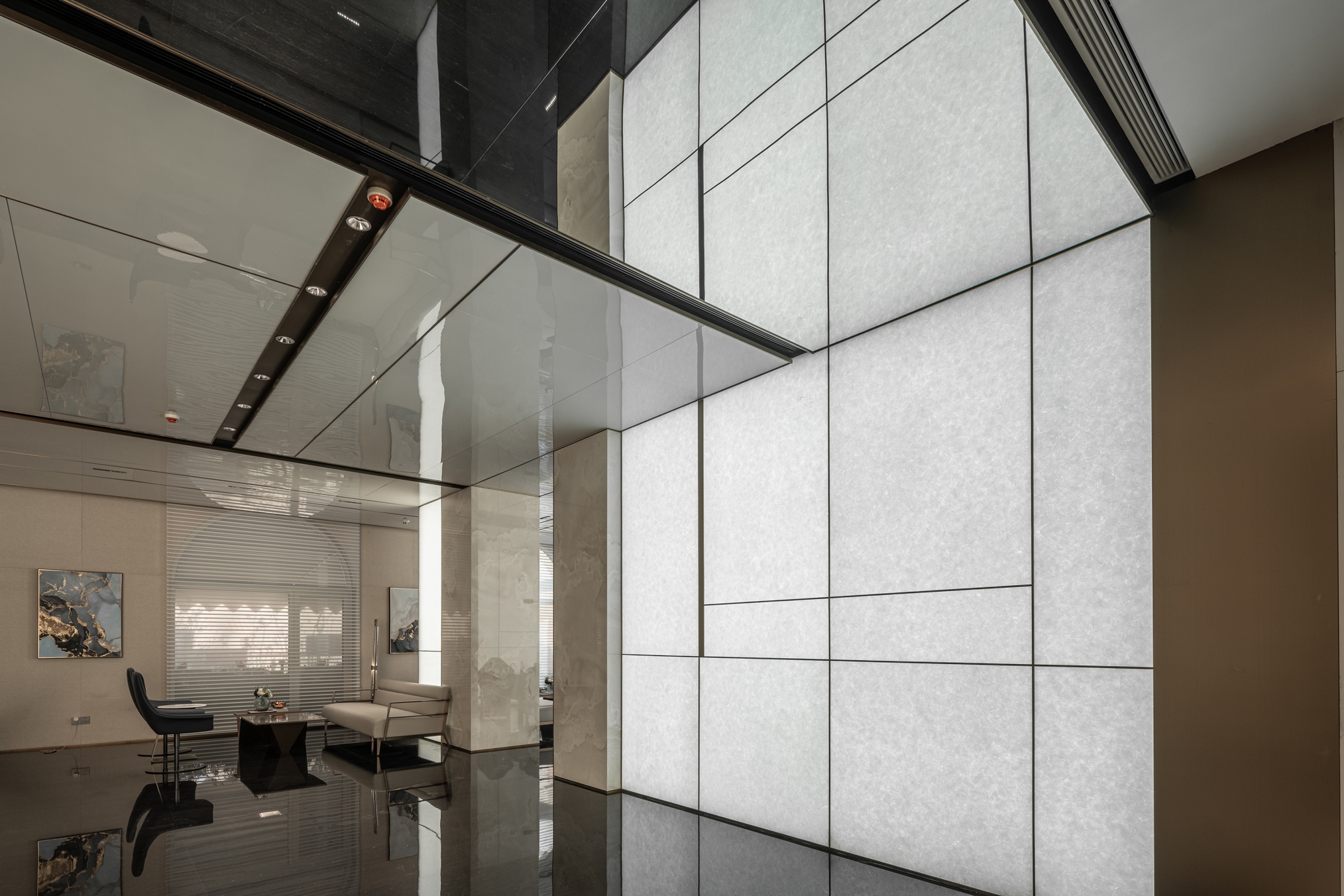Utilizing large-sized, lightweight, fusion, and recyclable Dekton Slim jade stone panels for ceiling and wall decoration, achieving seamless integration between the walls and ceilings, enhancing aesthetic appeal, and expanding the visual perception of space.