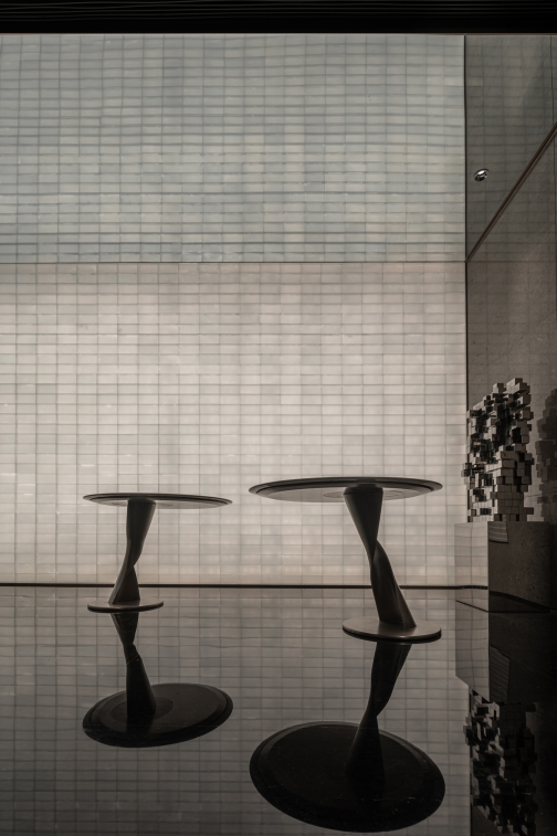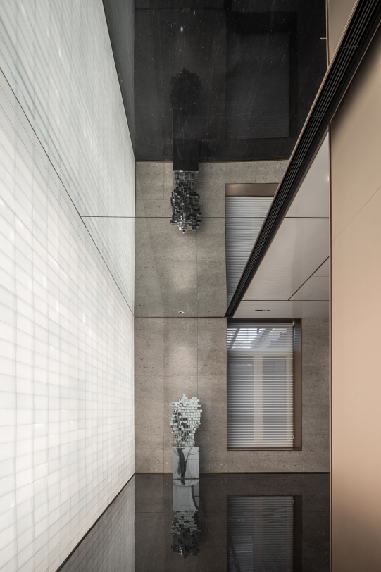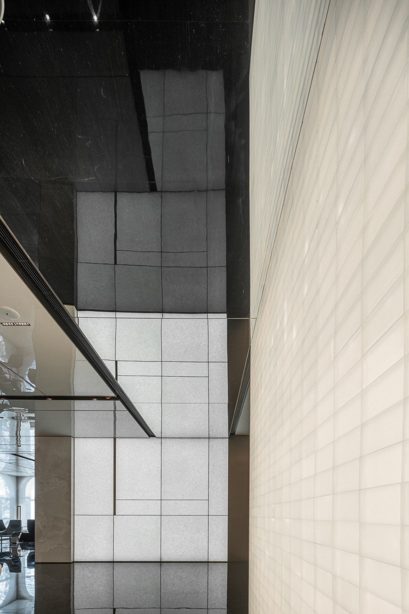 The walls are made of translucent jade glass (an eco-friendly recycled material), with LED strips installed inside. The light passing through the jade glass overcomes the dimness of the space.