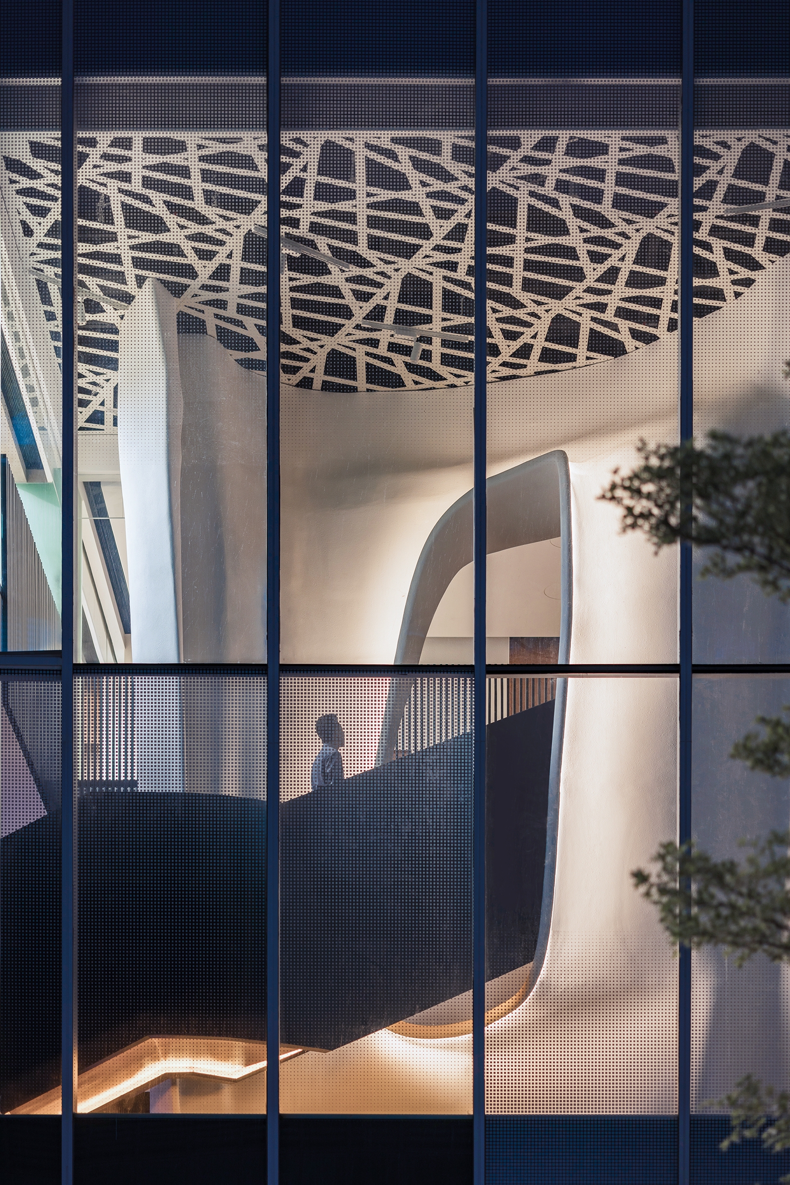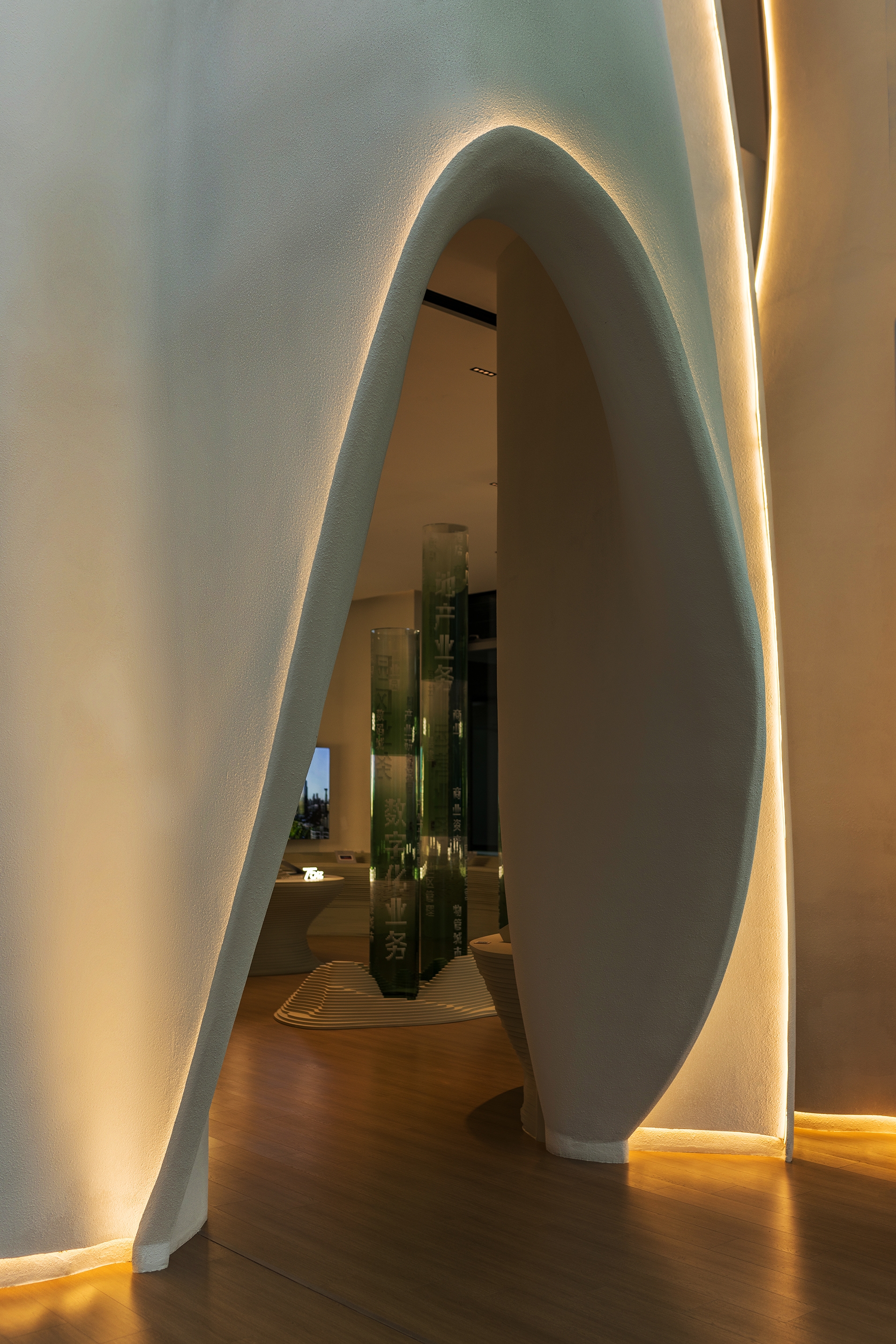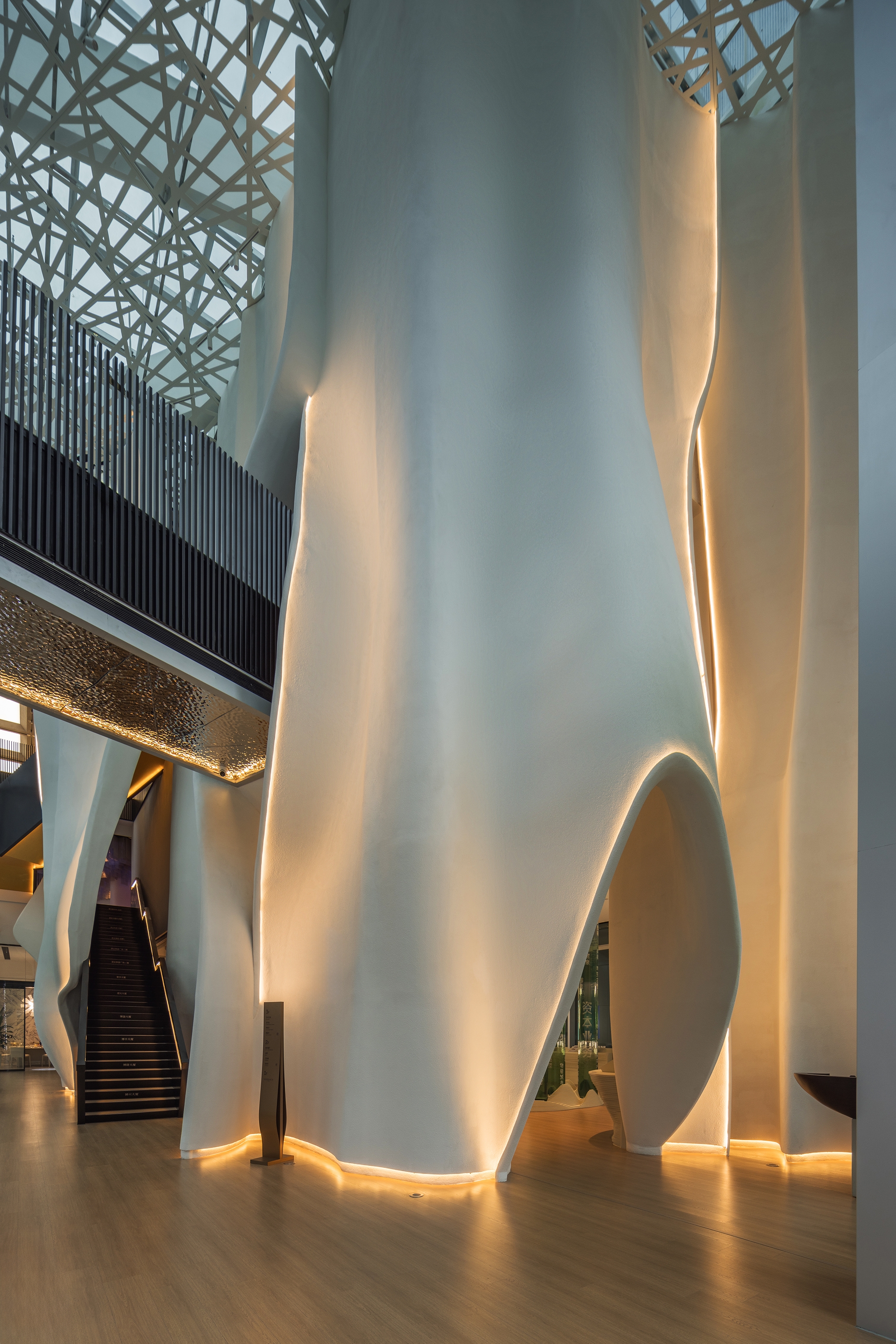 The lighting effectively showcases the smooth and fluid wall facades, continuing the exploration of space under natural daylight, and fully displaying the architectural charm.