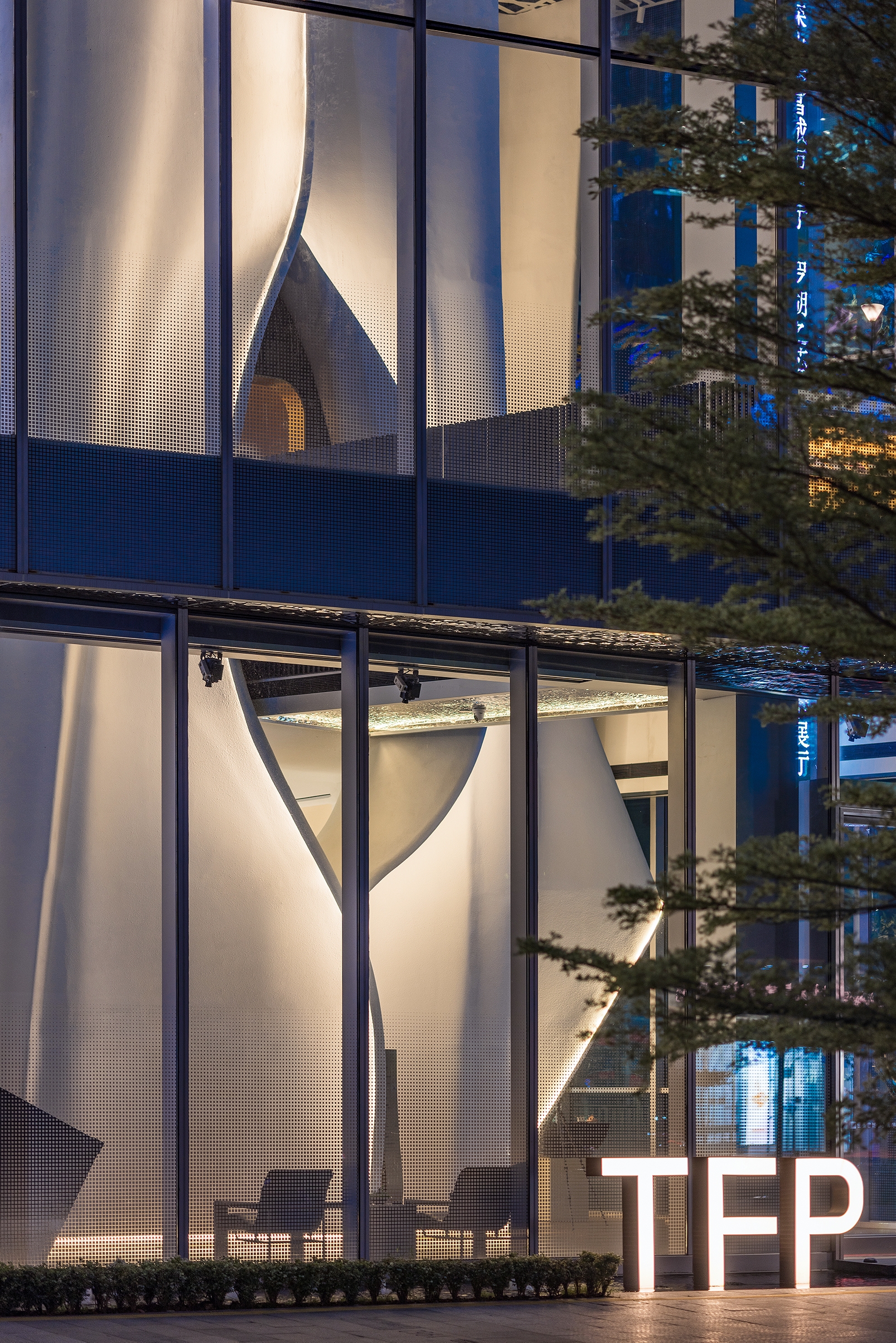 The lighting delineating the GRG-shaped forms creates a vibrant stage-like space visible from the street. Like unveiling a delicate veil, it stands as a charming structure in its environment. The shifting light scenes add mystery and allure to the indoor space.