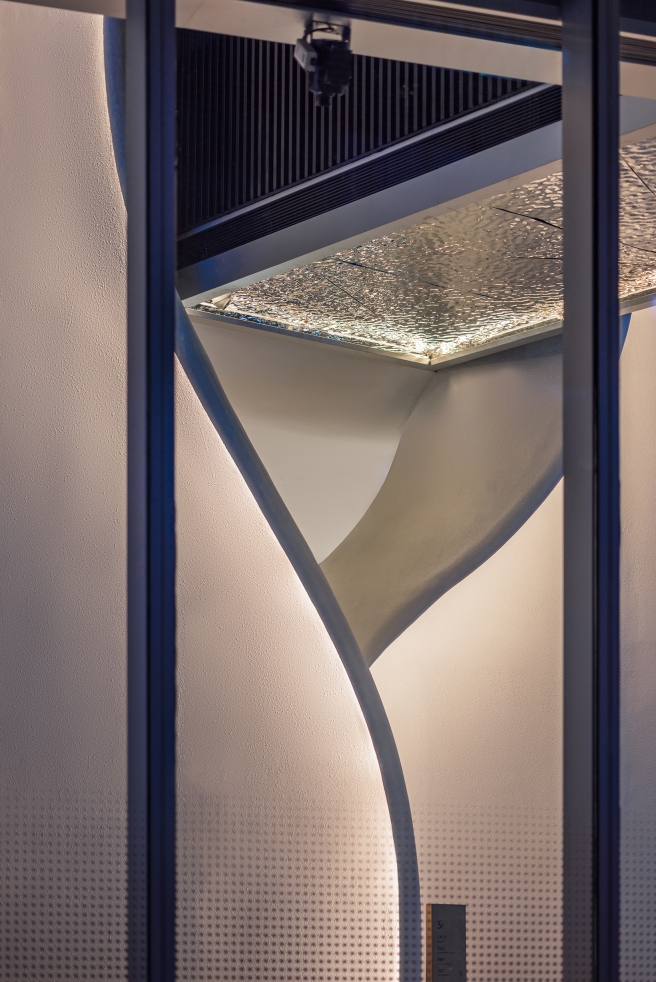 Sustainability Approach Using flexible LED light strips, the lighting follows the irregular contours of the GRG walls, concealed within grooves while enhancing the elegant curved surfaces of the walls, softening the perception of space and emphasizing its fluidity.