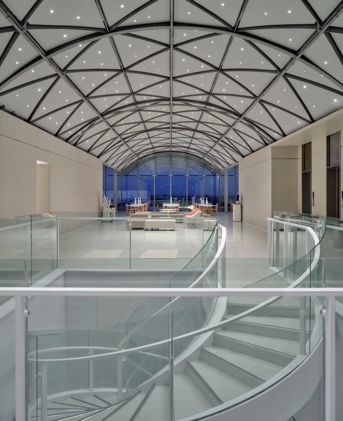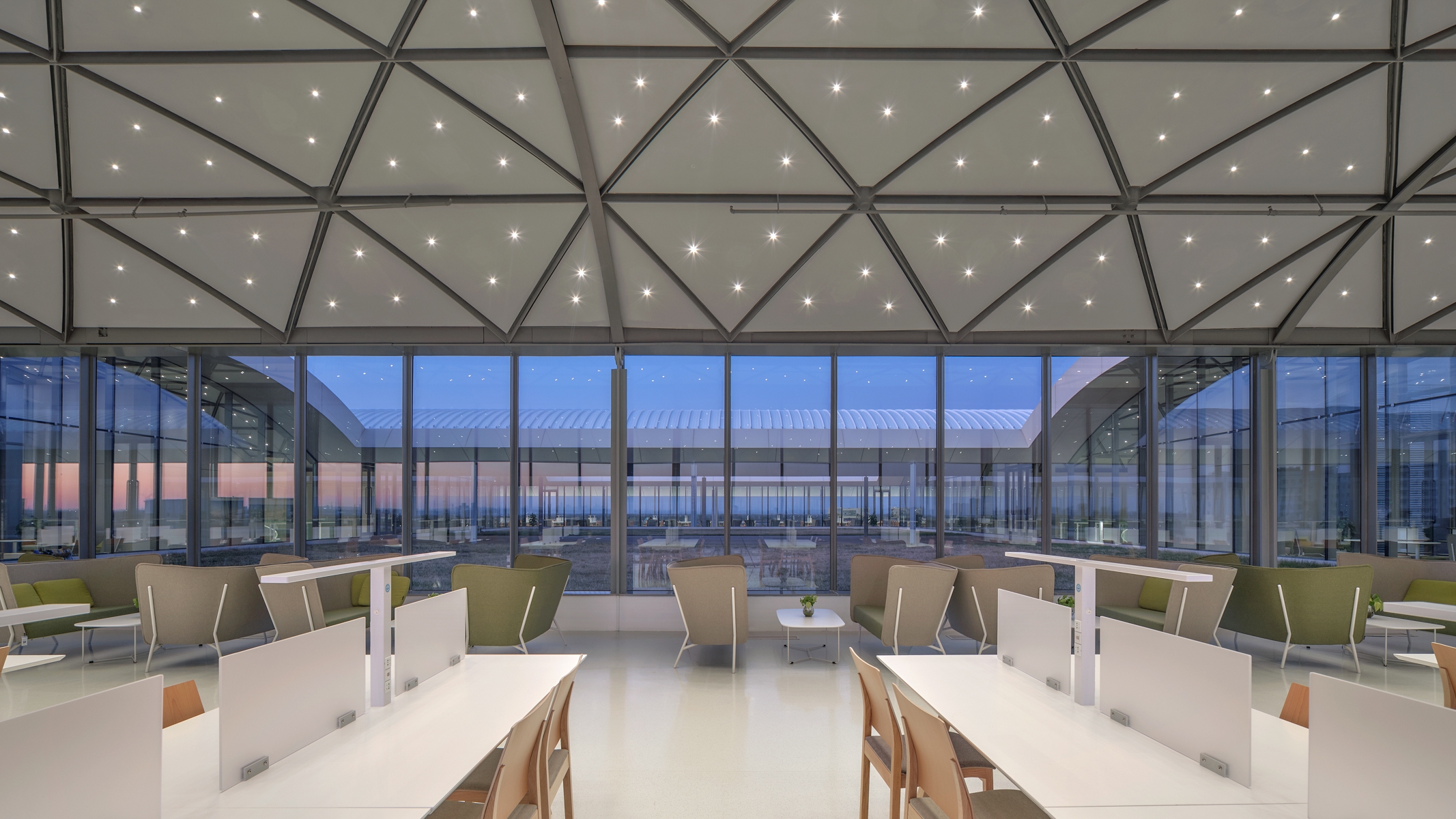 The lighting design integrates architecture and interior elements, creating a cohesive night environment. Linear lights on the cabin and ceiling form a clean, unified atmosphere. The transparent glass walls of the Cloud Top reveal ceiling lights resembling scattered starlight, adding imagination to the library. Small cylindrical lights simulate a starry sky, with a wavy, arc-shaped ceiling divided by triangles. Using RHINO+Grasshopper software, the design team simulated a random lighting layout. Functional lighting, with top lights and desk lamps, uses a 4000K color temperature and CRI90 for a comfortable experience. DMX512-controlled top lights blink hourly, replacing the traditional bell system.