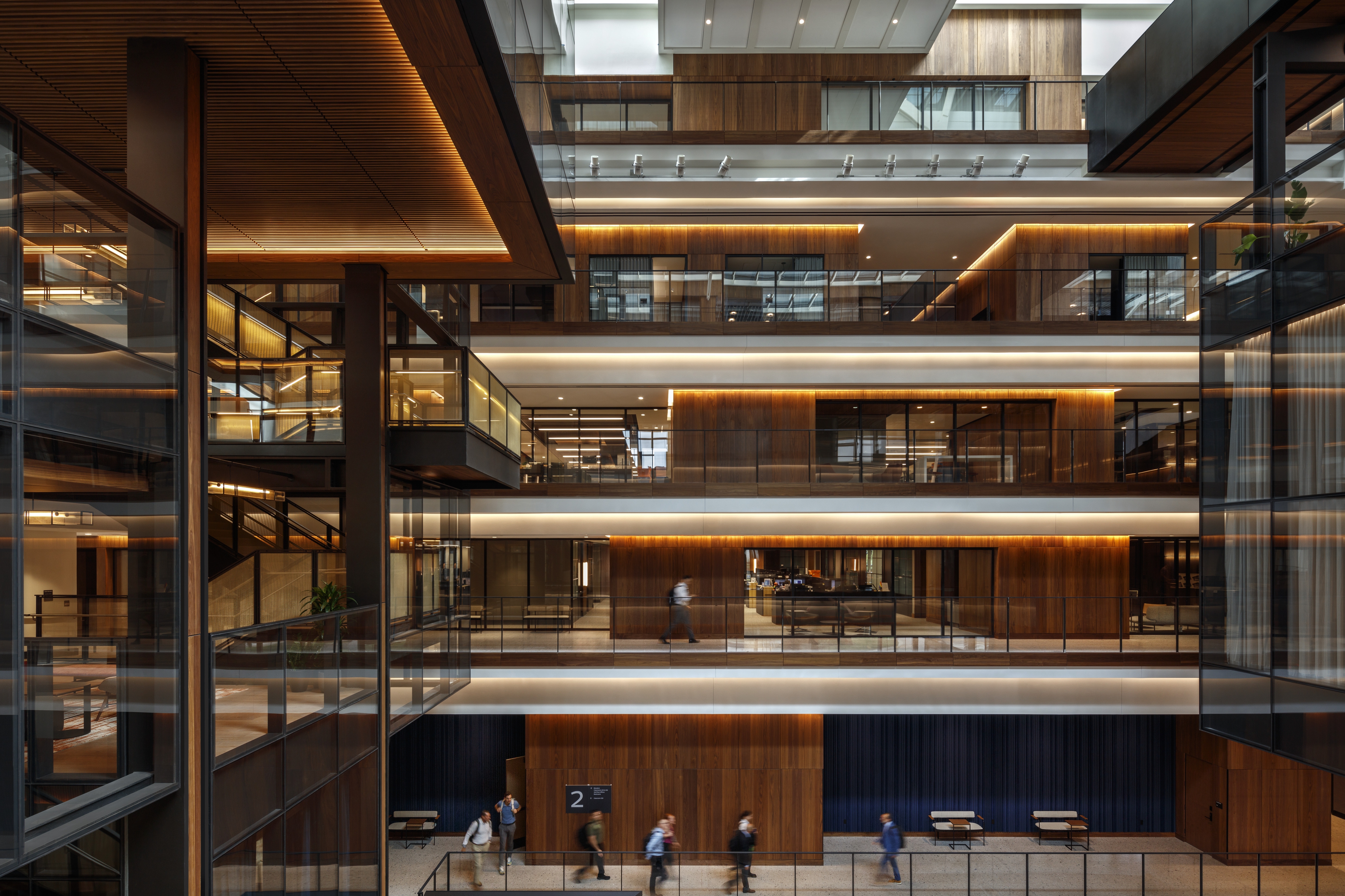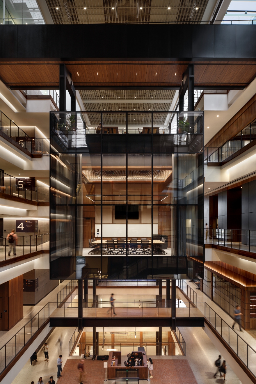 The lighting concept Revealing Impression enhances the renovation by highlighting geometrical and material interjections within the existing architecture. Complex geometry challenged the team to provide an easily maintainable yet elegant lighting scheme. Concealed, warm-CCT ambient fixtures and surface brightnesses provide illumination; cove fixtures at each floorplate edge visually extend the appearance of daylight cascading down to the lower levels and distributes volumetric illumination throughout the atrium. Accent layers introduce a human-scale and reinforce the sense of hospitality within this premier educational building.