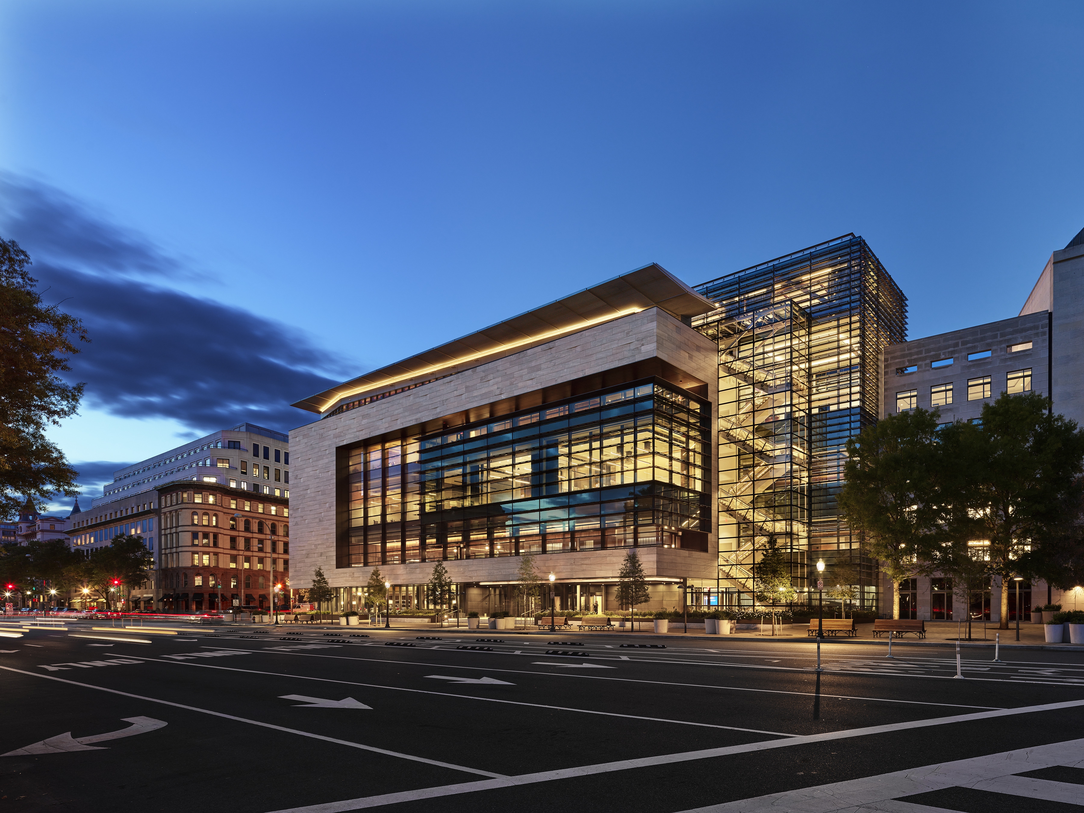 Entry DescriptionJHU acquired and renovated the Newseum, located on a major Washington D.C. avenue, to establish a prominent identity, create a world class academic building, and establish a convening destination for trusted experts and global policy leaders. The spaces adjacent to the elegant new façade house amenities, libraries, and classrooms. The central atrium consists of suspended, cascading classrooms and lounges with a wrapping staircase.