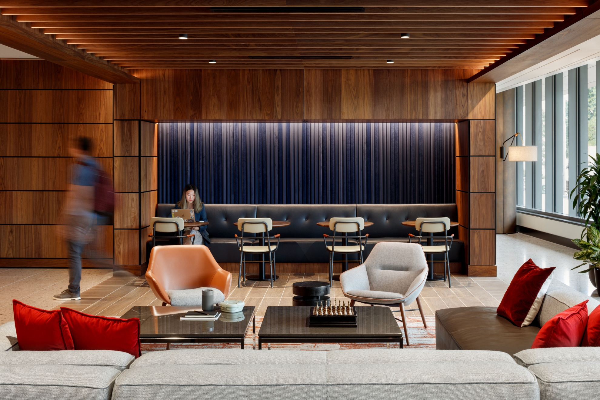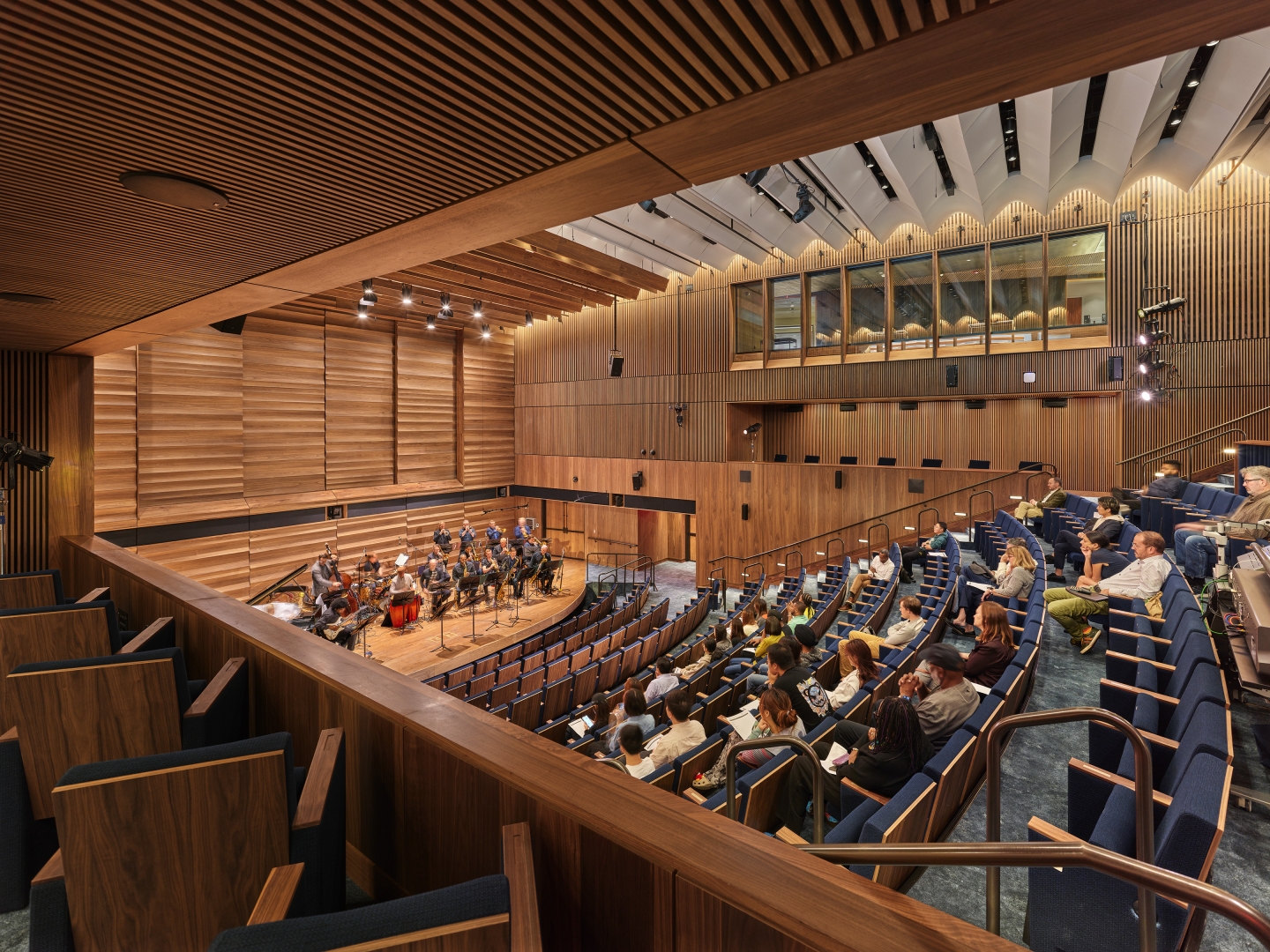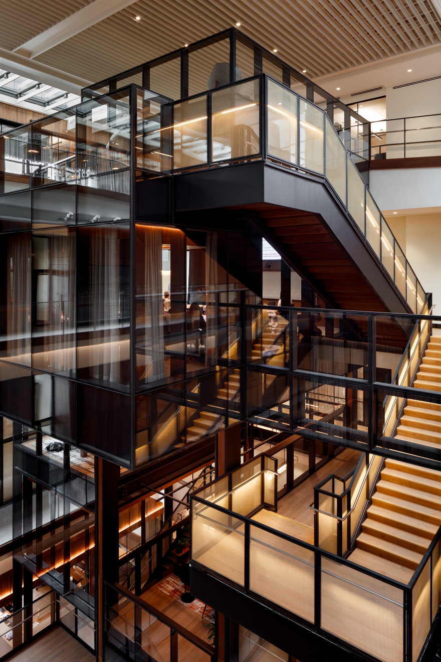 Along the stairs, integrated handrail LEDs provide transitional illumination and easy maintenance. High-CRI artwork illumination provides focal interest while balancing brightnesses with general architectural lighting. In the wood-clad theater, a layered lighting approach creates a flexible and iconic design.
