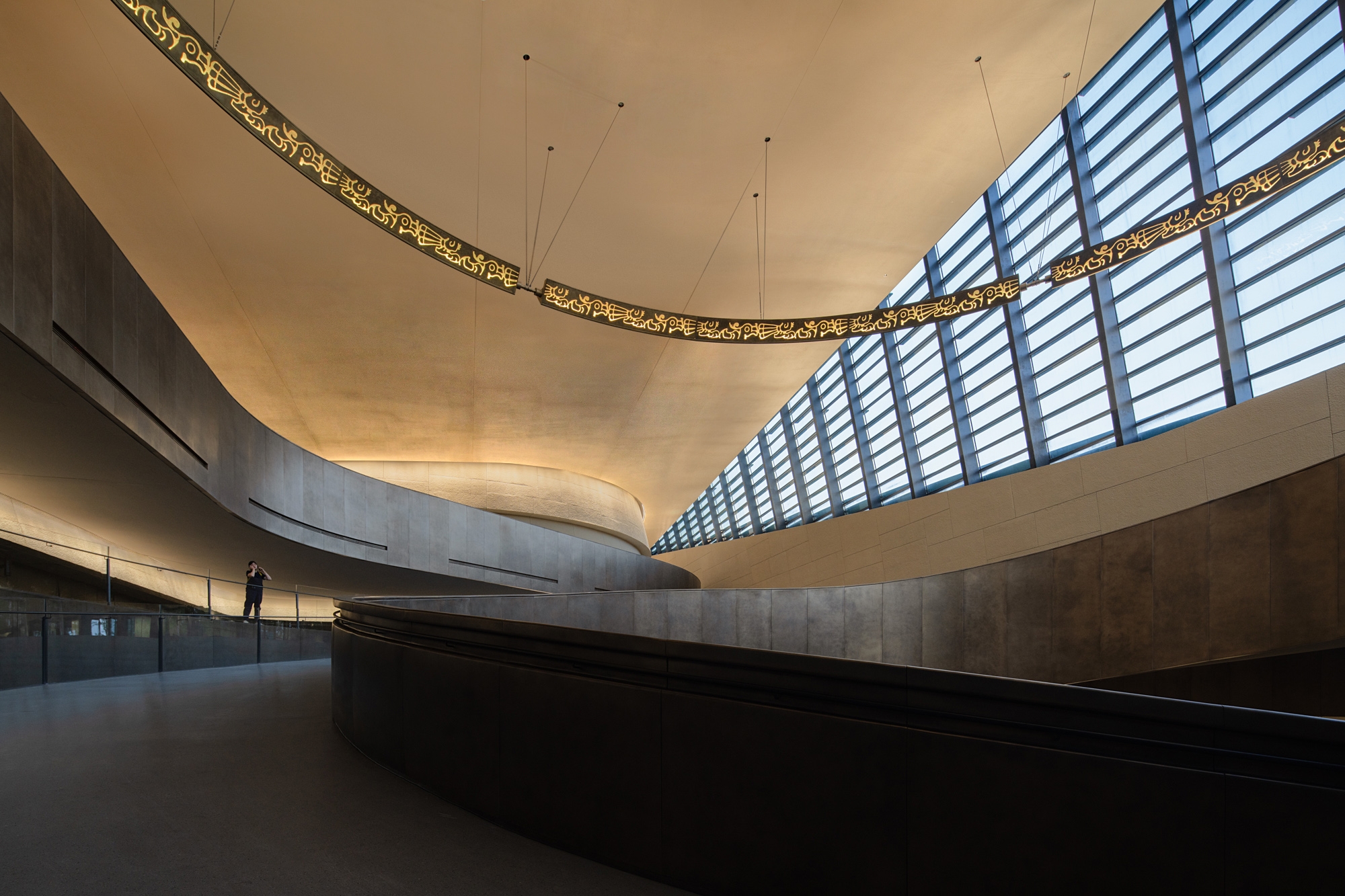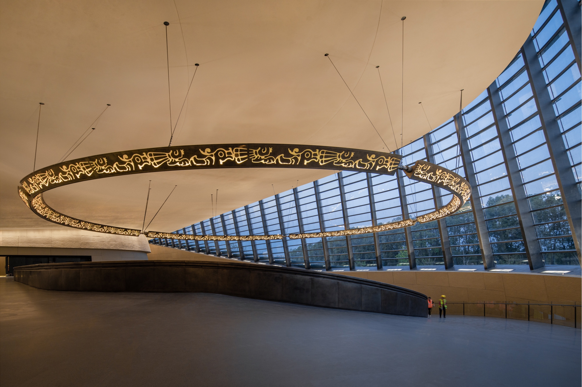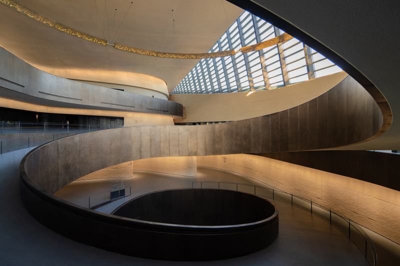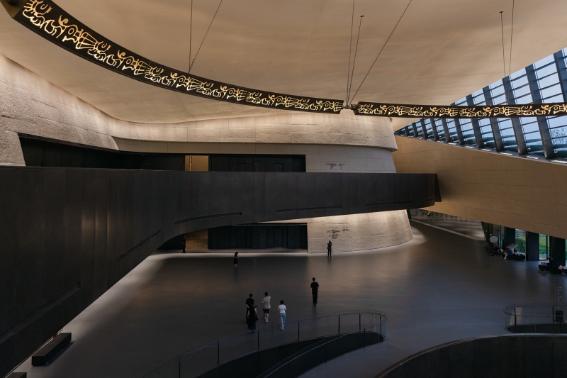 Entry DescriptionThis is a space where there are no lamps at all but only light. The lighting of the large span of space is all done by indirect light. The brightness and darkness of the space have dramatic changes, highlighting the mystery of the Sanxingdui. When night falls, the façade wall washer lights and spotlights slowly light up one after another, as if the "eyes" slowly open to see the world. The totem pattern of the hanging ring is clearly lit. The civilization of a thousand years is presented in front of our eyes.