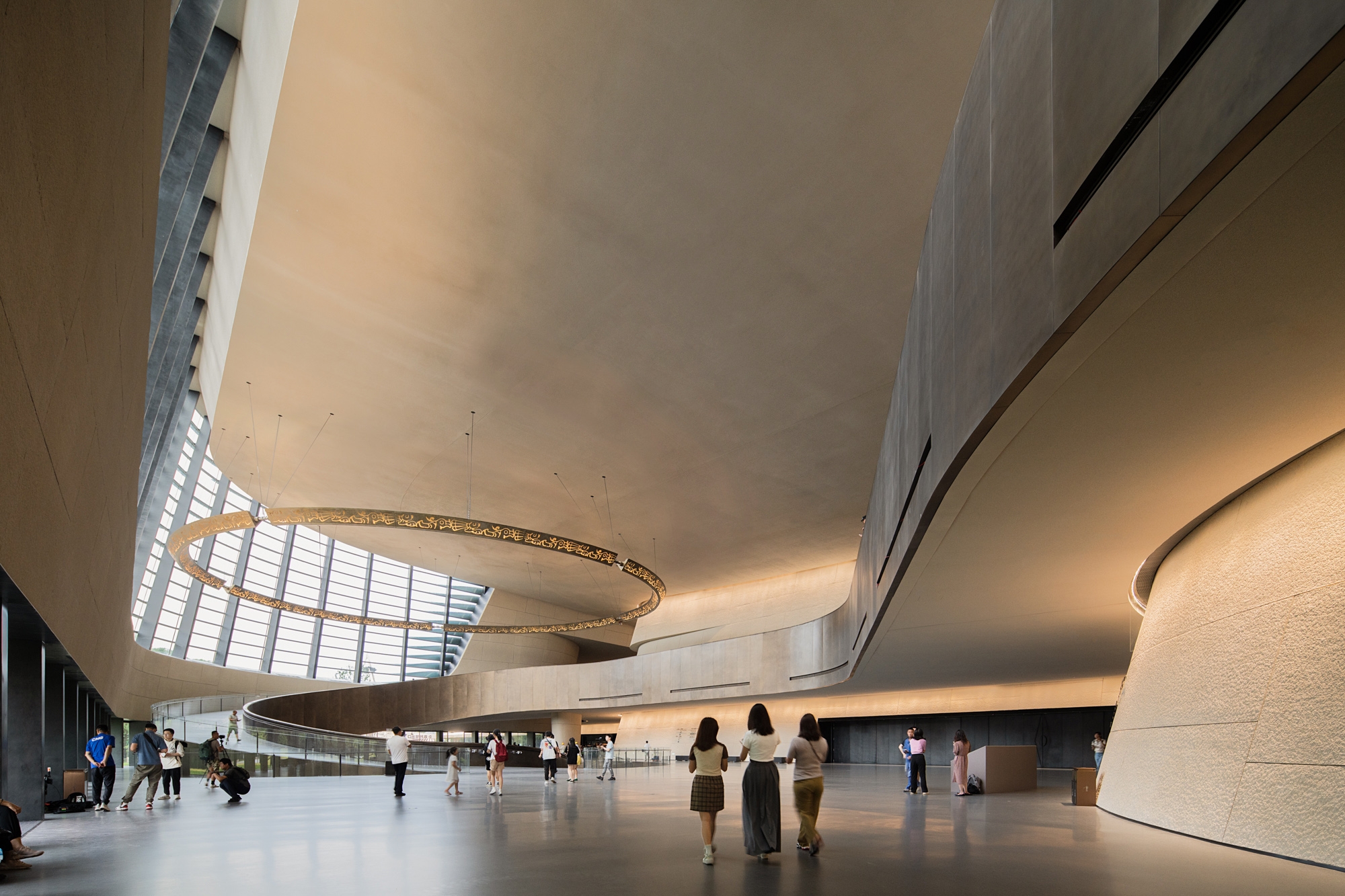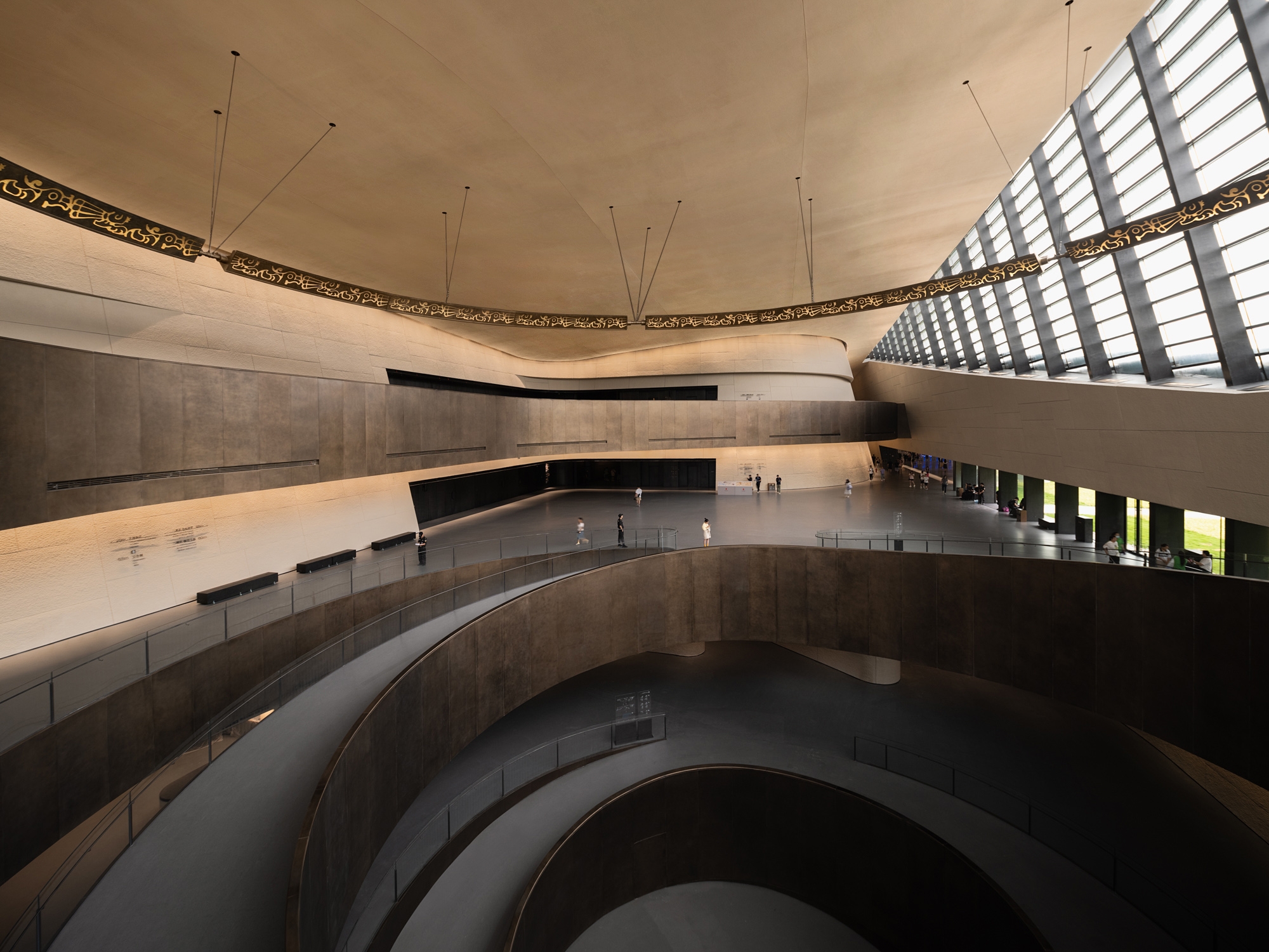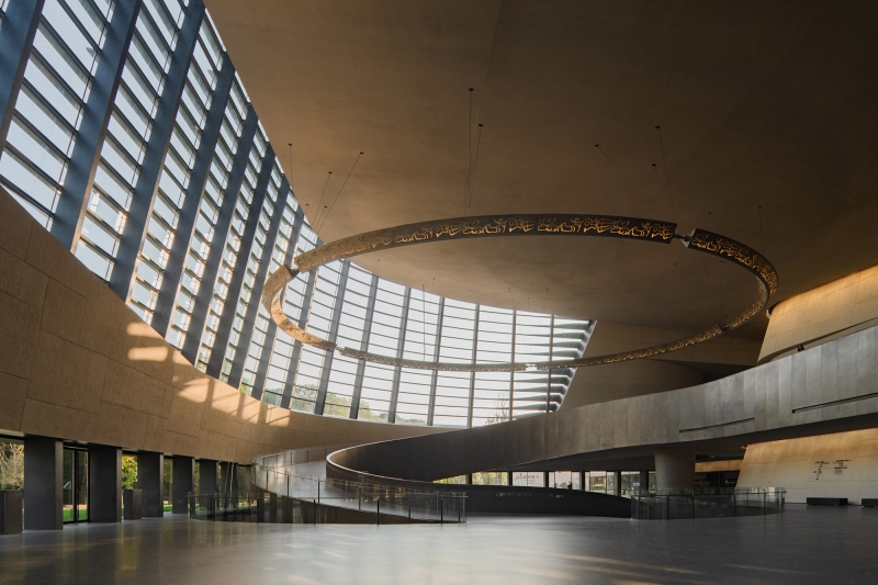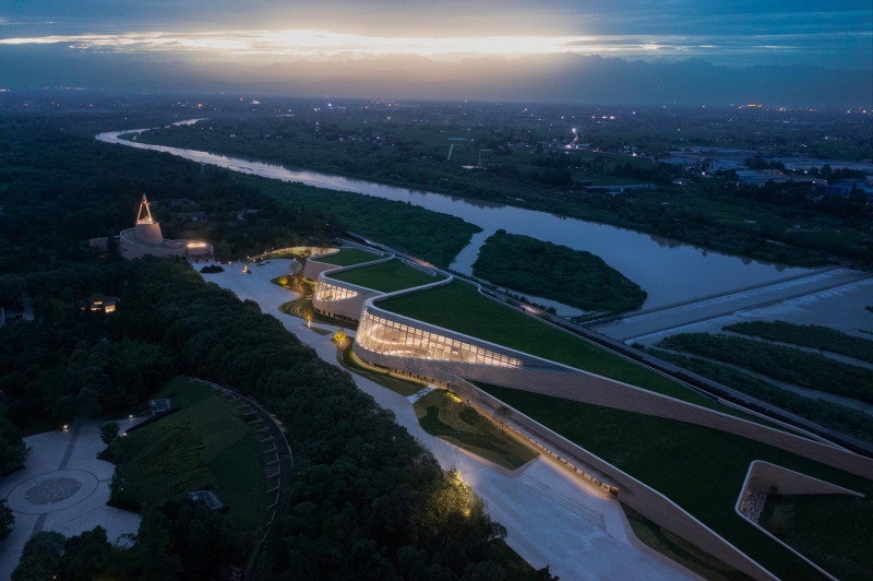 Entry DescriptionThis is a space where there are no lamps at all but only light. The lighting of the large span of space is all done by indirect light. The brightness and darkness of the space have dramatic changes, highlighting the mystery of the Sanxingdui. When night falls, the façade wall washer lights and spotlights slowly light up one after another, as if the "eyes" slowly open to see the world. The totem pattern of the hanging ring is clearly lit. The civilization of a thousand years is presented in front of our eyes.