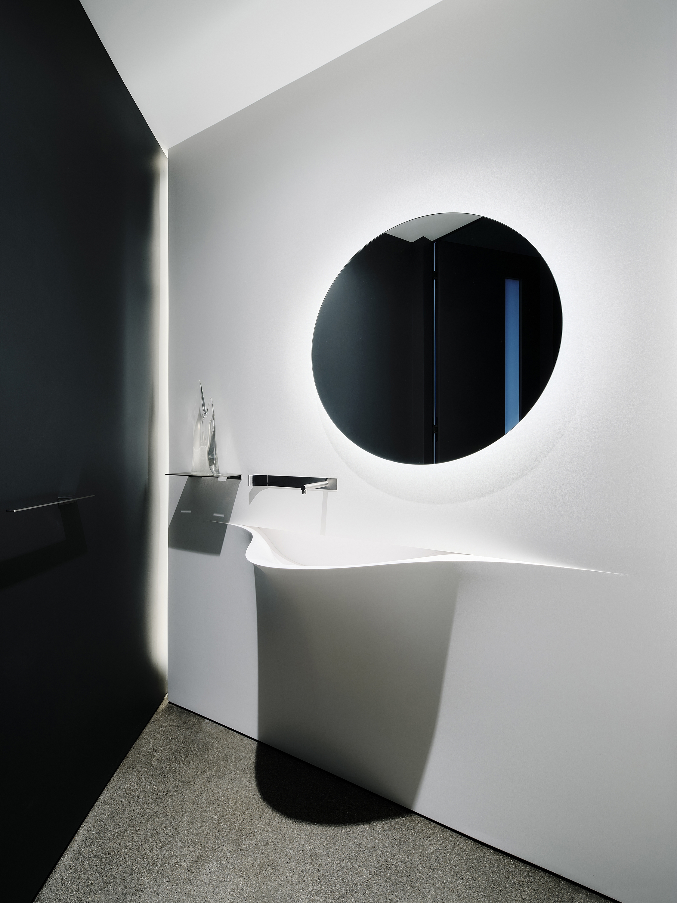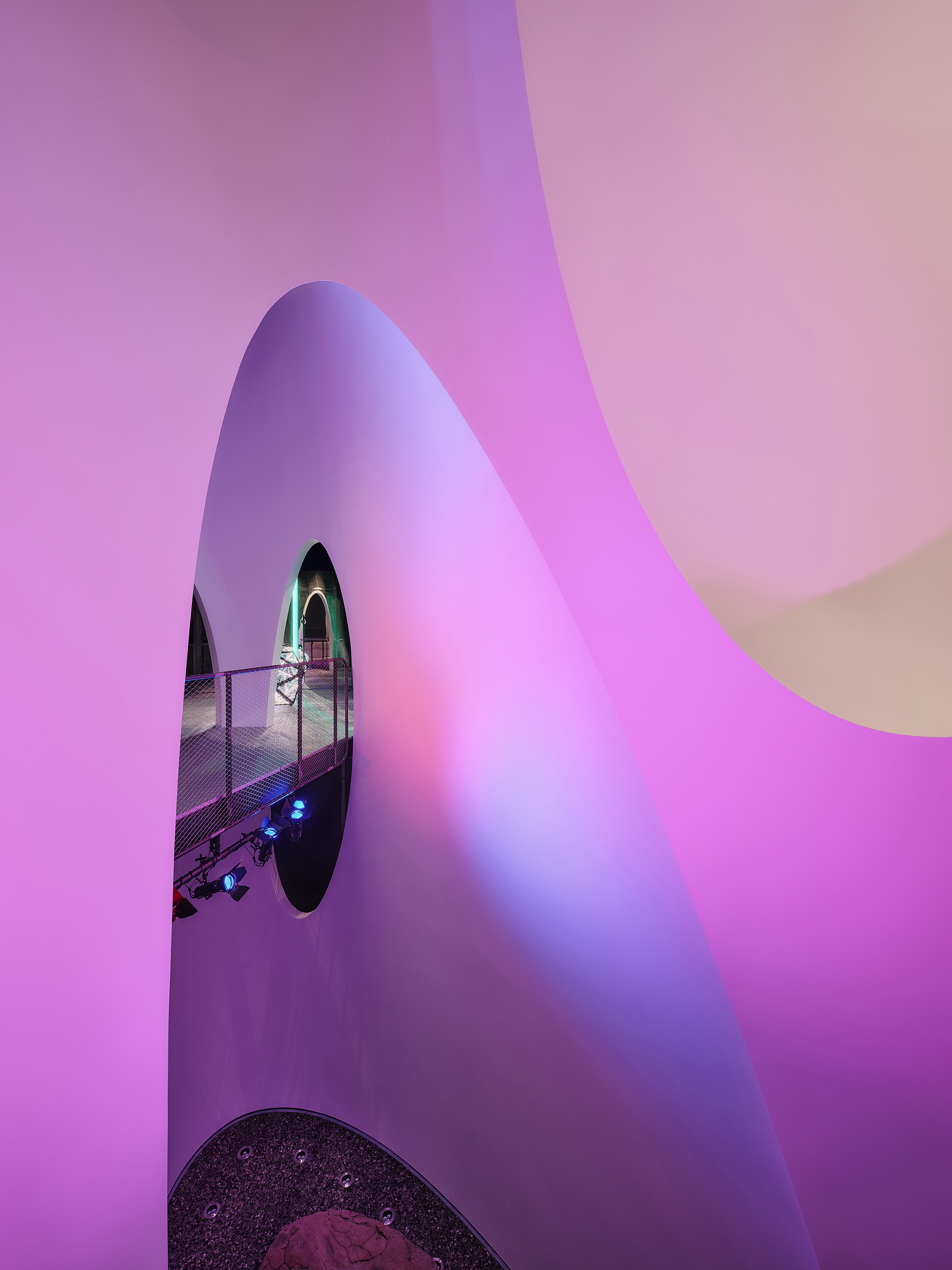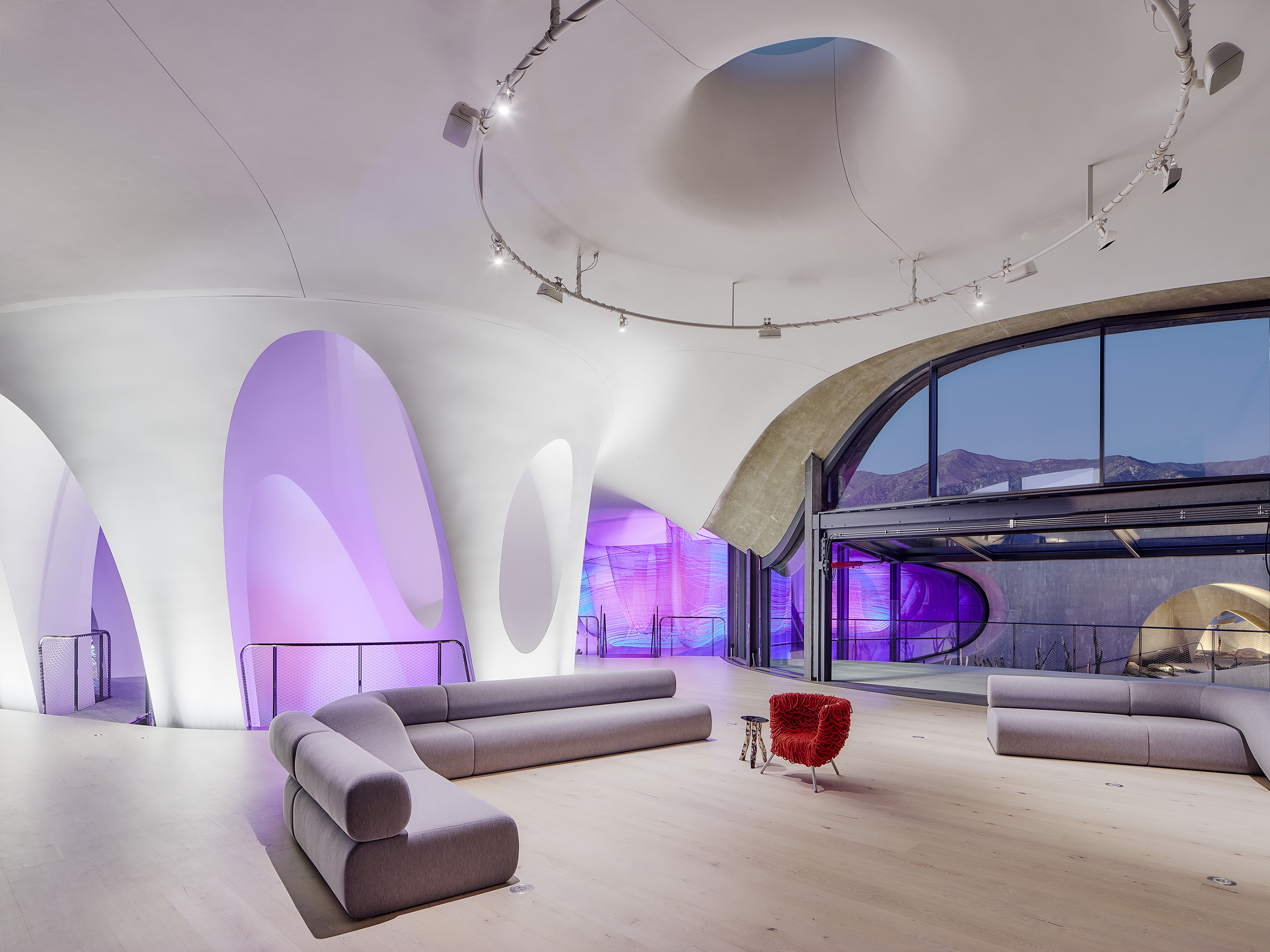 Layers of light are deployed to wash surfaces, separate floor from wall from ceiling, and reveal the sumptuous forms of the architecture. At the “The Canyonlands”, the nexus of the curving geometry, layers of light include ceiling recessed wall washers, recessed in-floor elliptical spots, modular bendable linear grazer, aimable 7-color-chip theatrical spots, modular bendable linear RGBW, and in-floor RGBW spots.