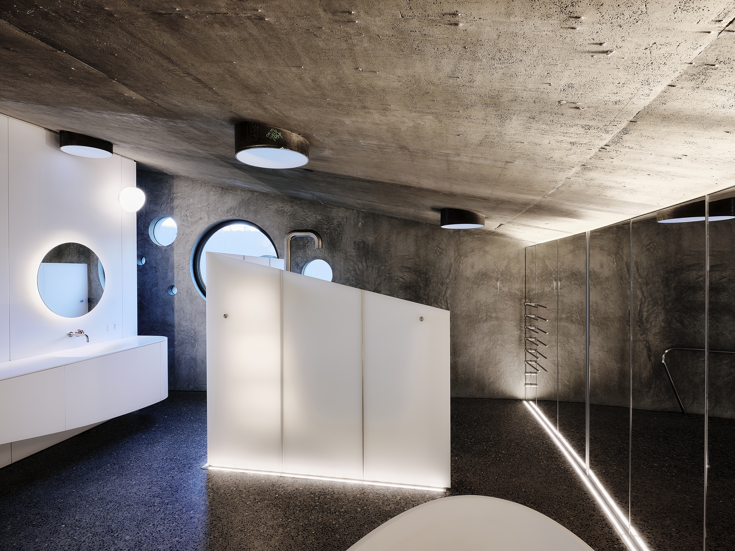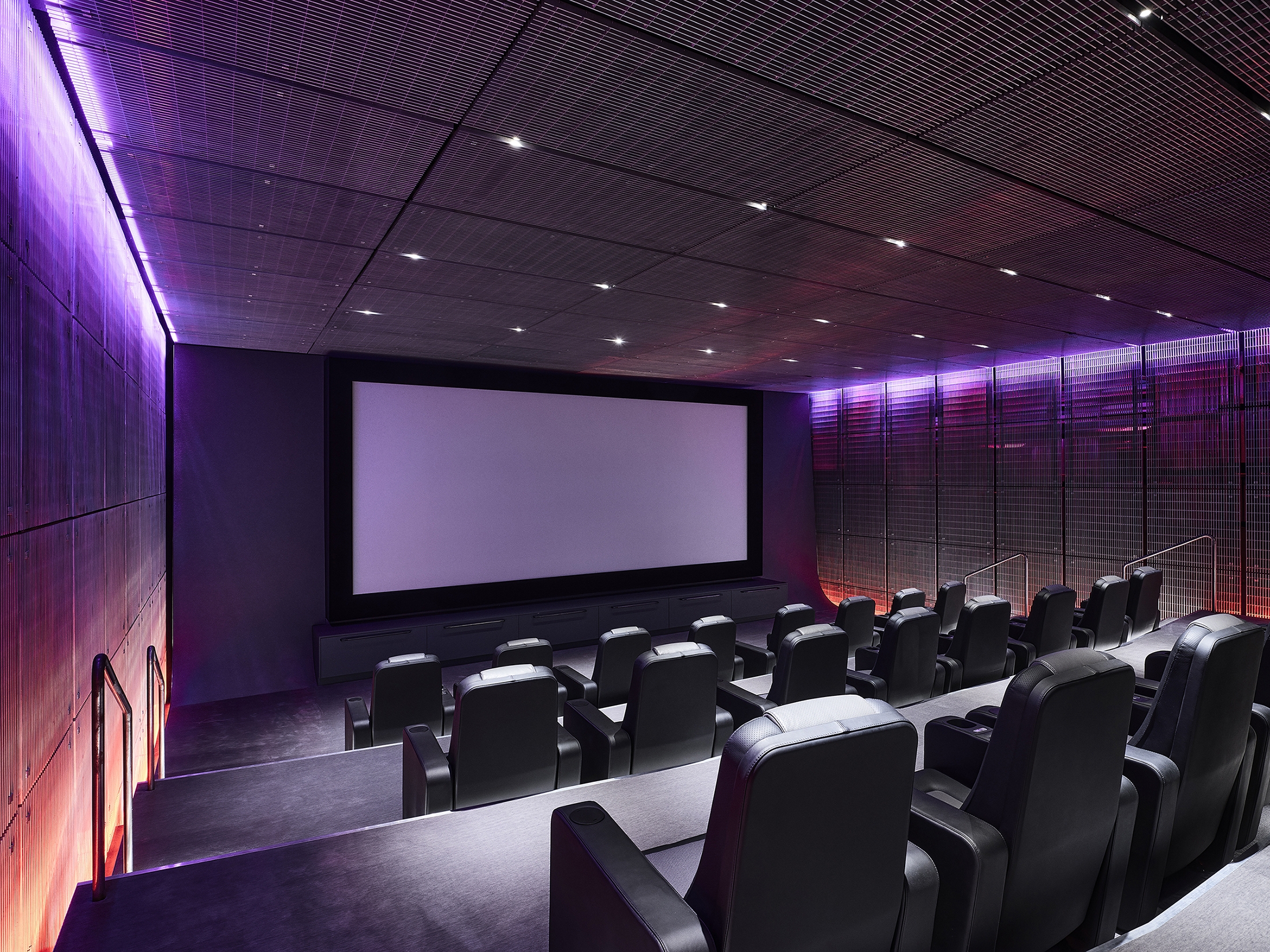 The theater, with contrasting planar geometry, employs the strategy of washing surfaces and separating planes in a different way. RGBW linears behind, in front, above, and below the grated side walls paint complex colored gradients while concealing and revealing the audio and acoustic wall treatments. Concealed linears highlight the stepped floor geometry while providing wayfinding. These strategies are also played out in the master bath, and powder rooms, as well as dining and entertainment areas.