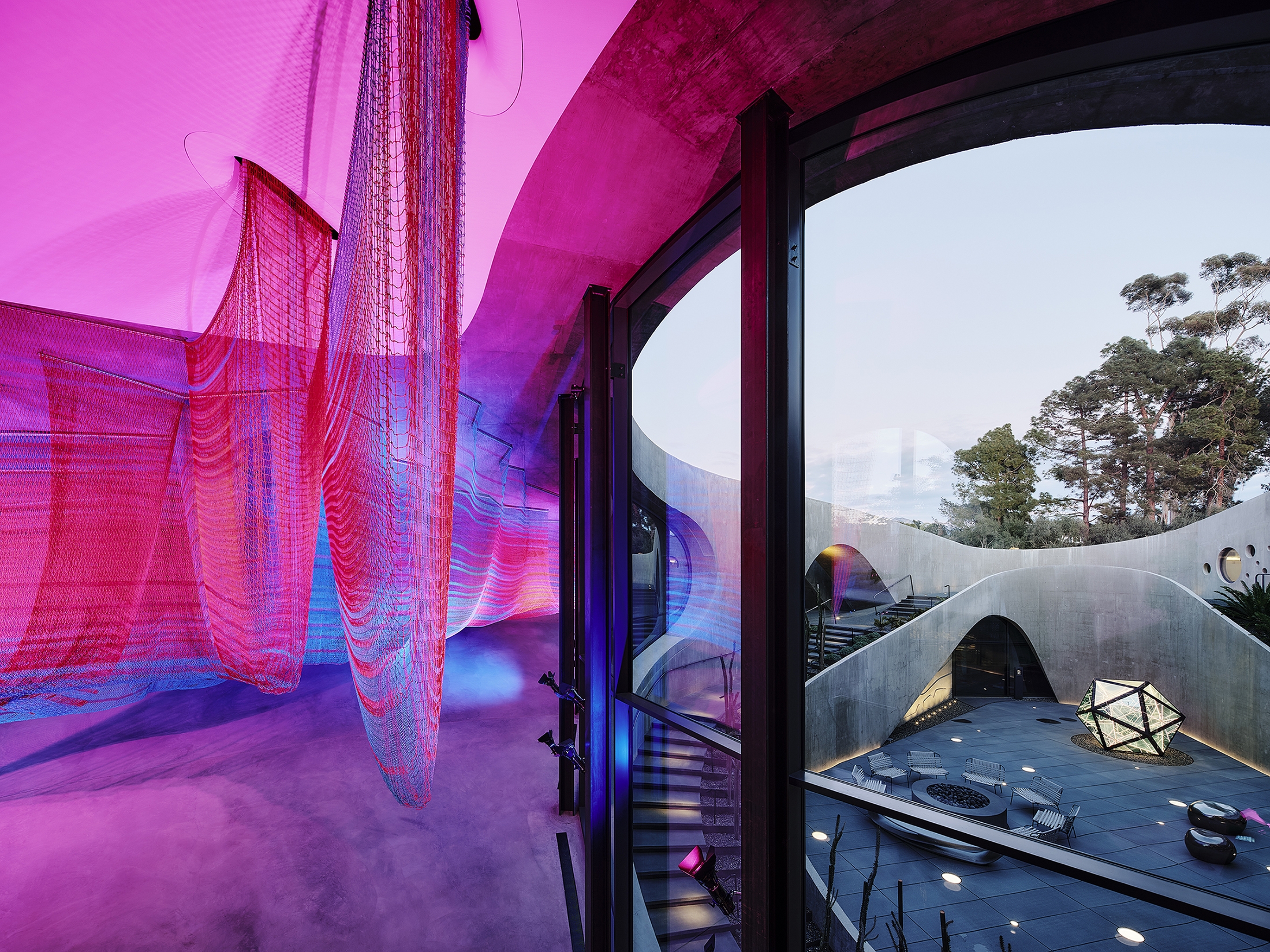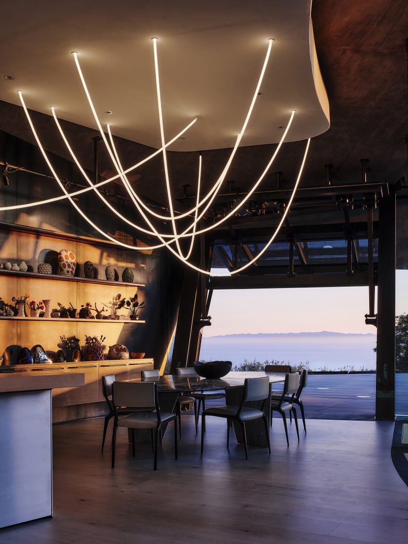 Entry DescriptionThe architecture of Hill House creates a sensuous organic interior. Lighting creates the interior experience, connecting the exterior, art, and Southern California landscape.