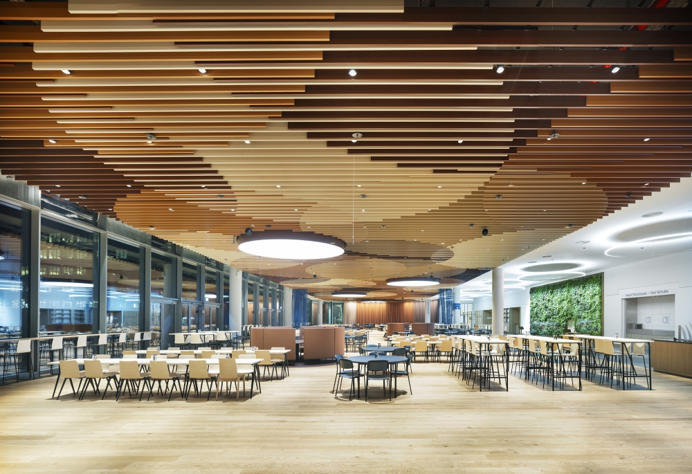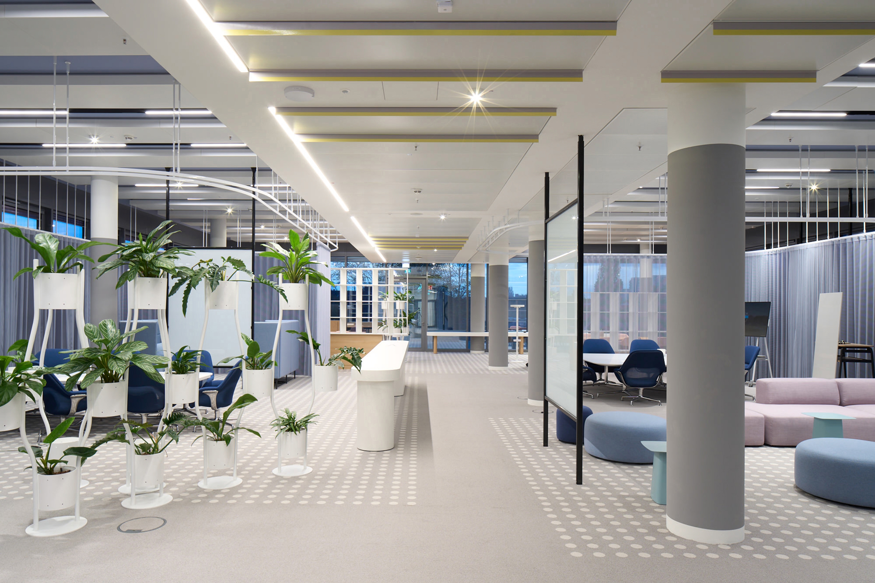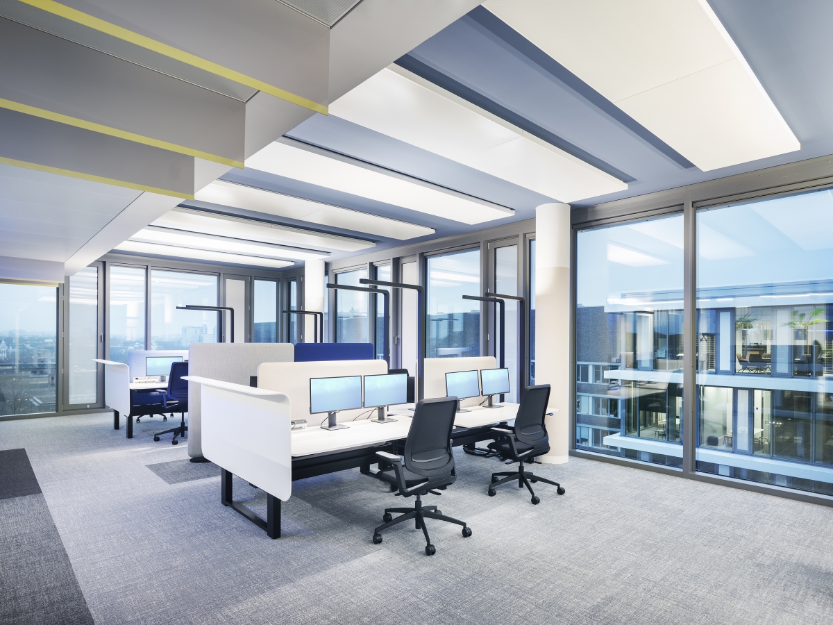 Sustainability ApproachAll open room situations such as the Communication Hub and the co-working areas are divided into sections and are gently faded in and out using motion detectors combined with timers. In all closed room types, such as the various meeting rooms and the boardroom, different lighting scenarios from transparent to intimate can be called up via a lighting control panel. The workstations for around 4,000 employees are equipped with free-standing luminaires. The free-standing luminaires have daylight and motion sensors and communicate with each other via a swarm control system. Only LED luminaires are used in the project. The entire project is LEED Gold certified.