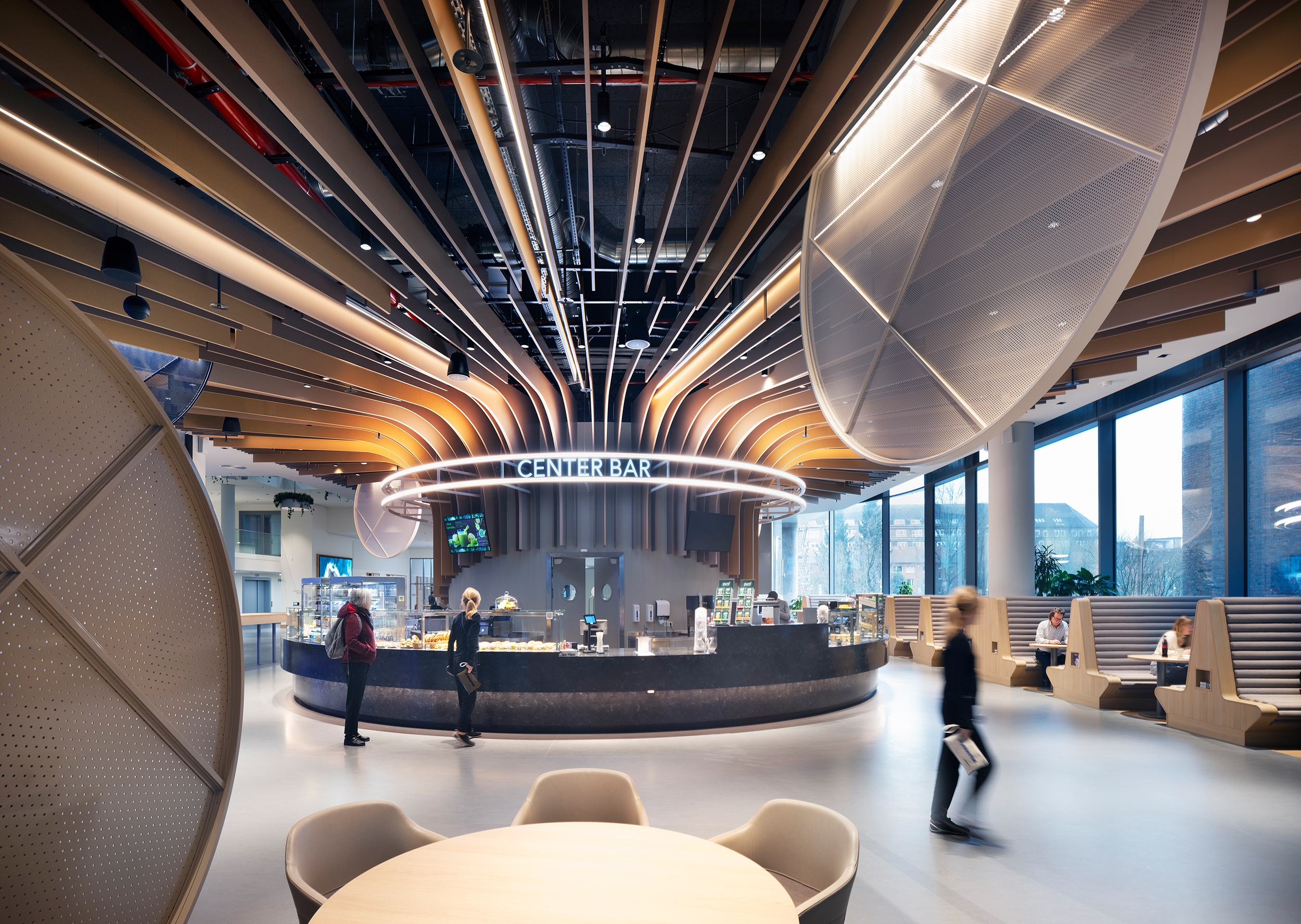 A diverse range of room and lighting configurations and formats supports this realignment with agile work practices. In the reception area, the space opens up generously via a sculptural light installation. The Working Café lives from its intimate lighting atmosphere, just as you would expect in a restaurant. The Communication Hub and the co-working areas have an open and transparent lighting design. Retreats, on the other hand, thrive on their warm and cozy lighting atmosphere.
