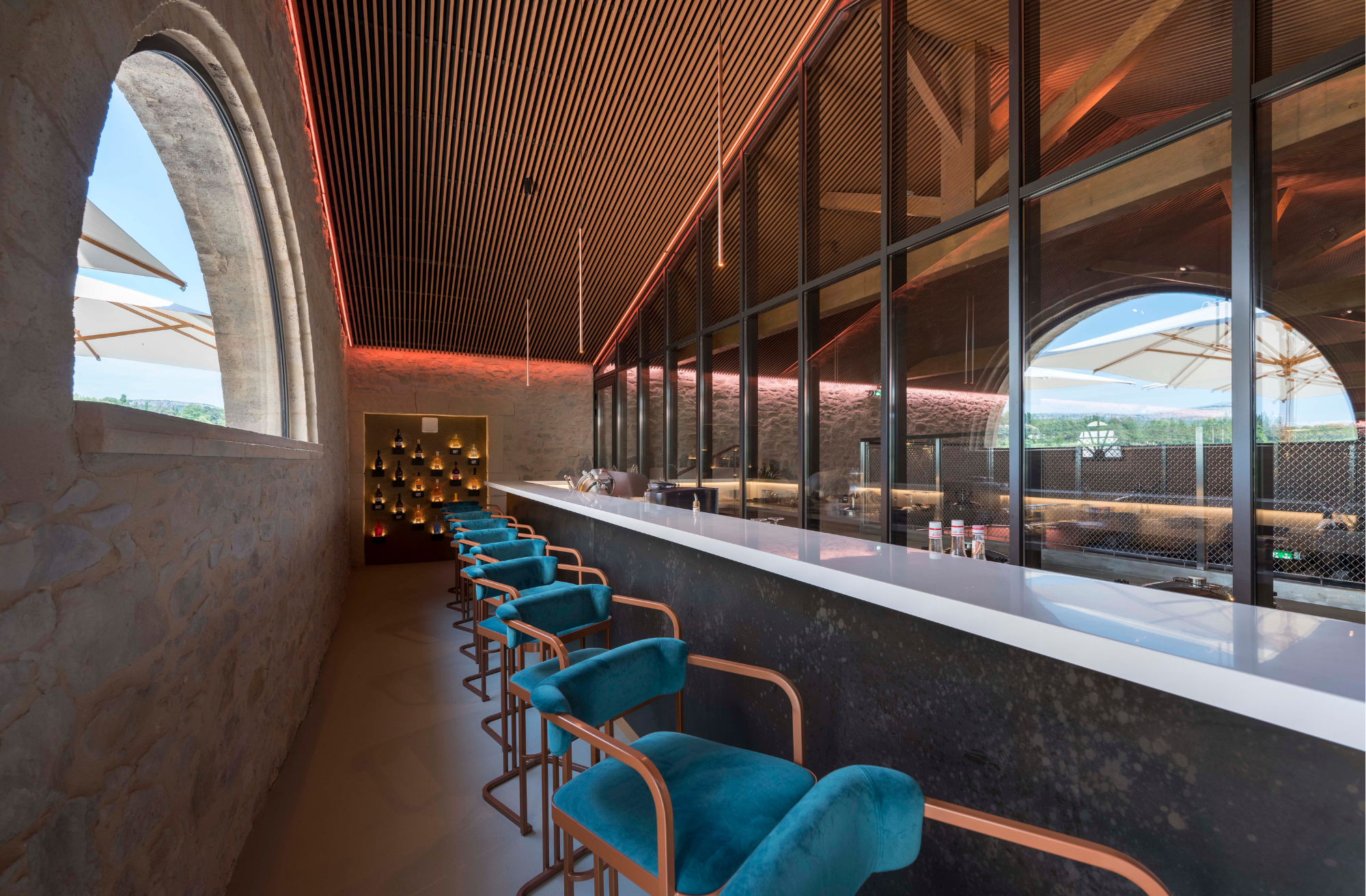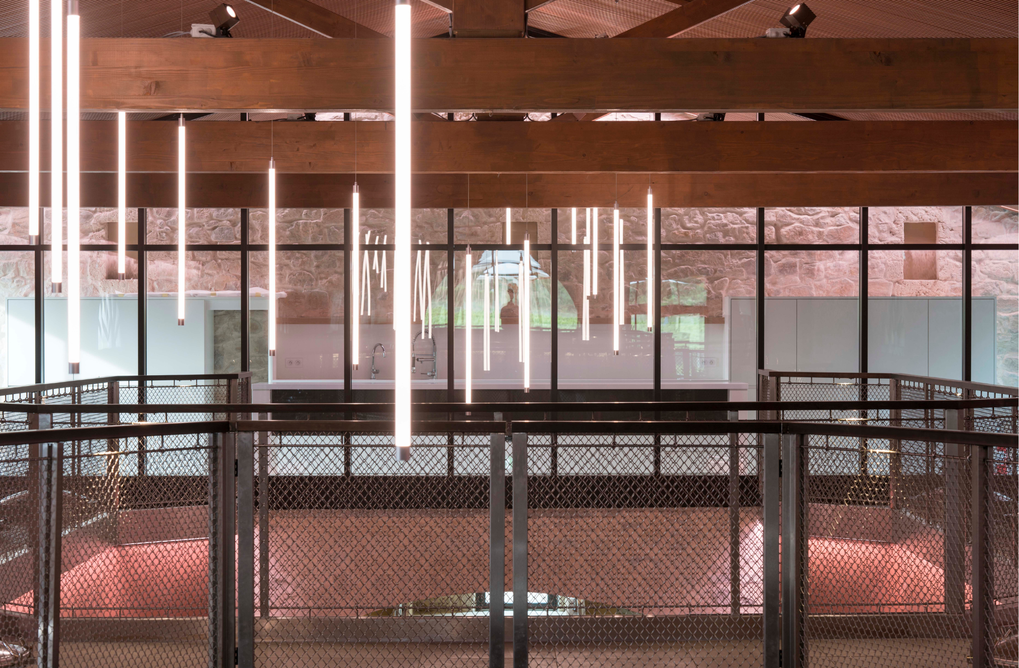 A remarkable light installation made of suspended warm light tubes guides visitors to the bar towards the laboratory where the wine was originally created.