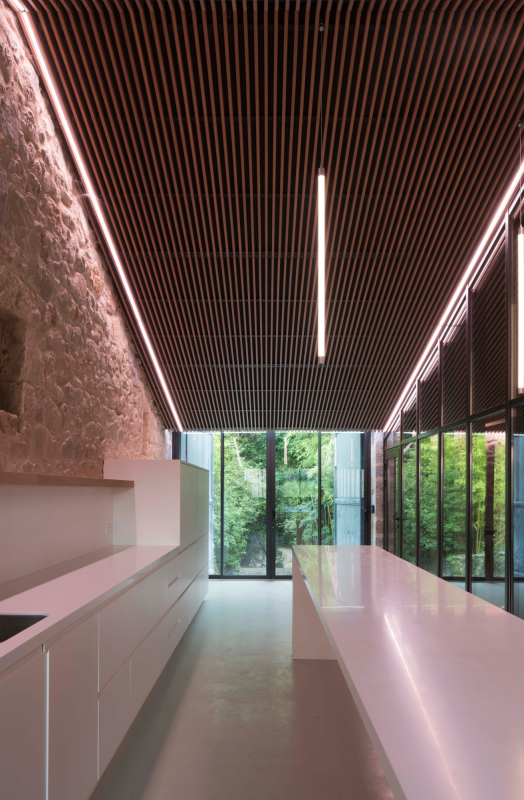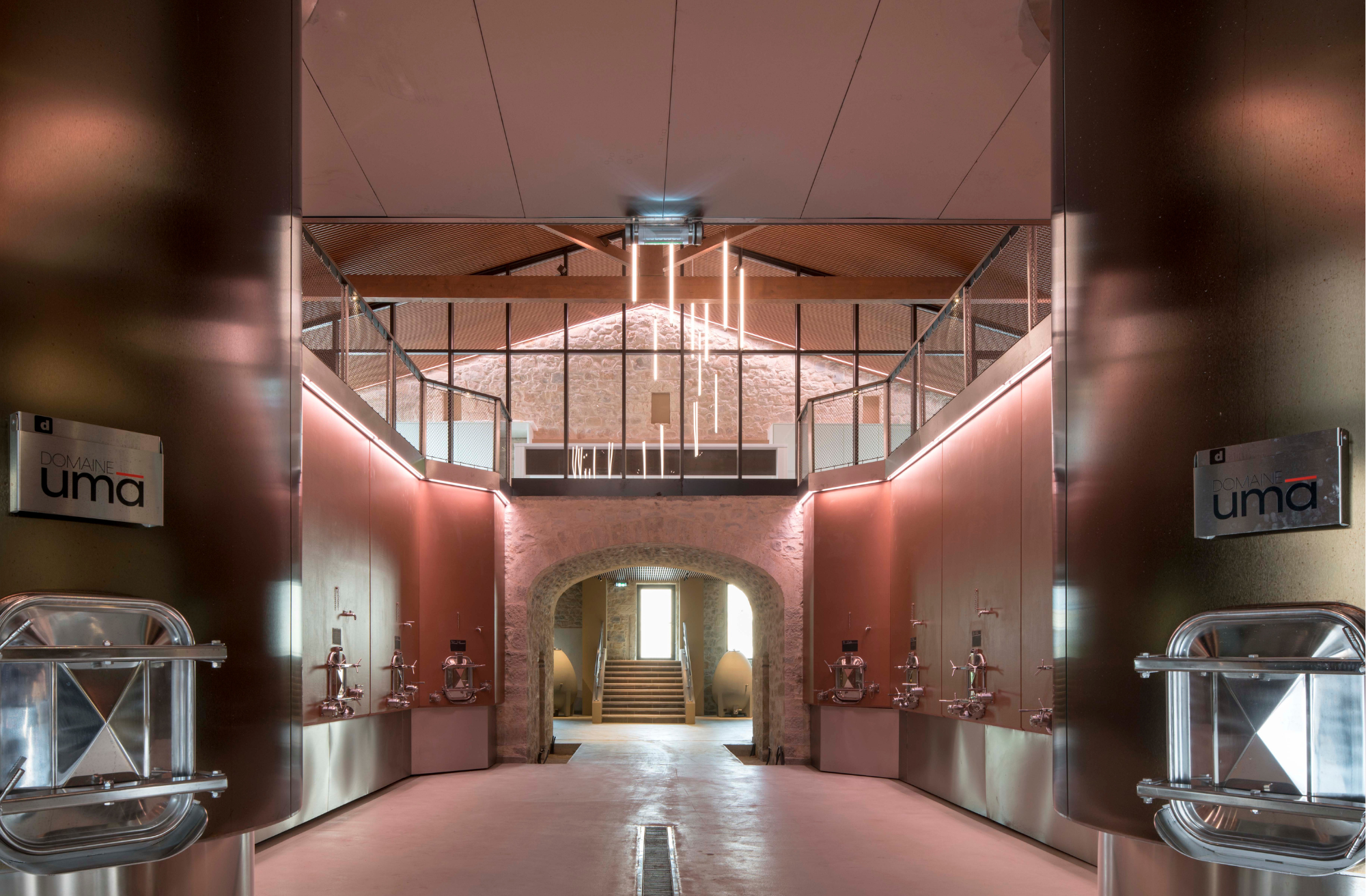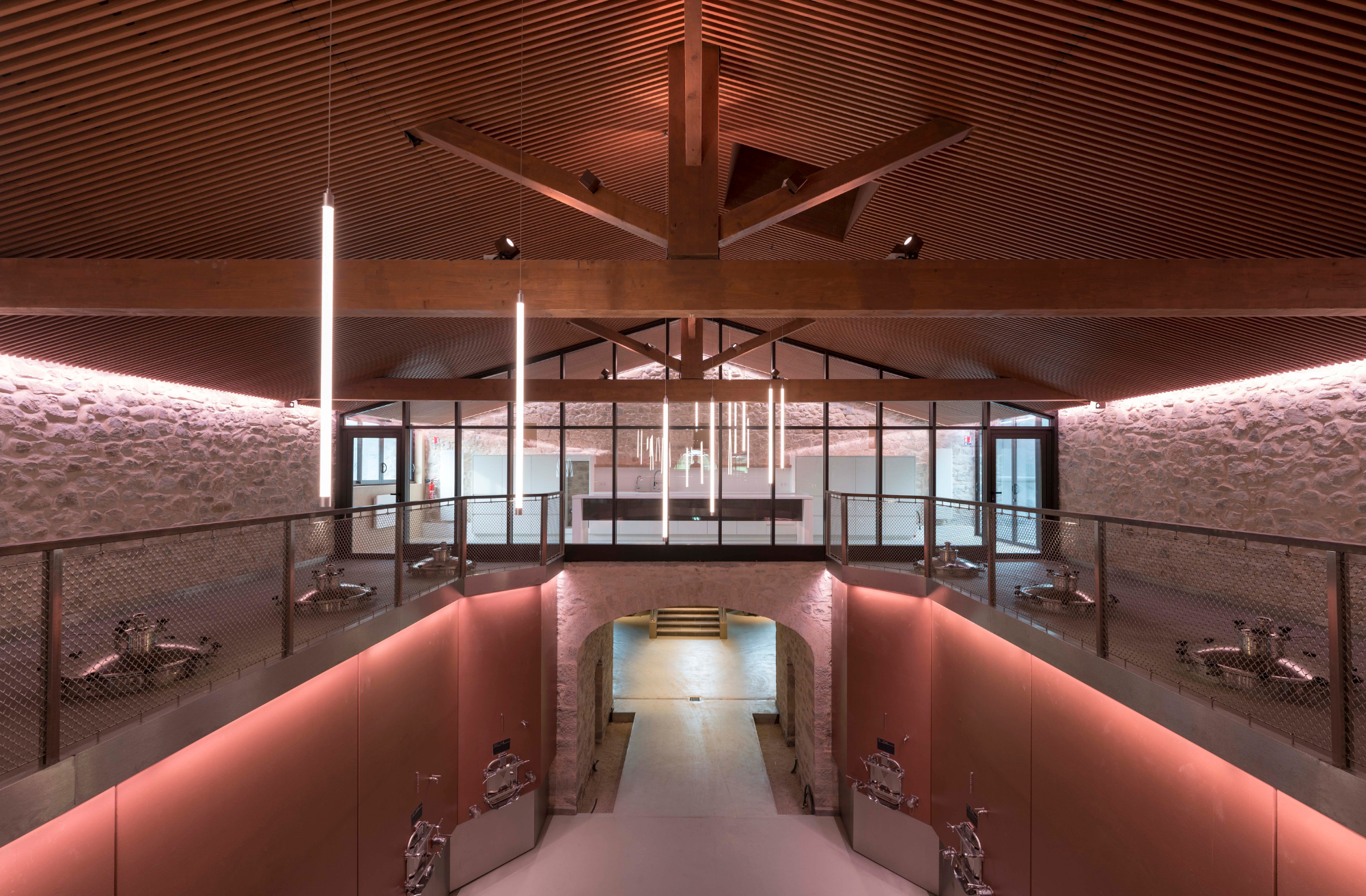 Thus, some linear fixtures underline the geometric shape of the space with a grazing lighting on the stone walls of the mezzanine and the concrete wine sats on the ground floor.