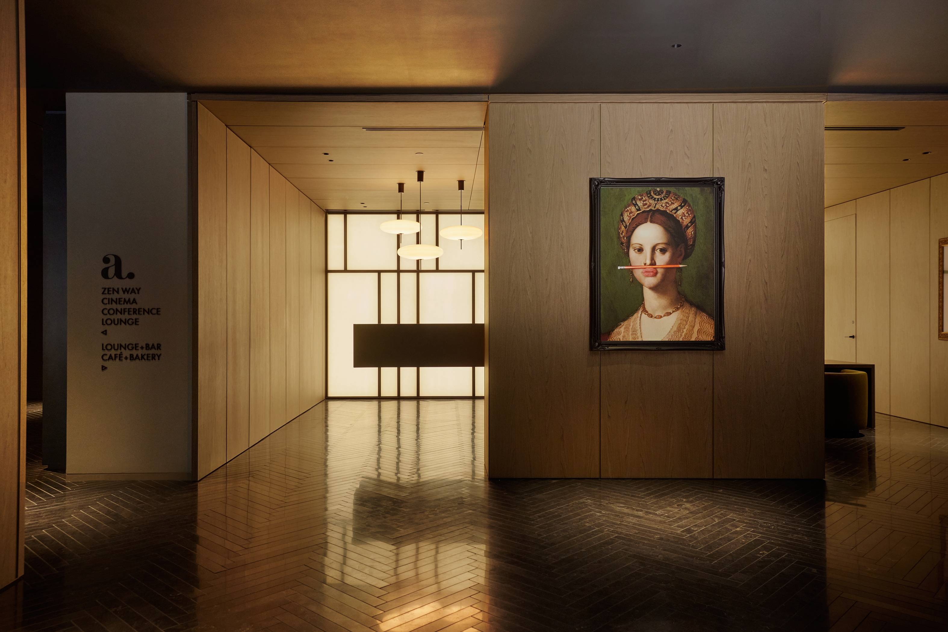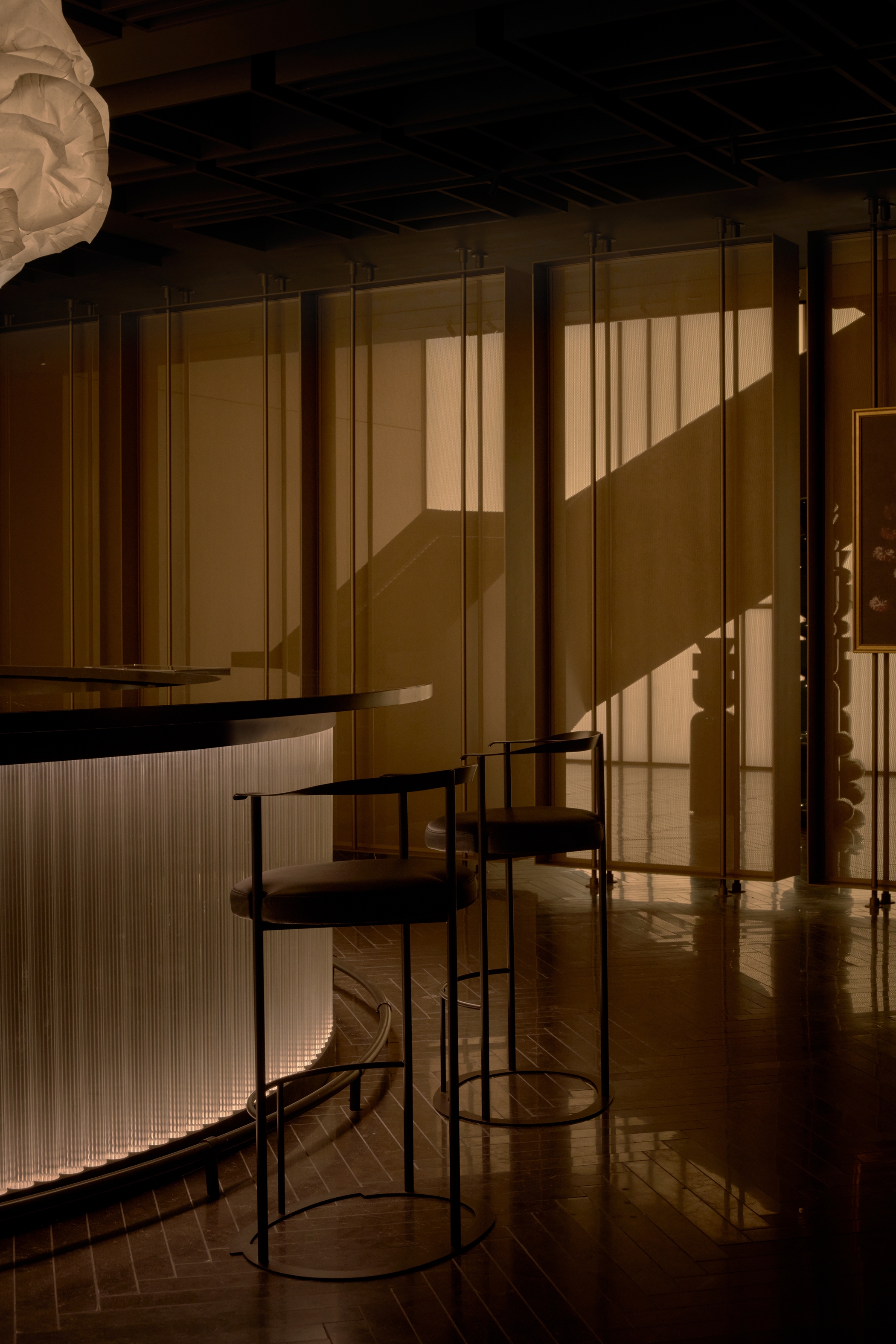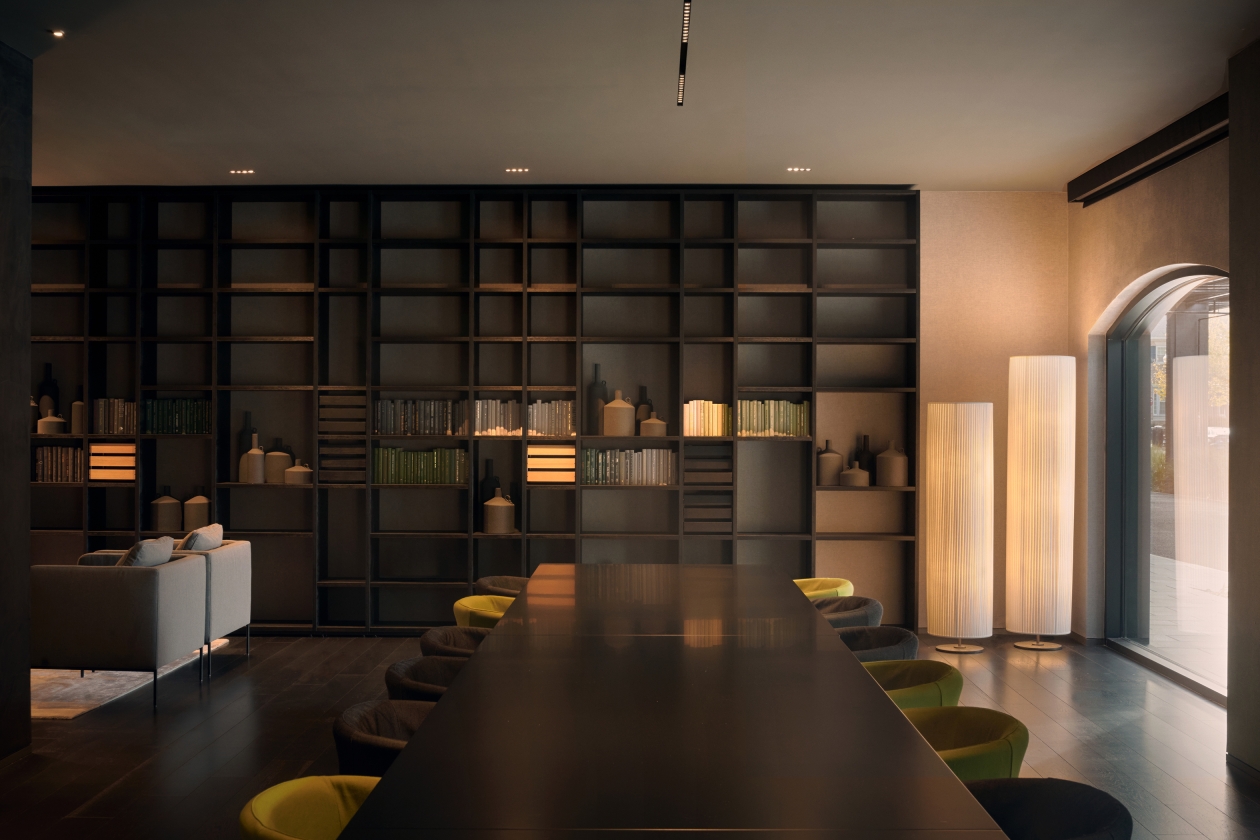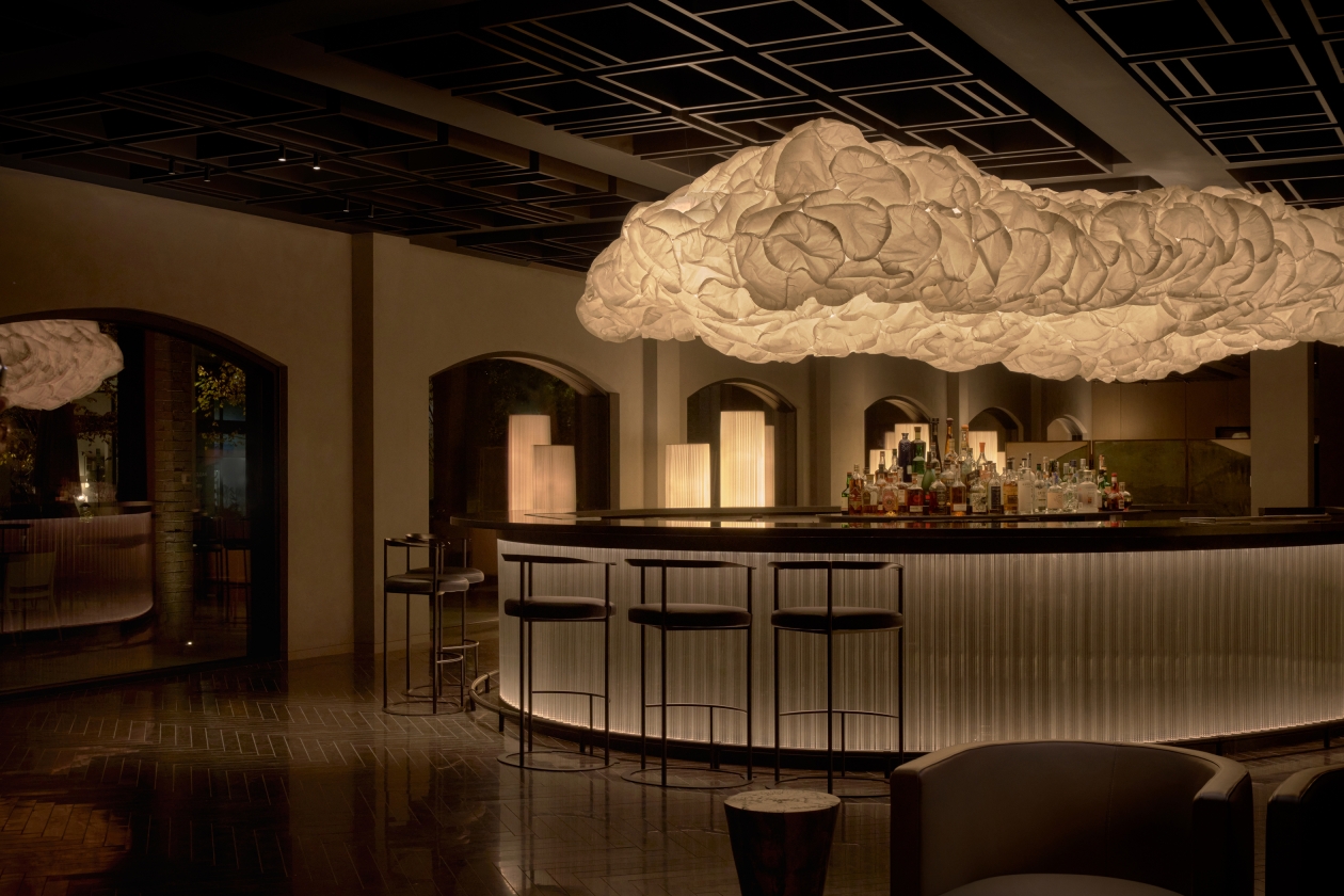 The lighting harmonizes with Lissoni’s interiors, which take inspiration from elements of Japanese and Scandinavian design. In the reception area, an illuminated shoji screen wall makes a dramatic backdrop for a sculptural steel staircase. Adjacent lounge spaces convey an intimate atmosphere, reminiscent of a clubhouse or the private rooms of the colonial-style mansions of historic Old Town, while still expressing a contemporary mood.
