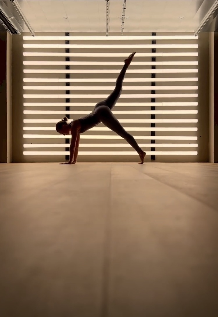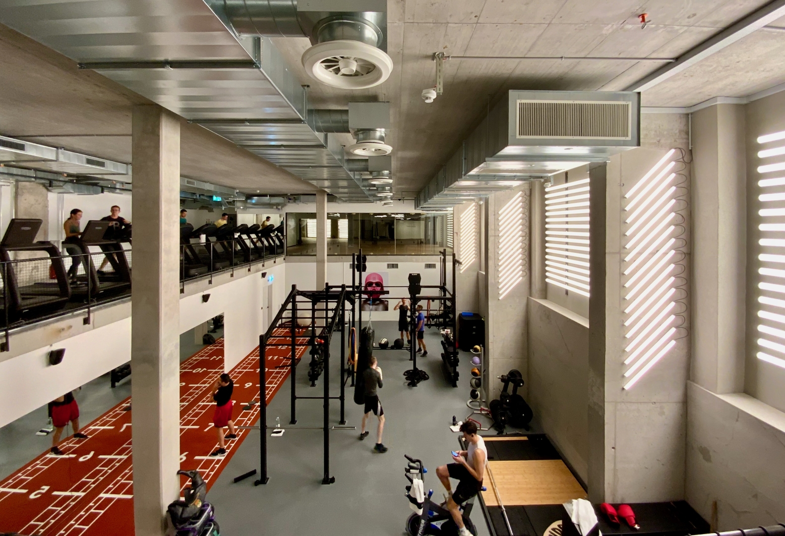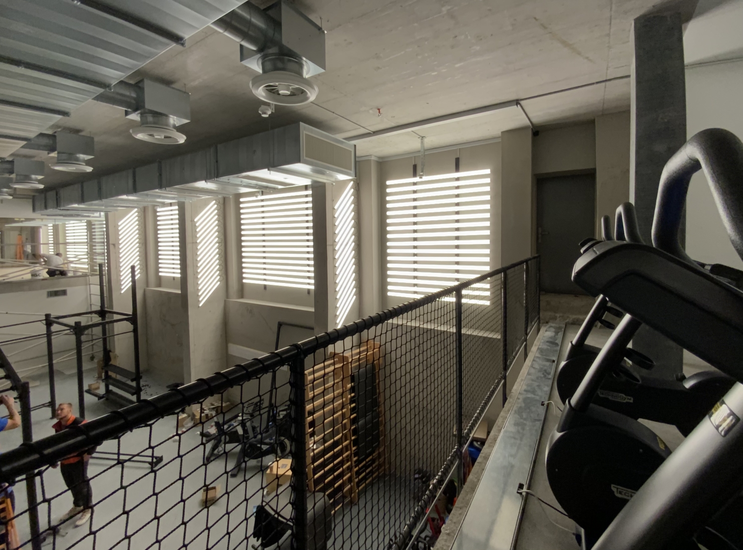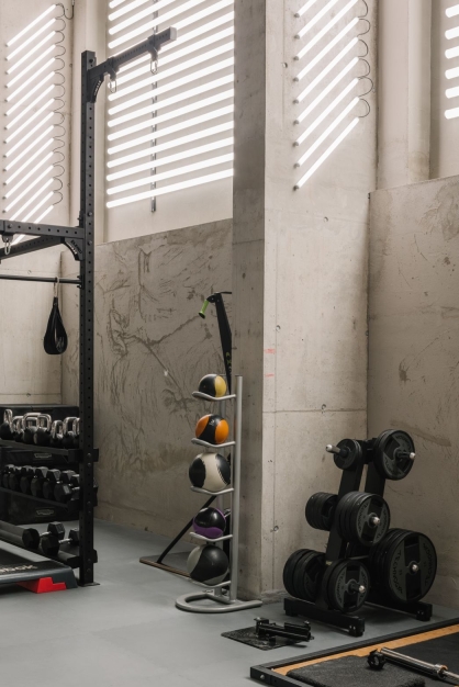 Lucespazio developed a retro-futuristic fake window front, resembling the effect of daylight falling through half-closed Venetian blinds for a double-height, concrete brute workout room without access to daylight.